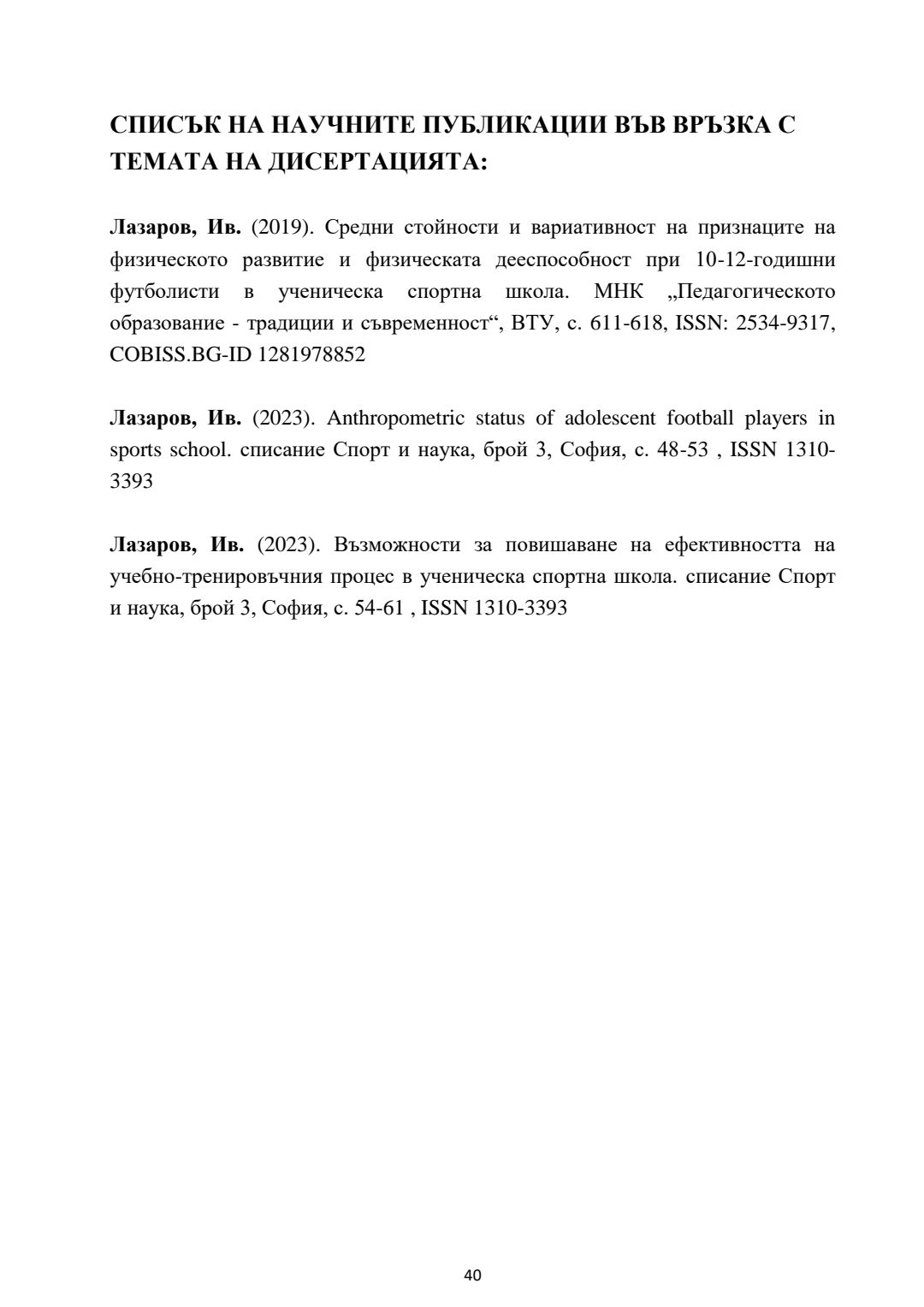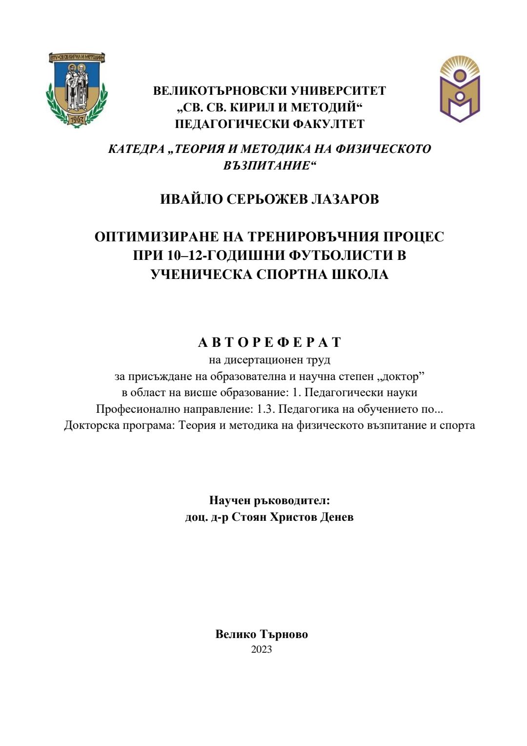 Оптимизиране на тренировъчния процес при 10-12-годишни футболисти в ученическа спортна школа : Автореферат / Ивайло Лазаров ; Науч. ръководител Стоян Денев