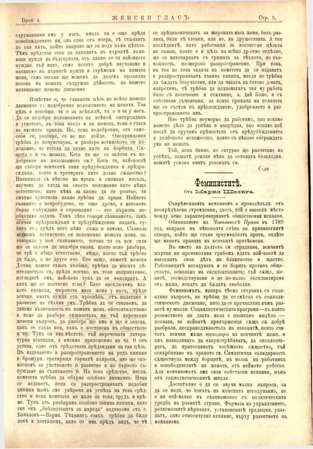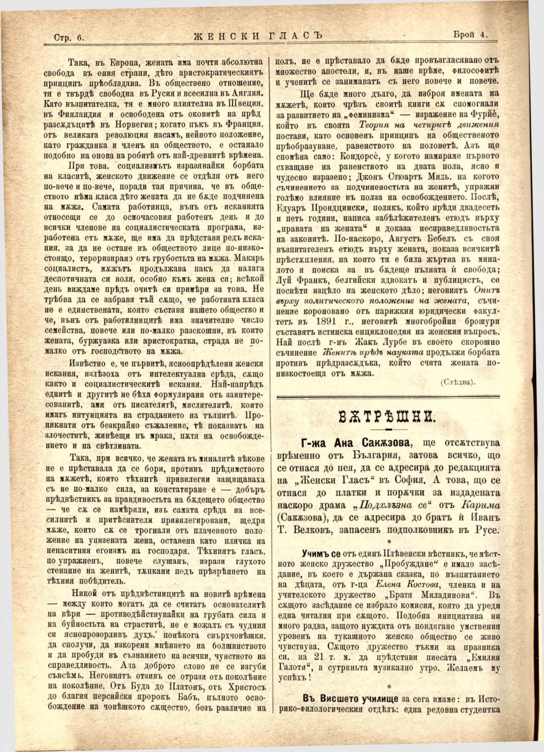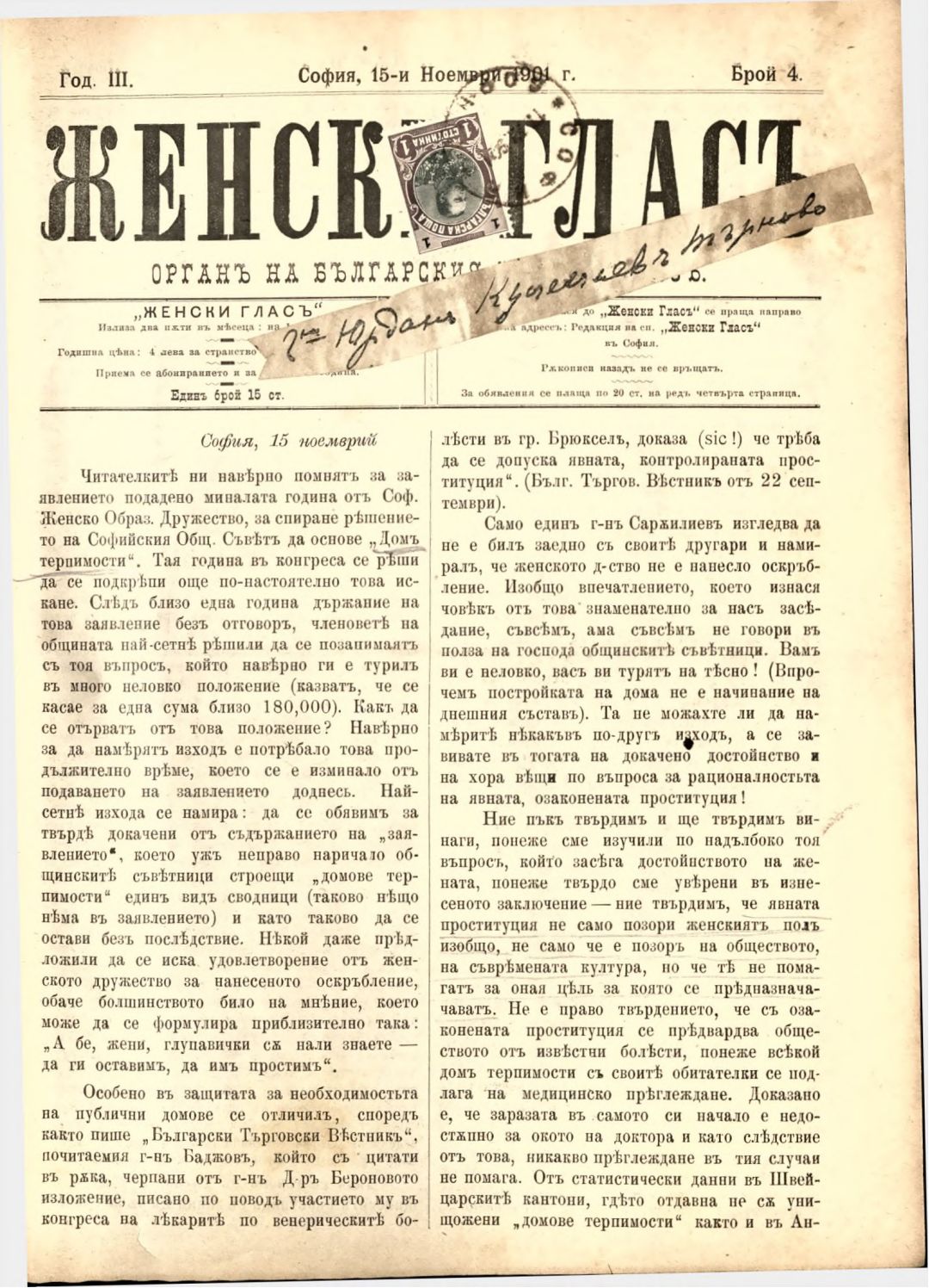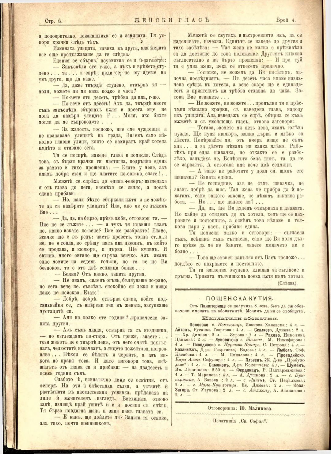 Год. 3, № 4. Женски глас : Орган на българския женски съюз