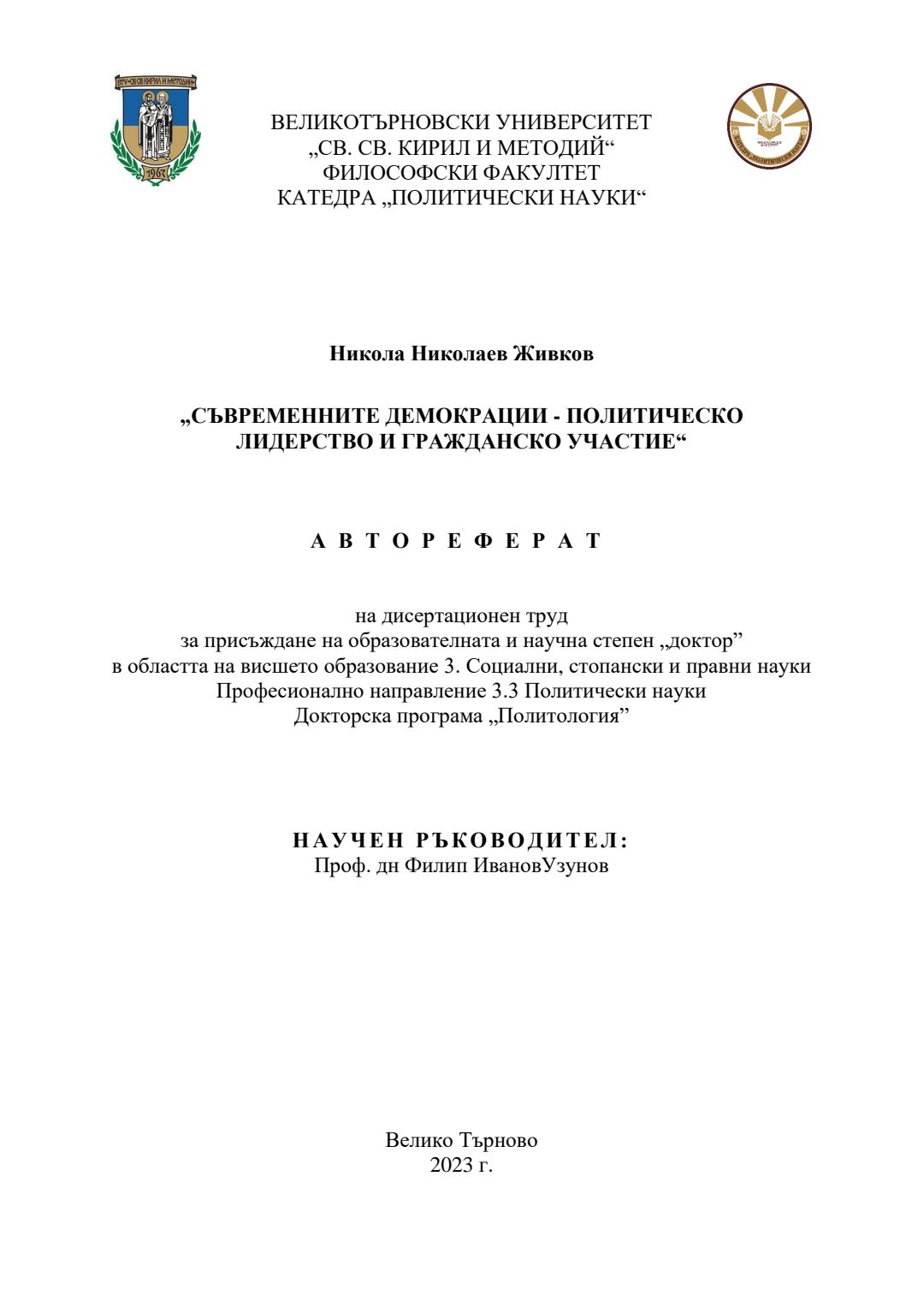 Съвременните демокрации - политическо лидерство и гражданско участие : Автореферат / Никола Николаев Живков ; Науч. ръководител Филип Узунов