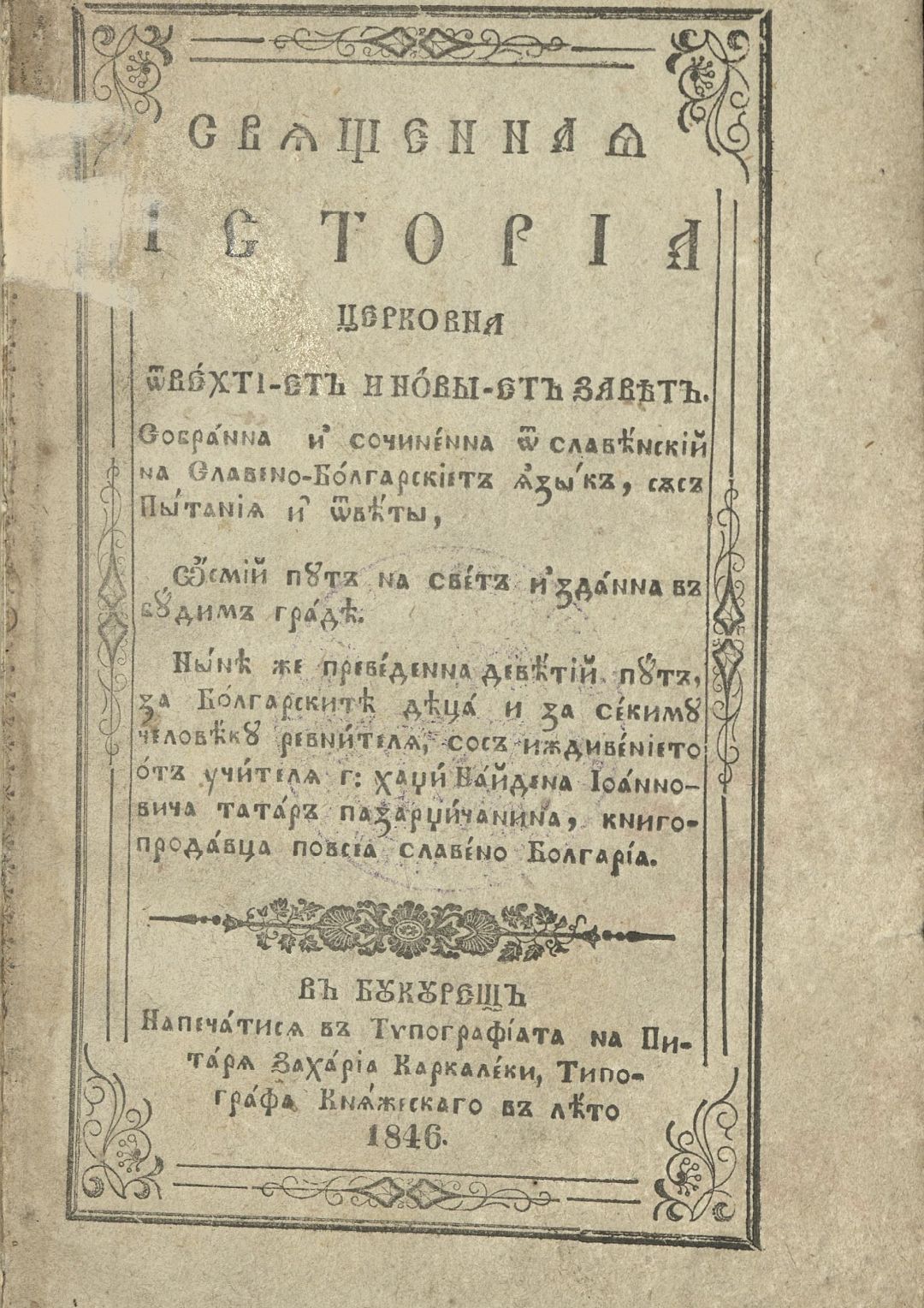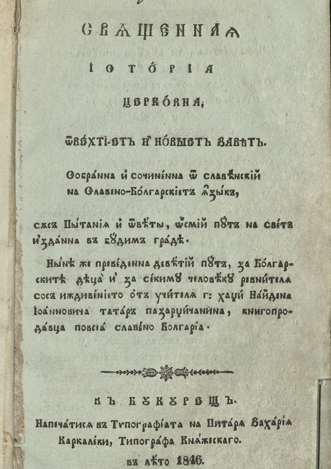 Священная история церковна от Ветхиет и Новиет завет : Собрана и сочинена от славенский на славеноболгарският язик с питания и ответи, осмий пут на свет издана в Будим граде ; Нине же преведена деветий пут за болгарските деца и за секиму человеку ревнителя сос иждивението от учителя г. хаджи Найдена ....