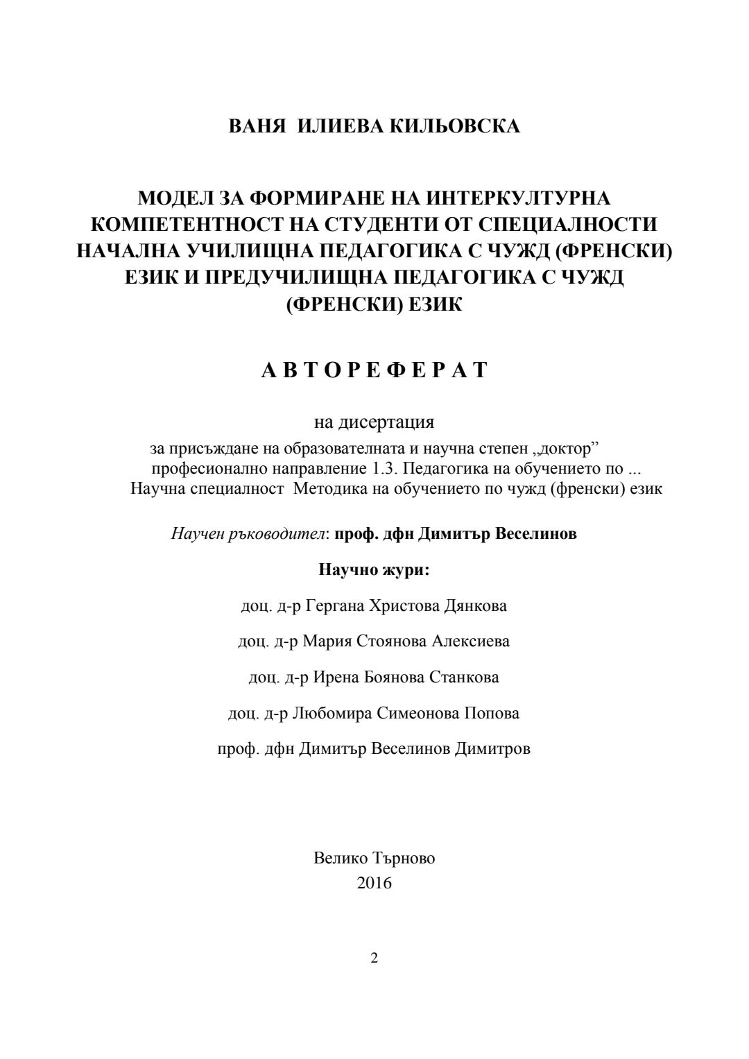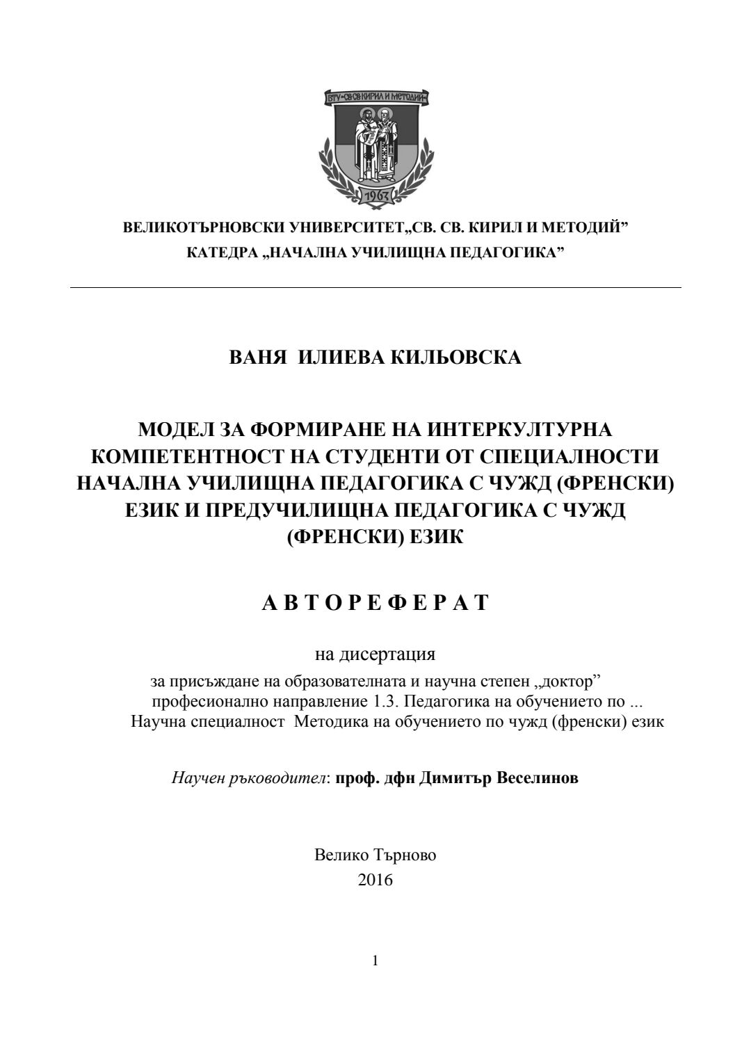 Модел за формиране на интеркултурна компетентност на студенти от специалности Начална училищна педагогика с чужд (френски) език и Предучилищна педагогика с чужд (френски) език : Автореферат / Ваня Илиева Кильовска ; Науч. ръководител Димитър Веселинов