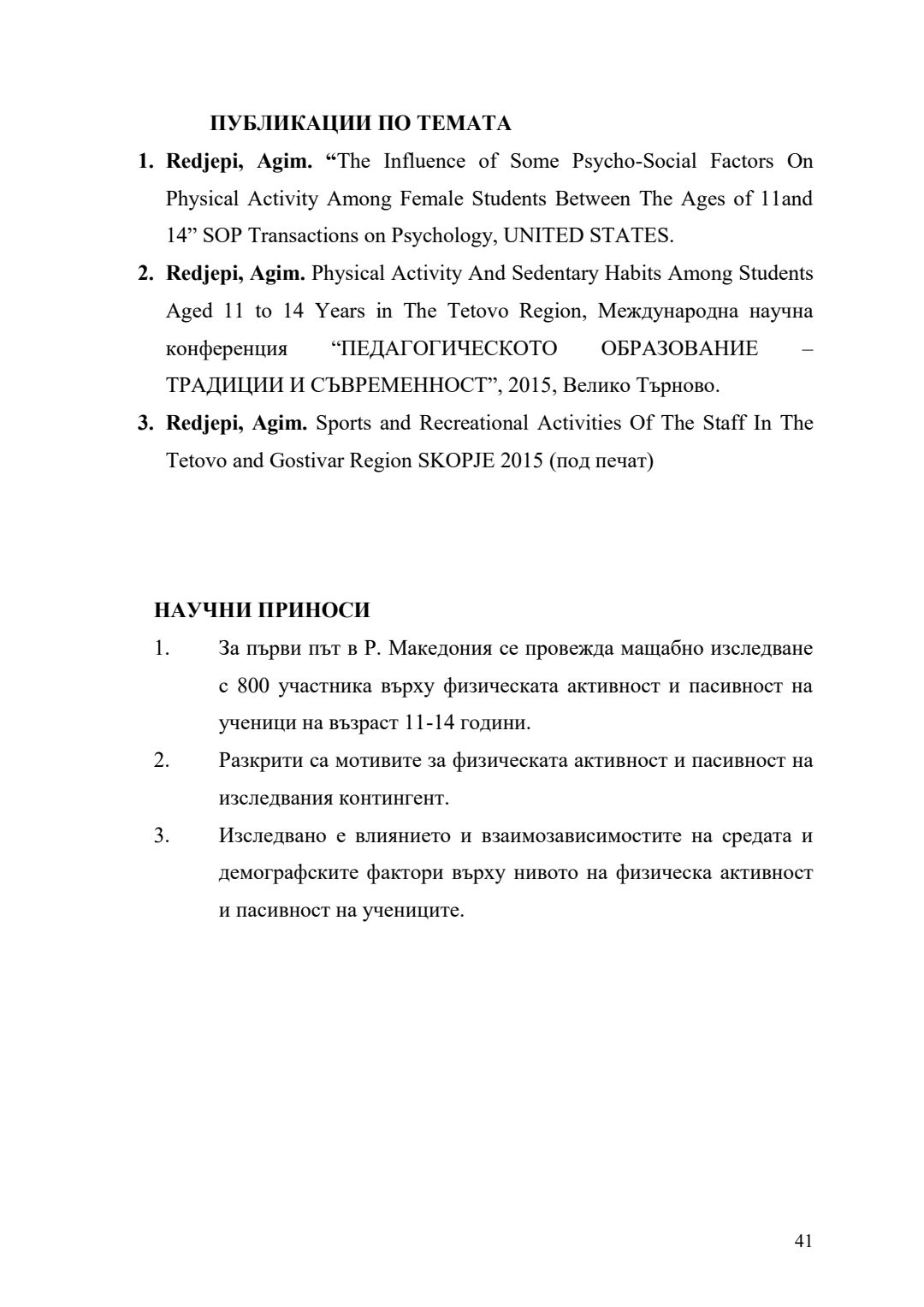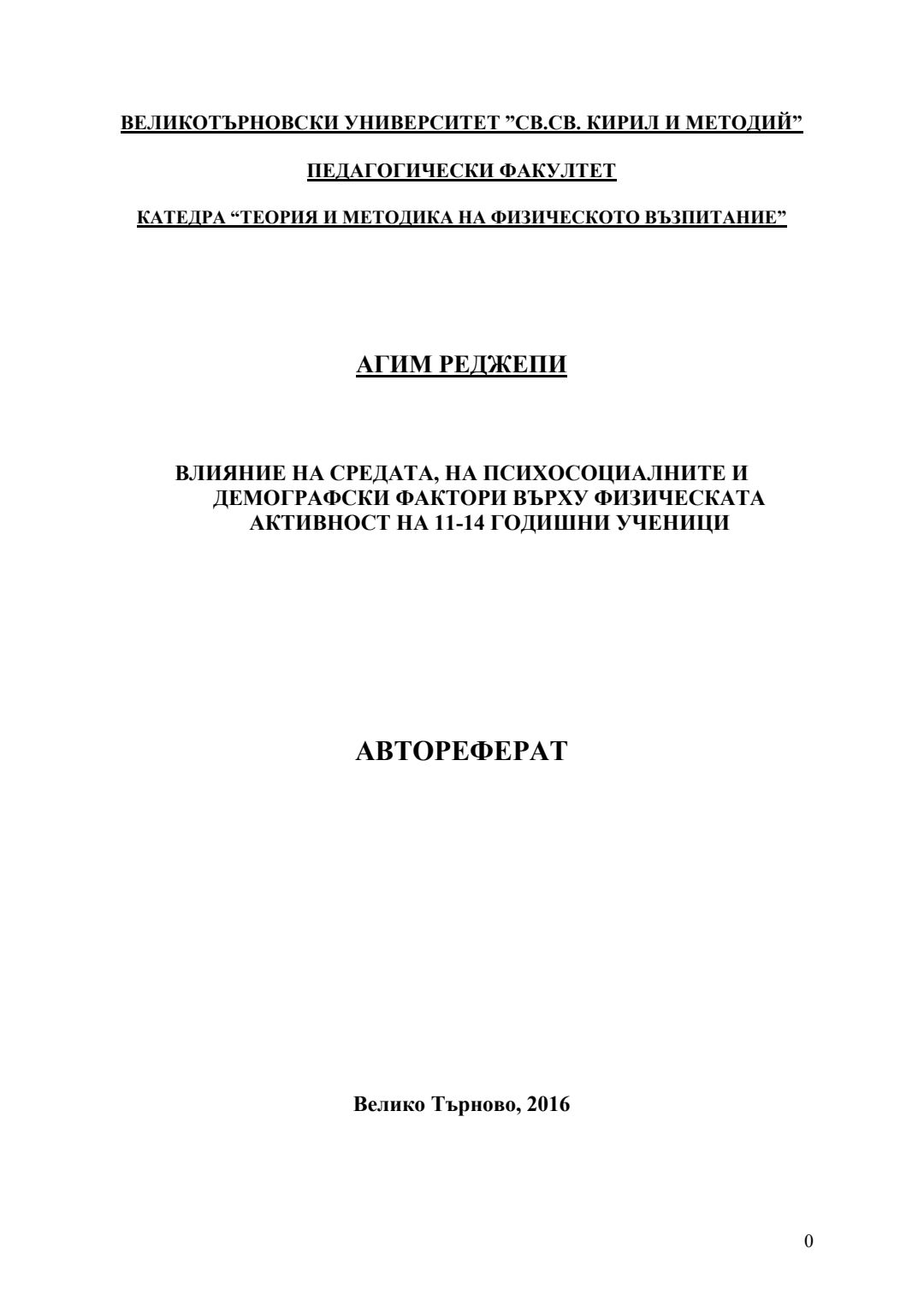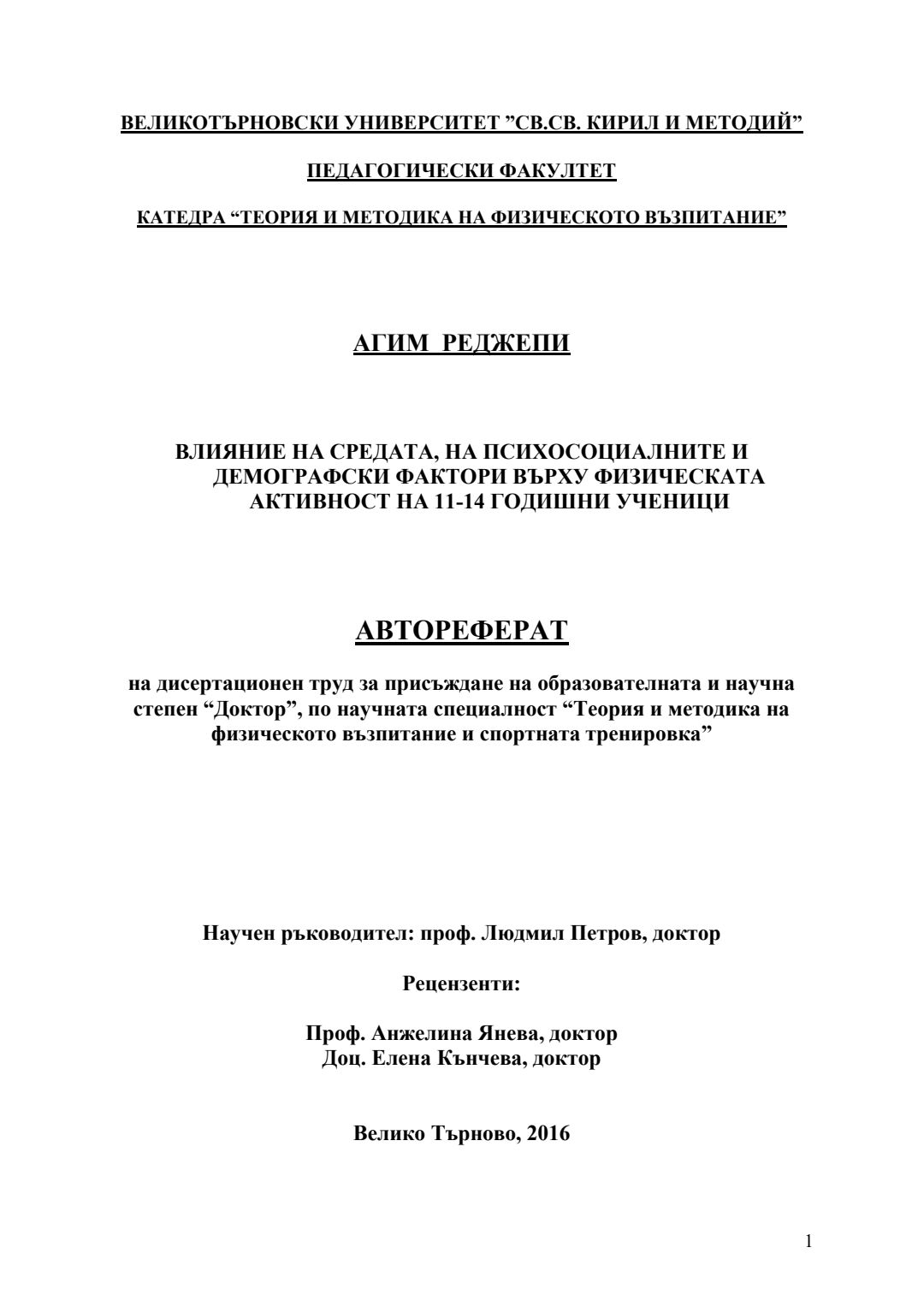 Влияние на средата, на психосоциалните и демографски фактори върху физическата активност на 11-14 годишни ученици : Автореферат / Агим Реджепи ; Науч. ръководител Людмил Петров