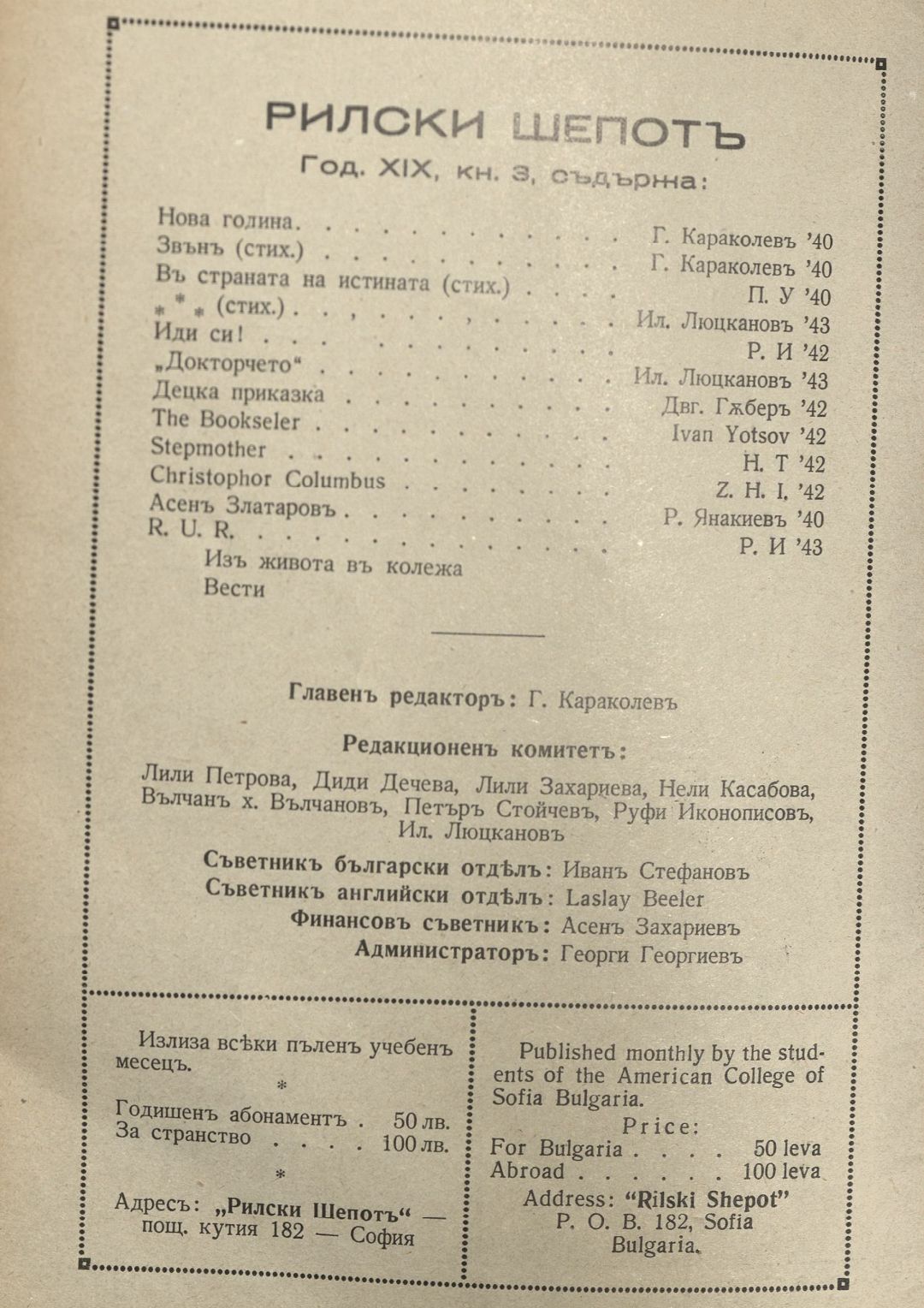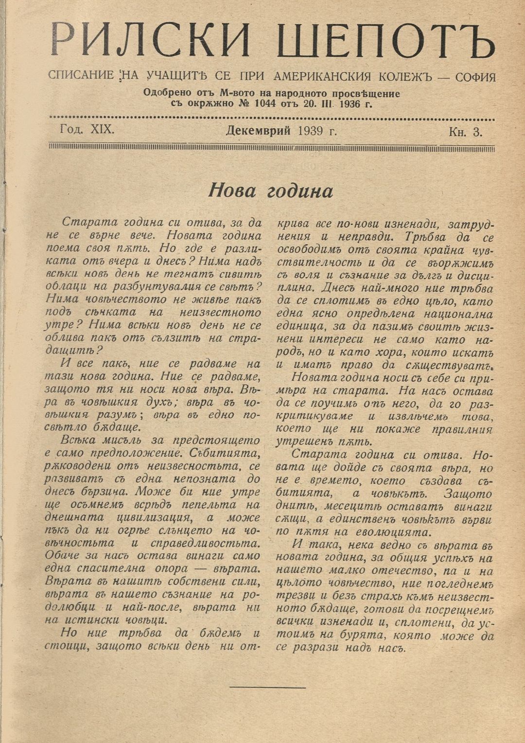 Год. 19, Кн.3. Рилски шепот : Орган на учащите се при Американския колеж - София / Американски колеж - София