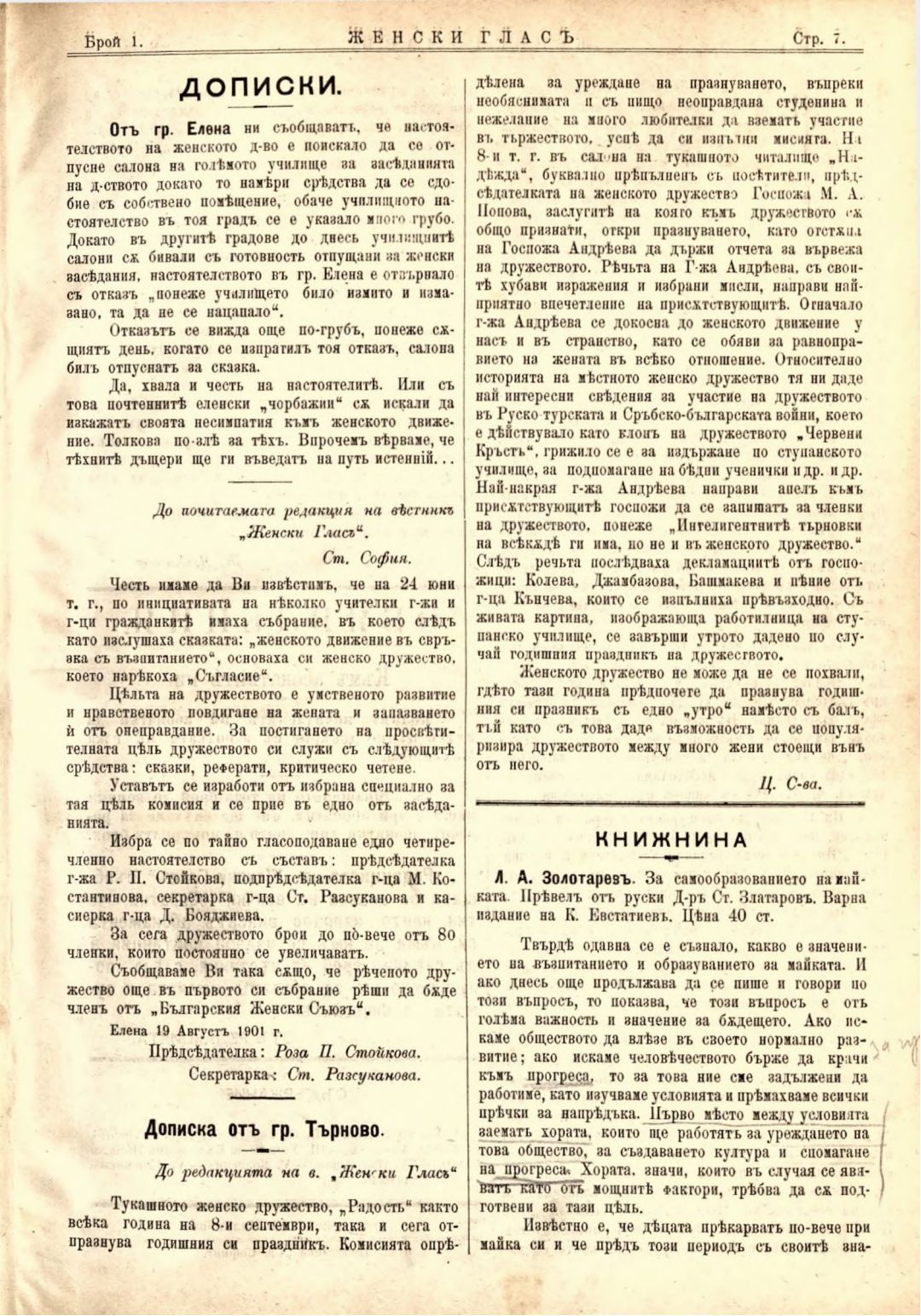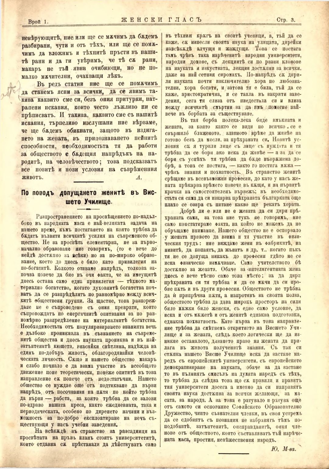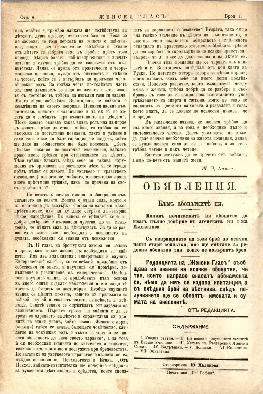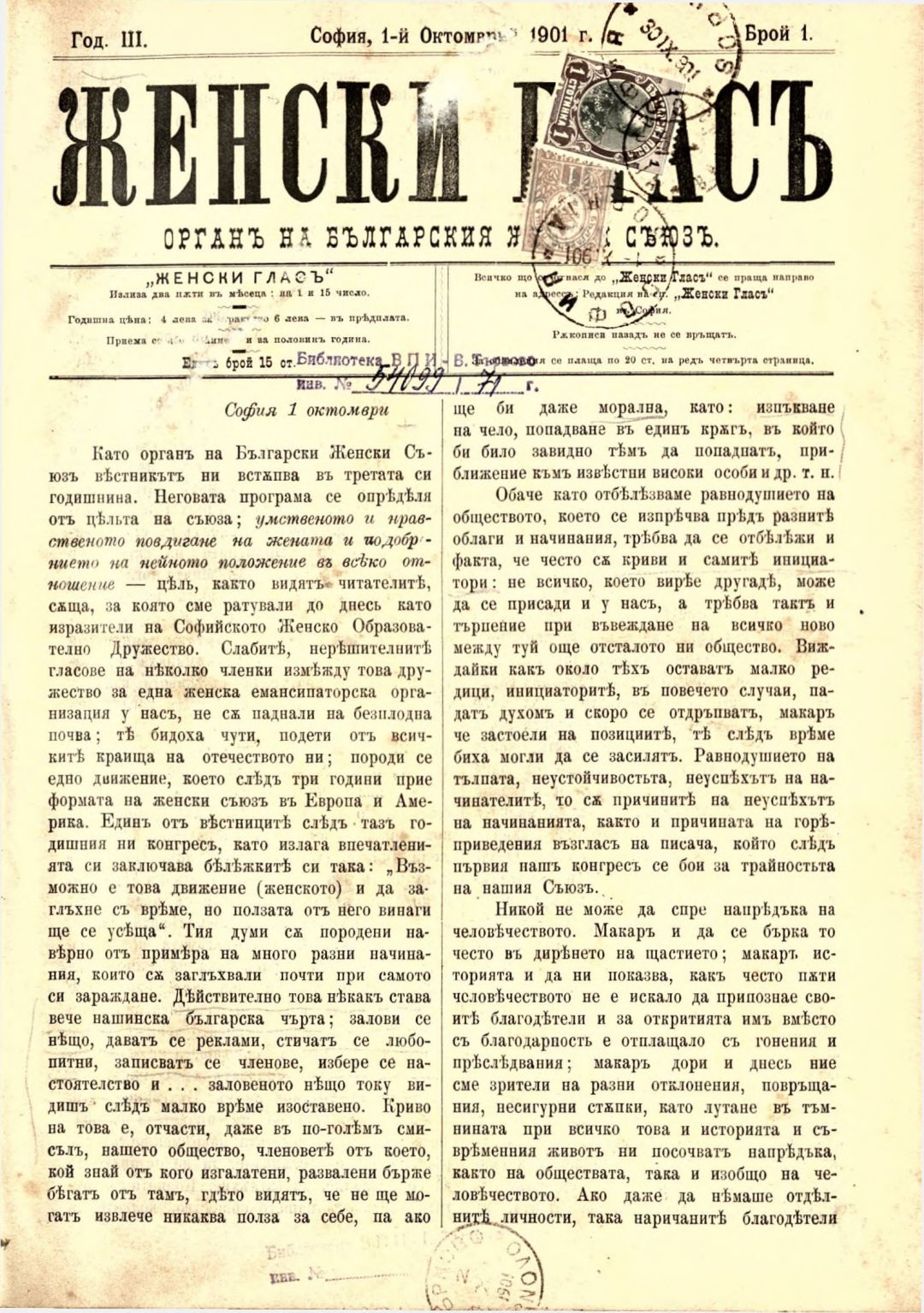 Год. 3, № 1. Женски глас : Орган на българския женски съюз