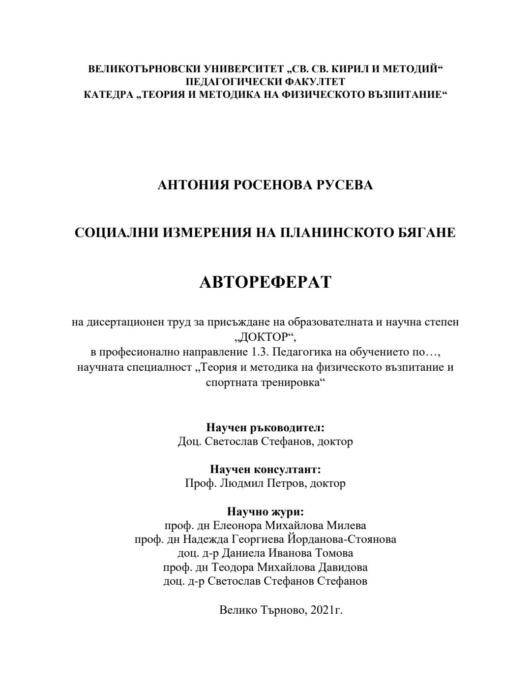 Социални измерения на планинското бягане : Автореферат / Антония Росенова Русева ; Науч. ръководител Светослав Стефанов