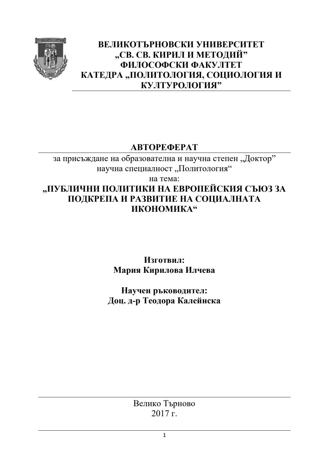 Публични политики на Европейския съюз за подкрепа и развитие на социалната икономика : Автореферат/ Мария Кирилова Илчева ; Науч. ръководител: Теодора Калейнска