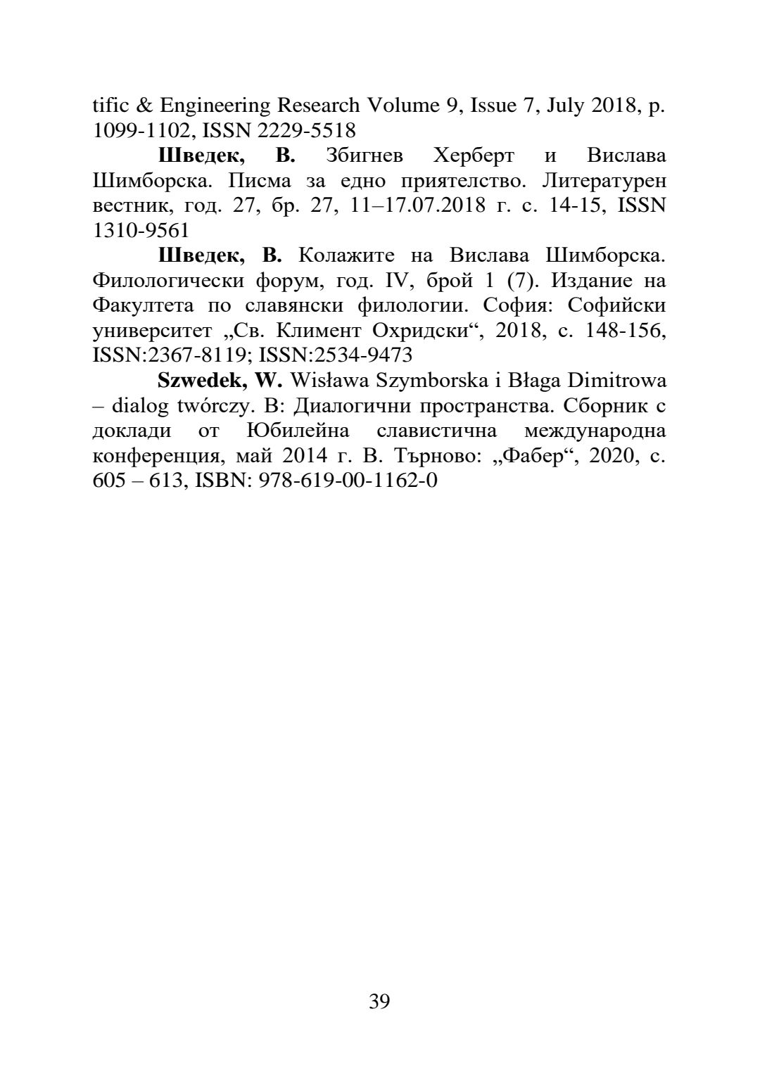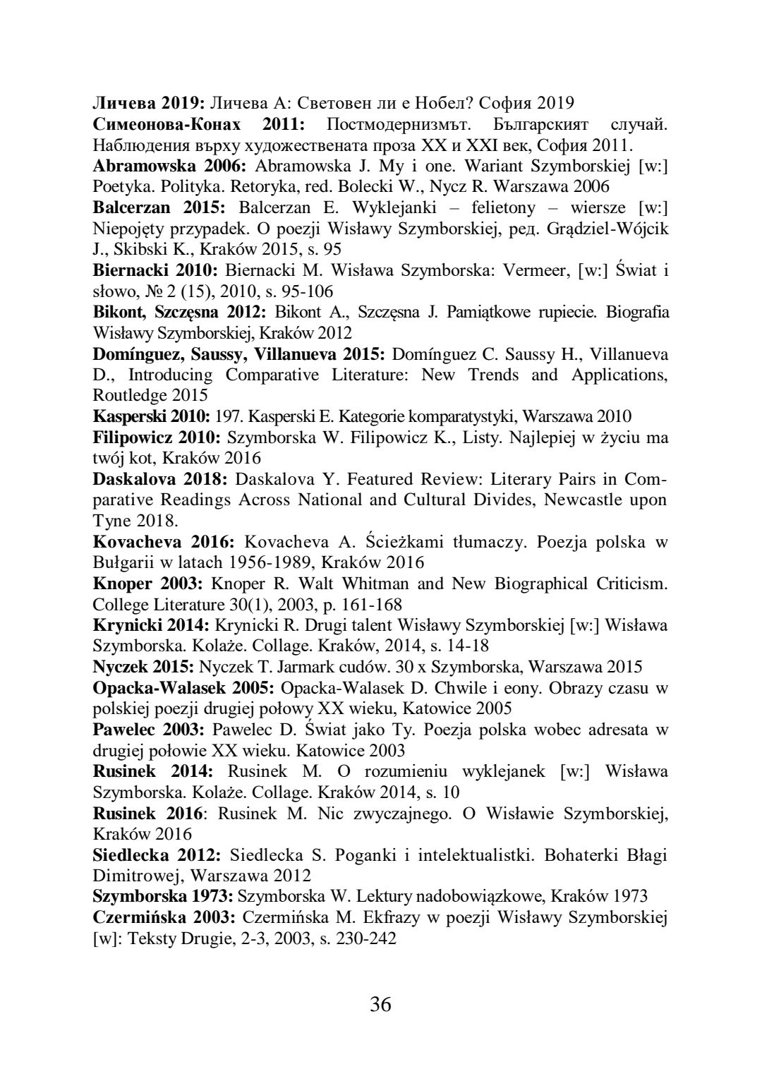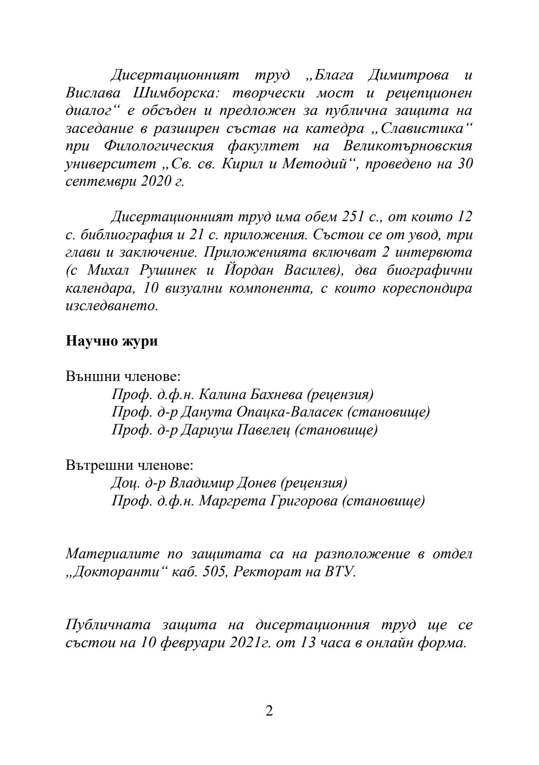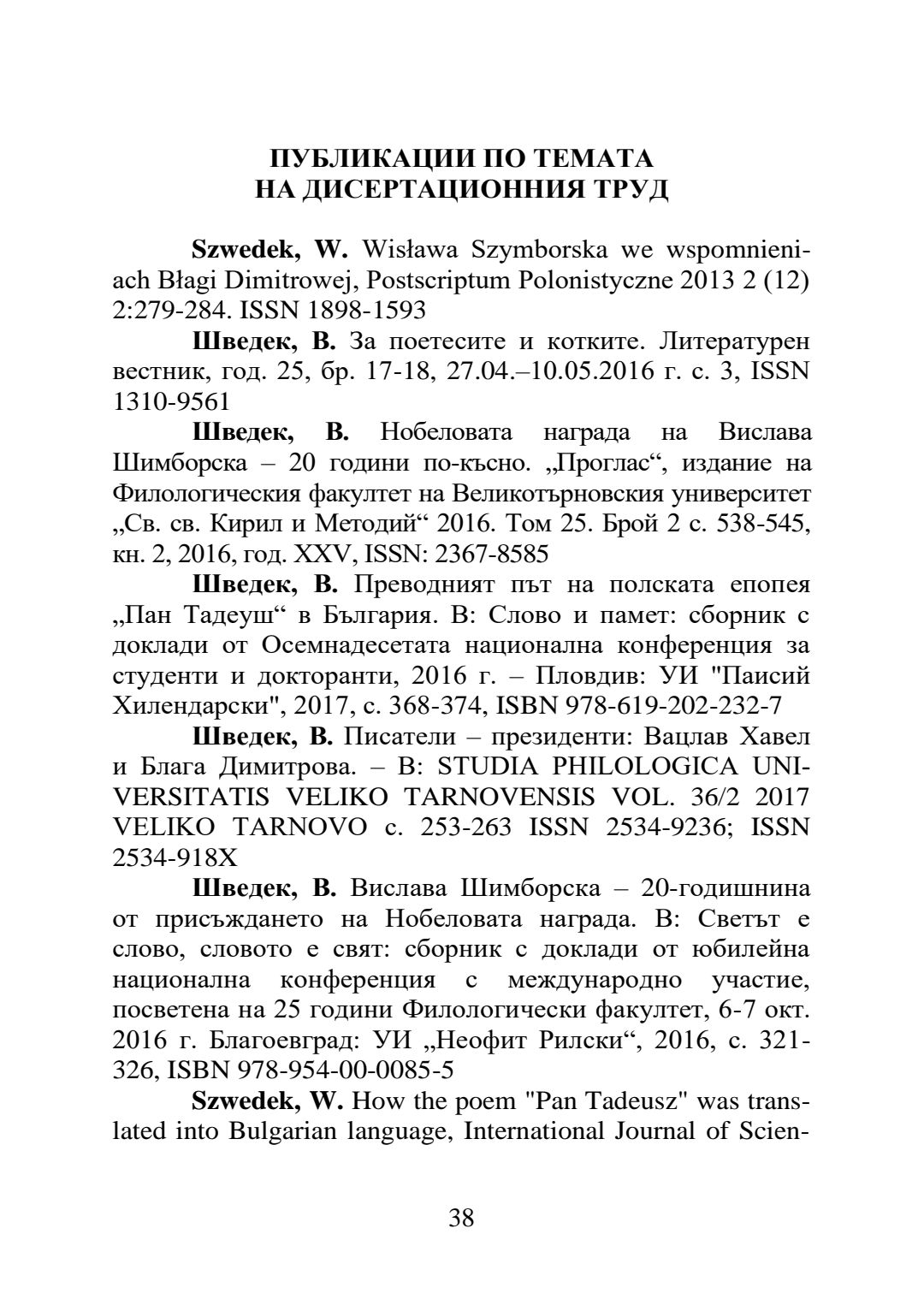 Блага Димитрова и Вислава Шимборска: творчески мост и рецепционен диалог : Автореферат / Вероника Шведек ; Науч. ръководител Маргрета Любомирова Григорова