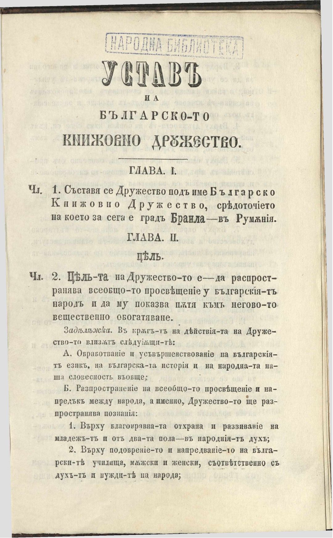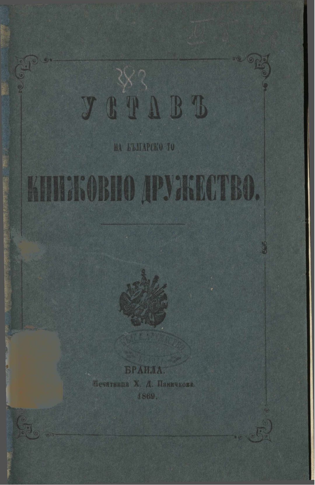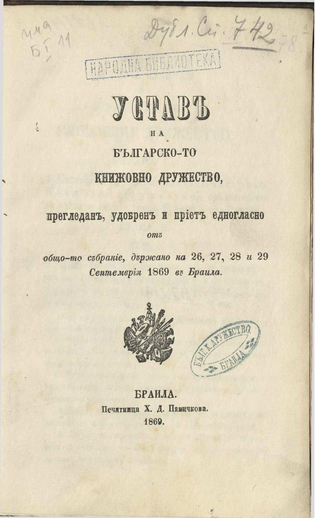 Устав на Българското книжовно дружество, прегледан, одобрен и приет едногласно от общото събрание, държано на 26, 27, 28 и 29 септемврия 1869 в Браила