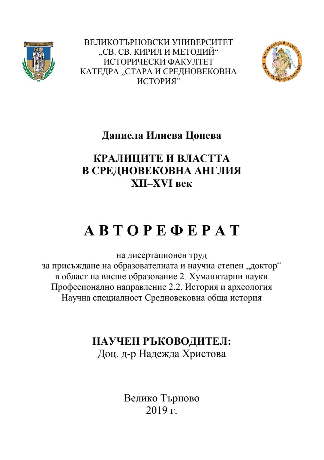 Кралиците и властта в средновековна Англия XII-XVI в. : Автореферат / Даниела Илиева Цонева ; Науч. ръководител Надежда Христова