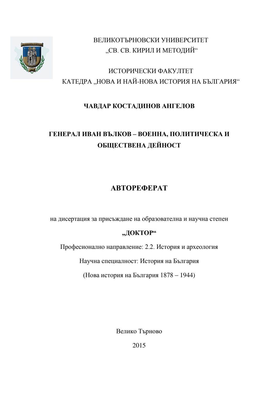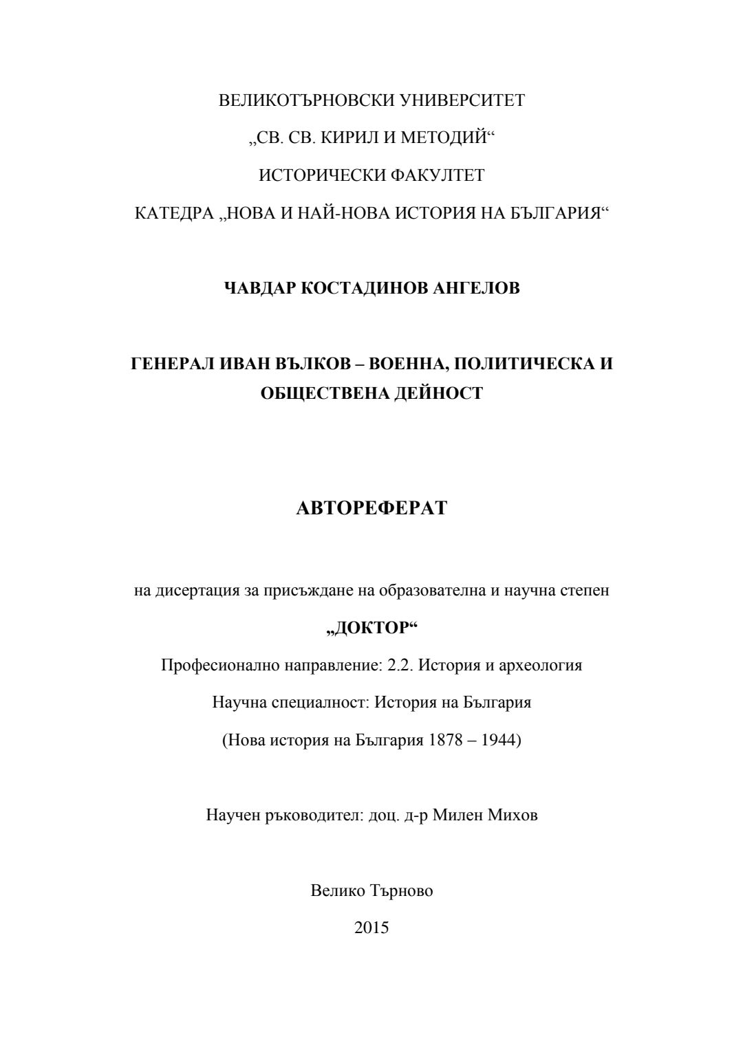 Генерал Иван Вълков - военна, политическа и обществена дейност / Чавдар Костадинов Ангелов ; Науч. ръководител Милен Михов