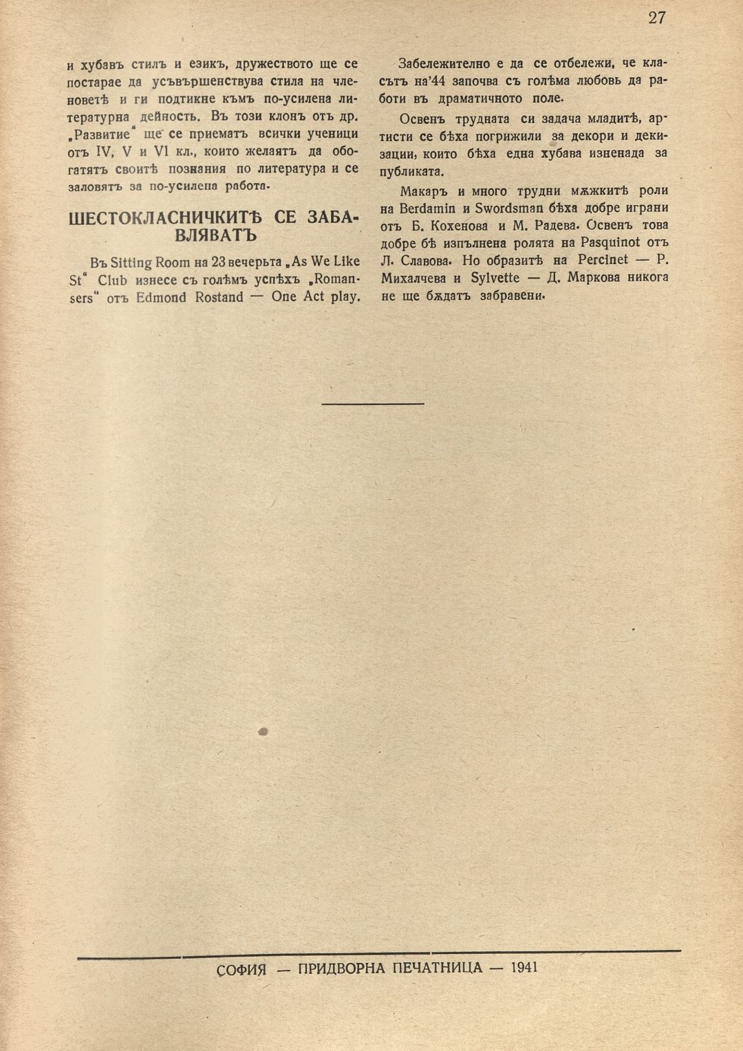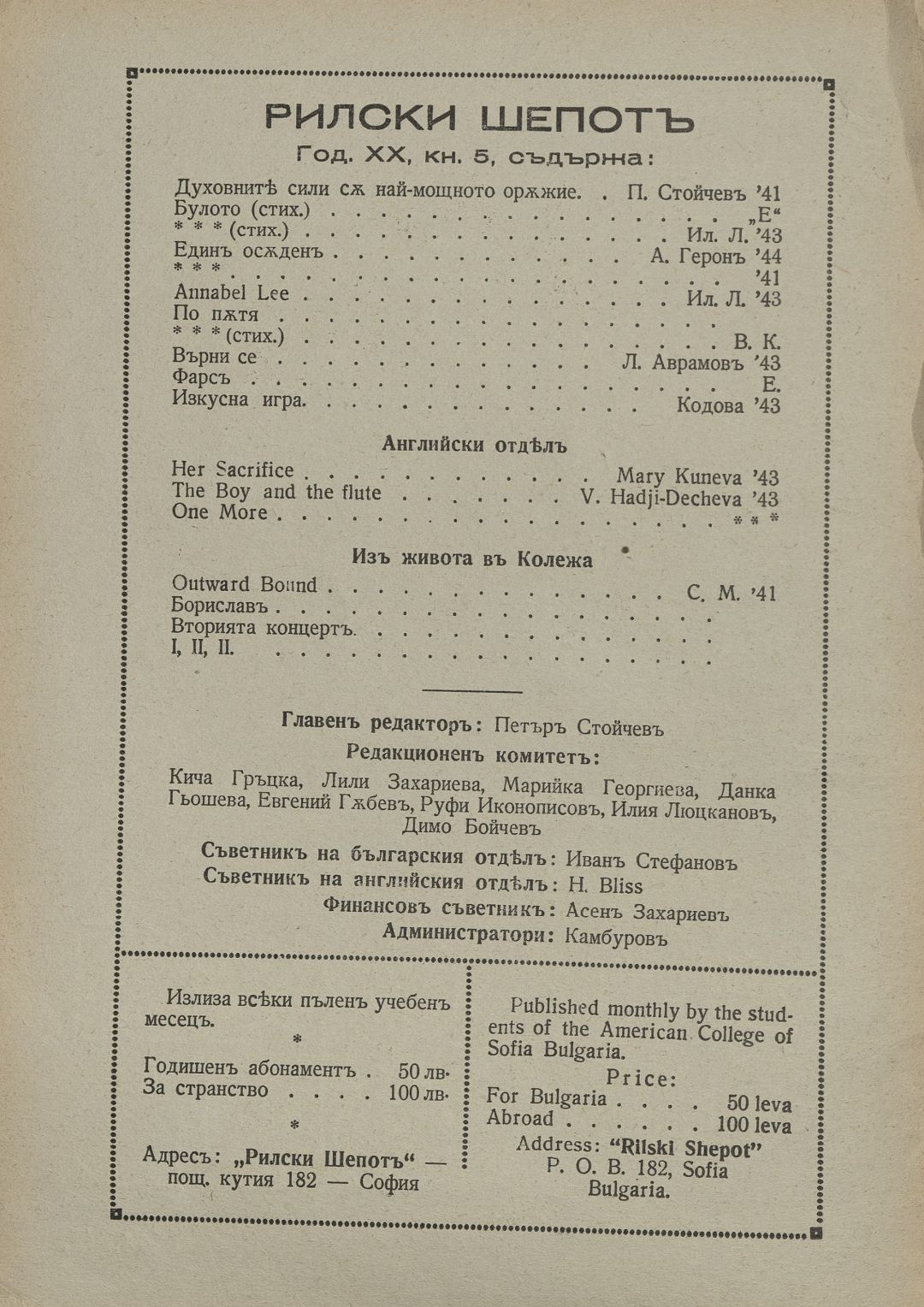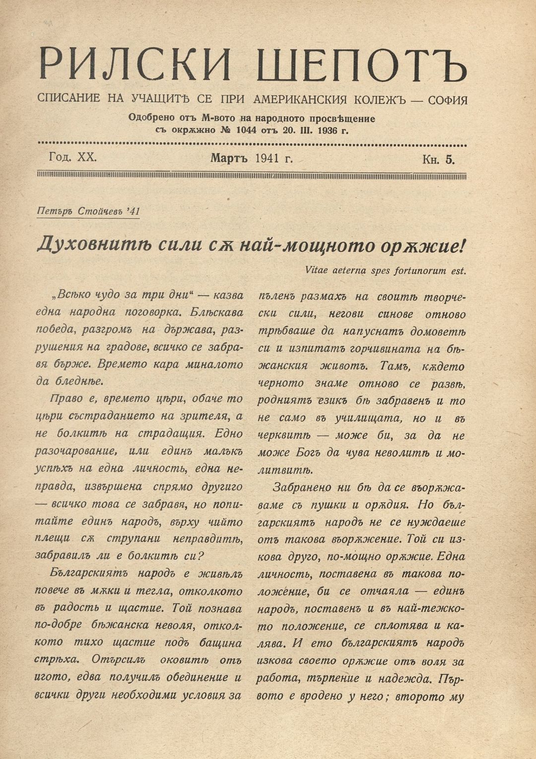 Год. 20, Кн.5. Рилски шепот : Орган на учащите се при Американския колеж - София / Американски колеж - София