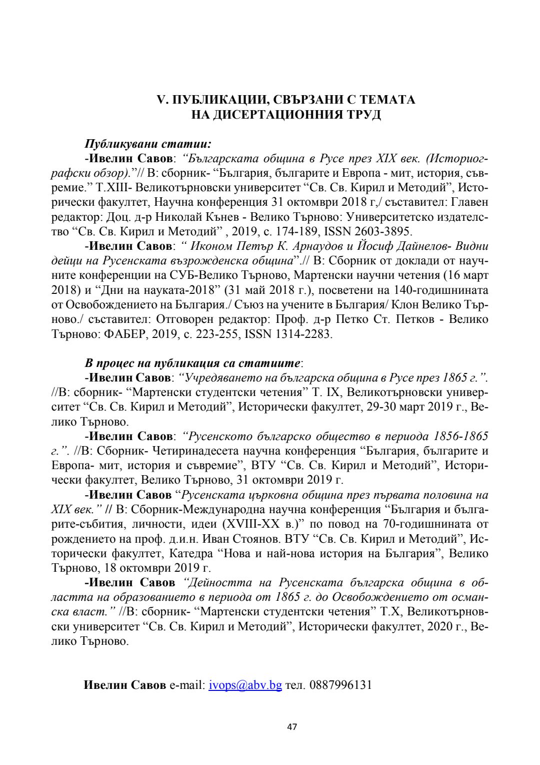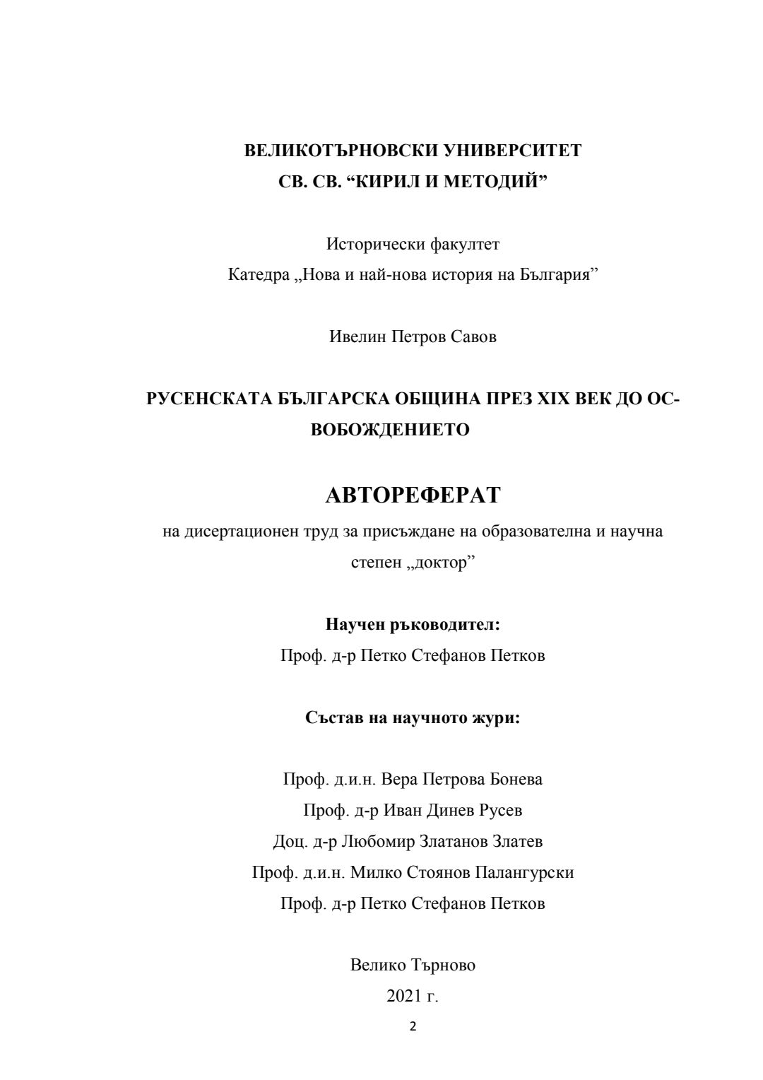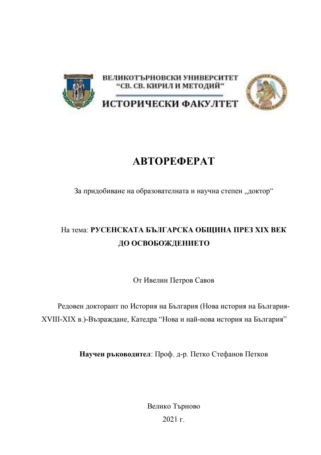 Русенската българска община през XIX век до Освобождението : Автореферат / Ивелин Петров Савов ; Науч. ръководител Петко Стефанов Петков