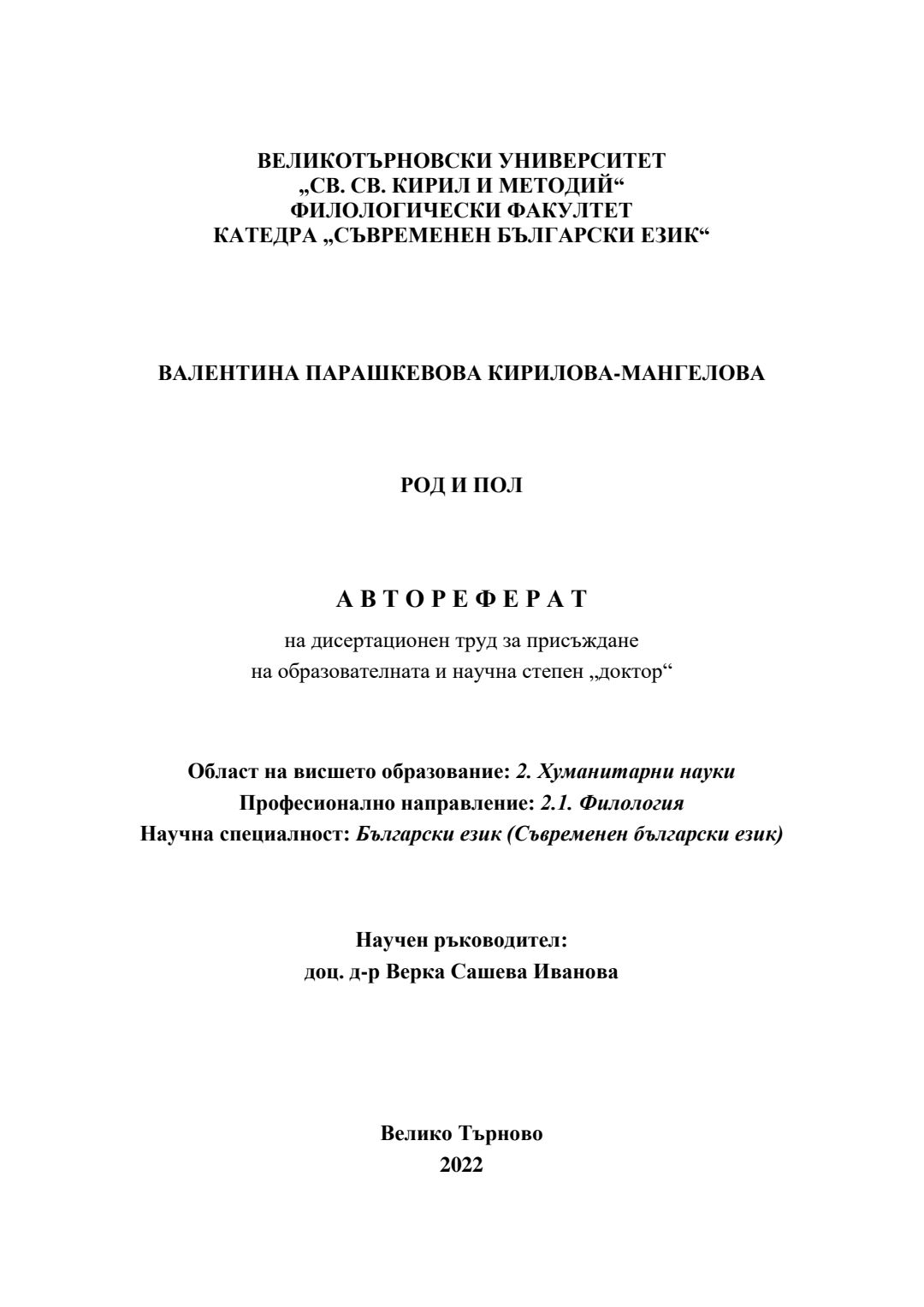 Род и пол : Автореферат / Валентина Парашкевова Кирилова-Мангелова ; Науч. ръководител Верка Сашева