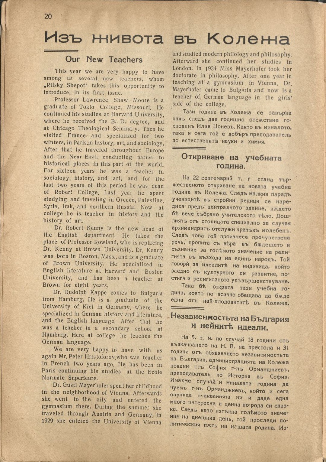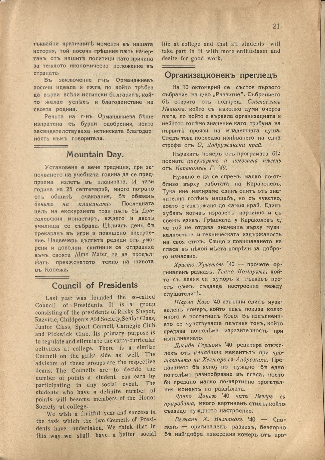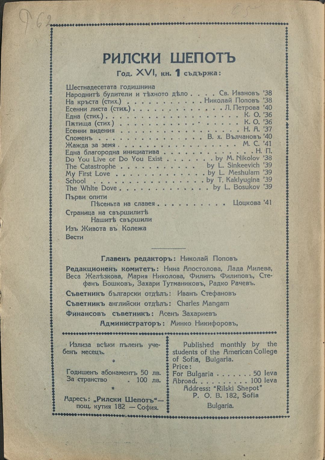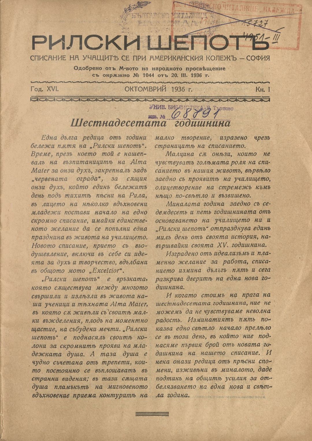 Год. 16, Кн. 1. Рилски шепот : Орган на учащите се при Американския колеж - София / Американски колеж - София