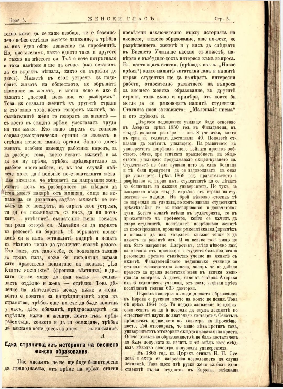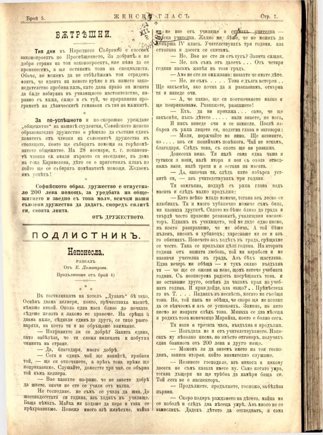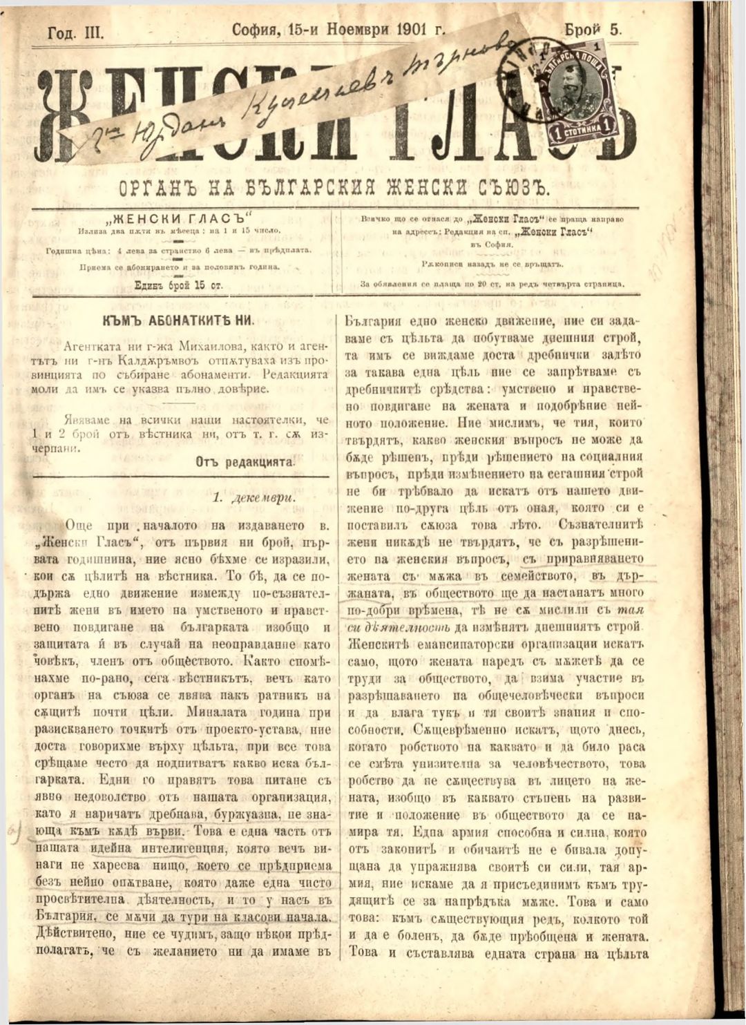Год. 3, № 5. Женски глас : Орган на българския женски съюз