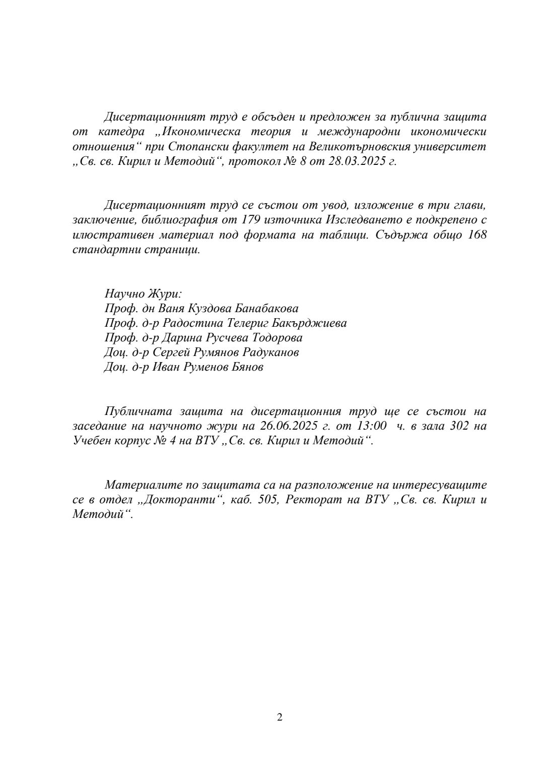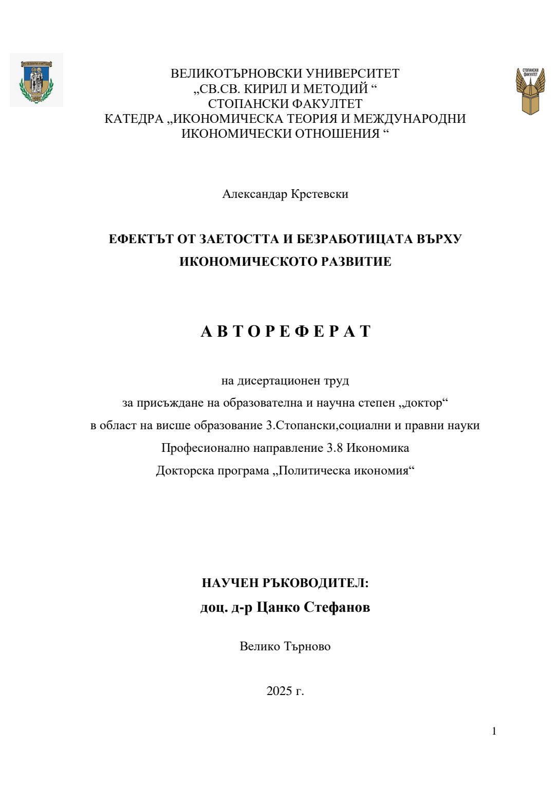 Ефектът от заетостта и безработицата върху икономическото развитие : Автореферат / Александар Крстевски ; Науч. ръководител Цанко Стефанов
