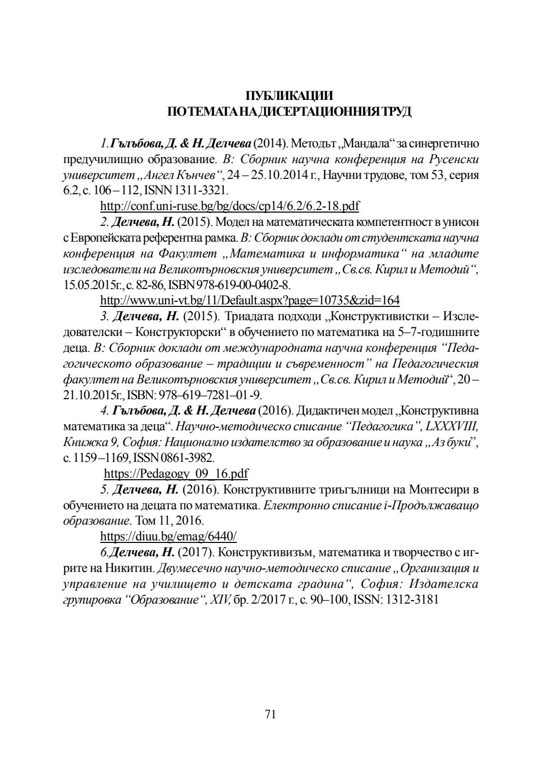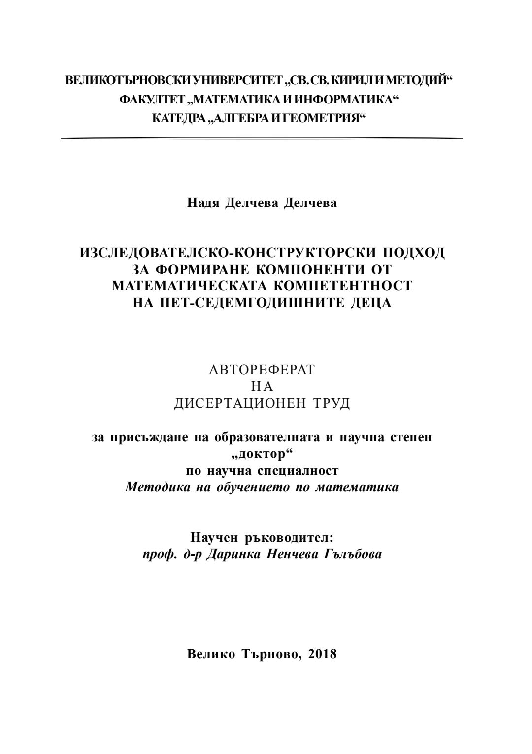 Изследователско-конструкторски подход за формиране компоненти от математическата компетентност на пет-седемгодишните деца : Автореферат / Надя Делчева Делчева ; Науч. ръководител Даринка Гълъбова