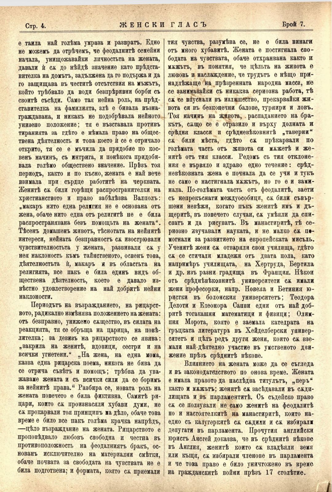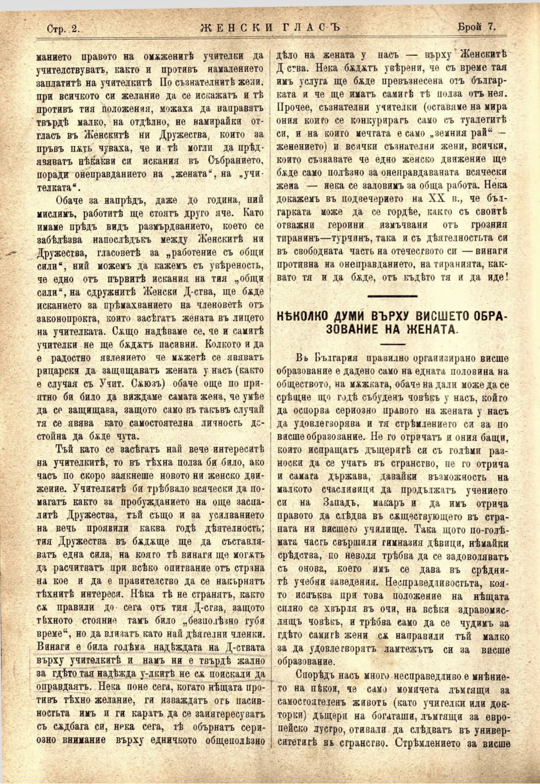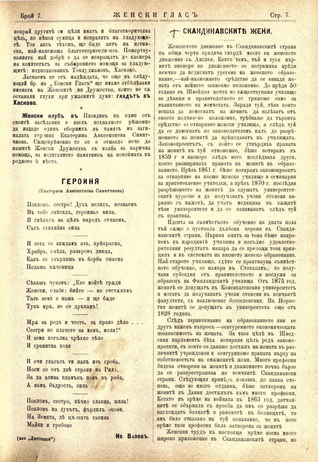Год. 1, № 7. Женски глас : Орган, посветен на интересите на жената