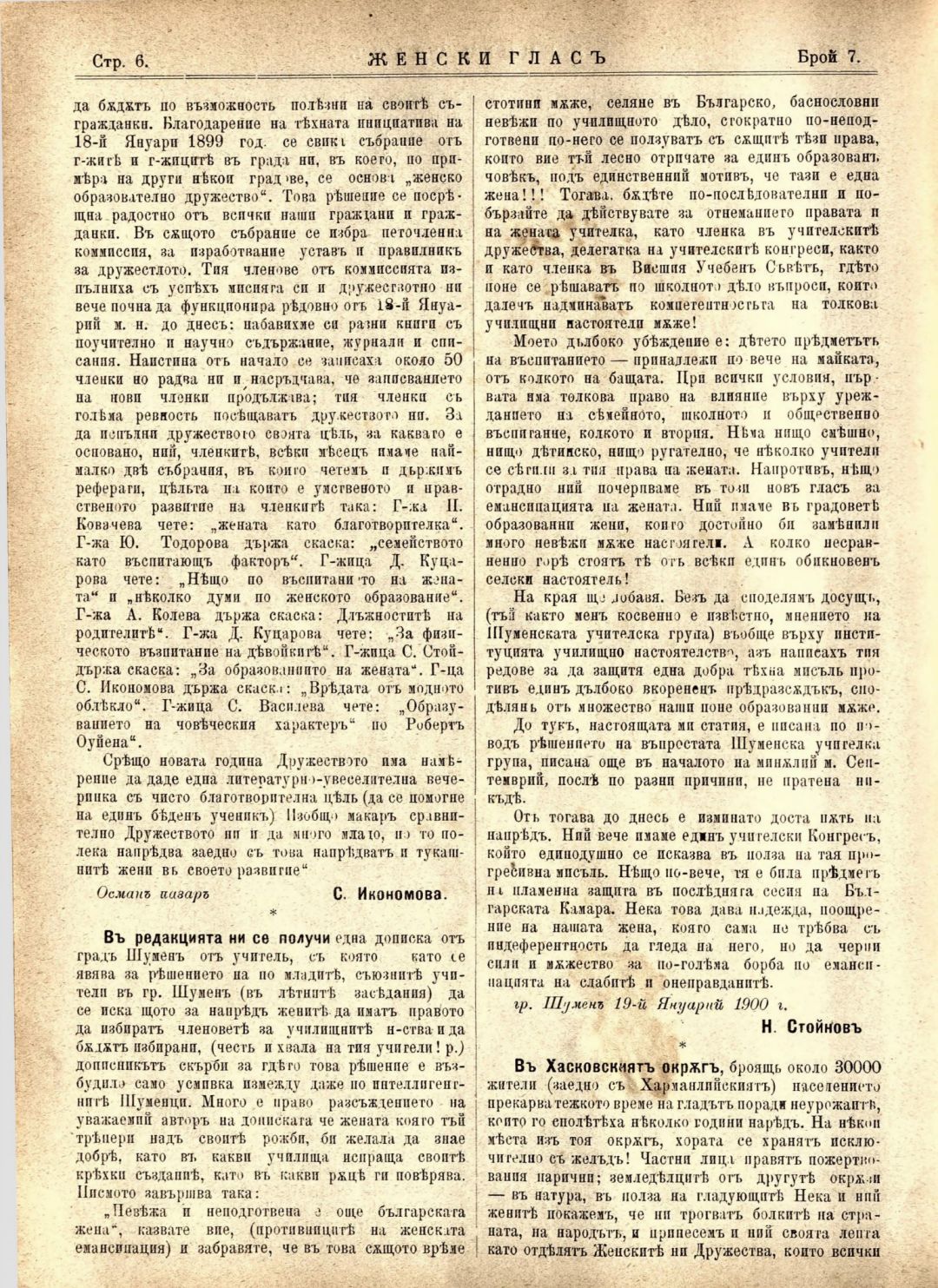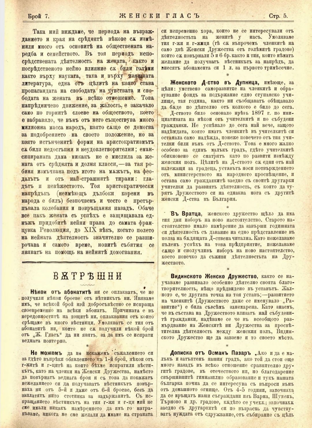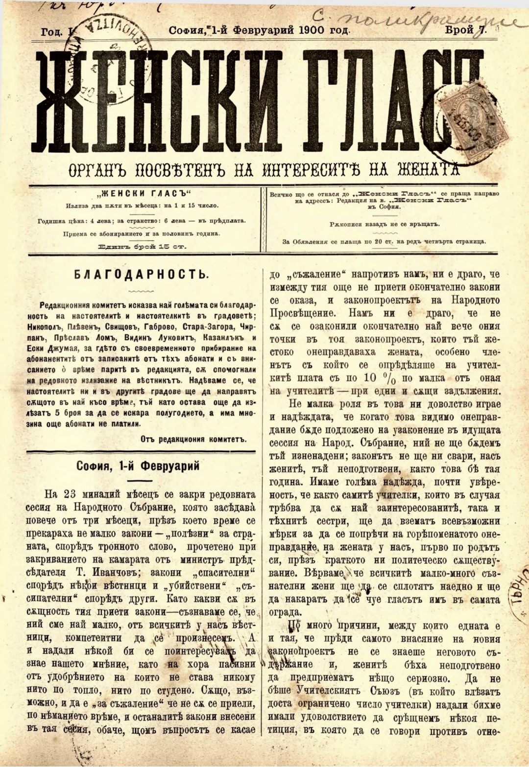 Год. 1, № 7. Женски глас : Орган, посветен на интересите на жената