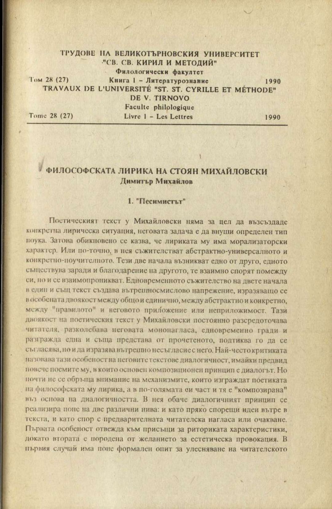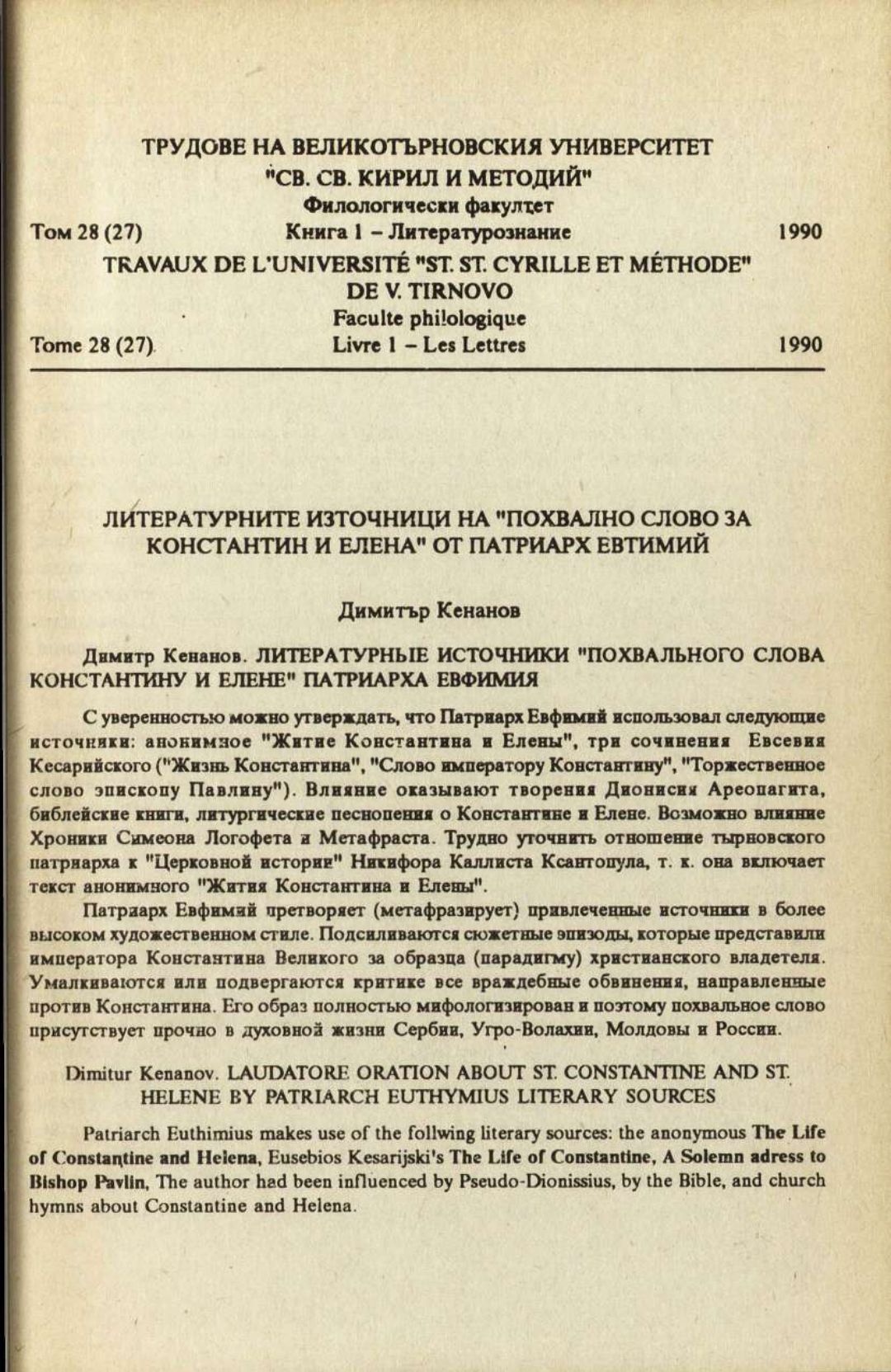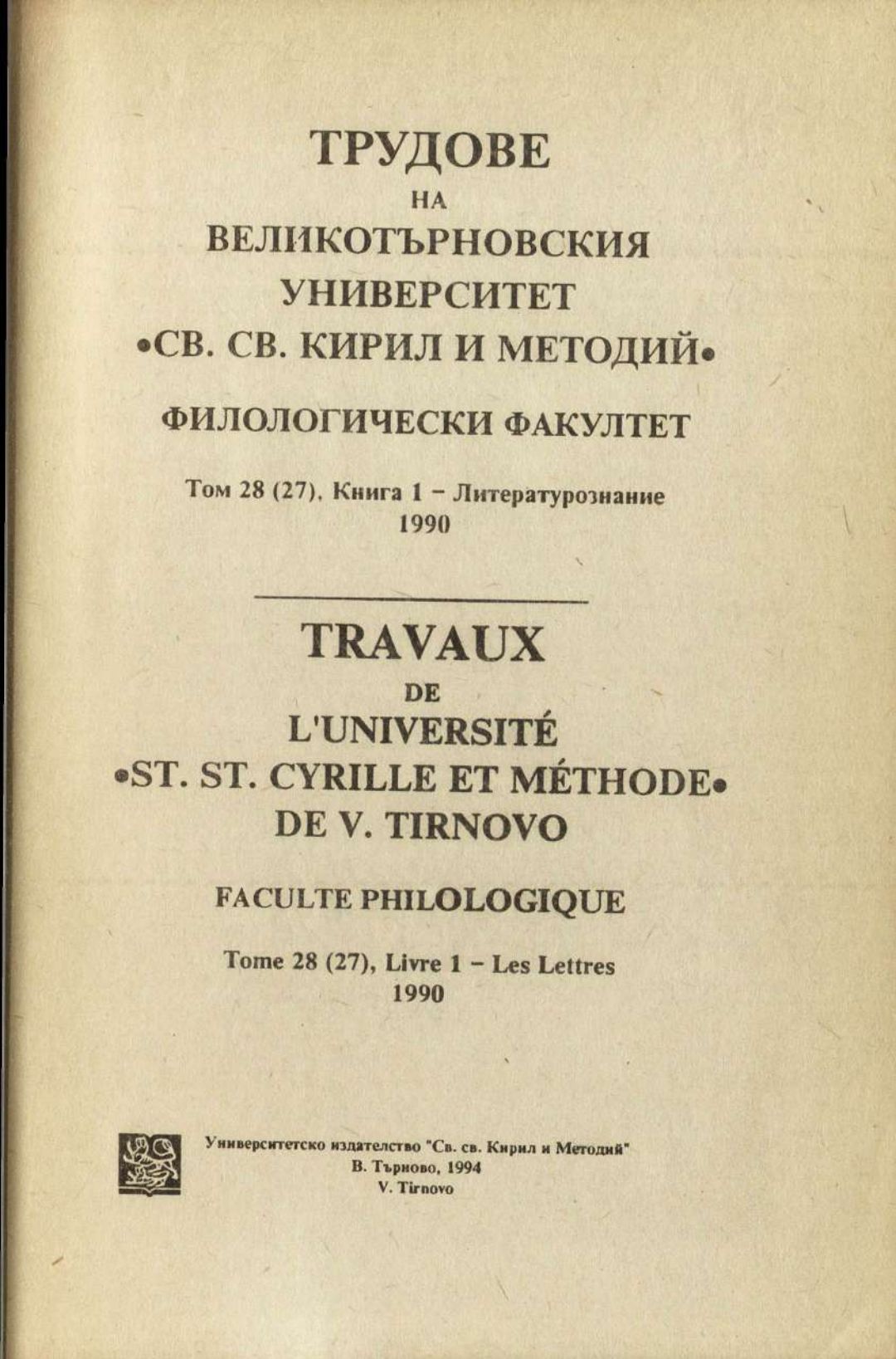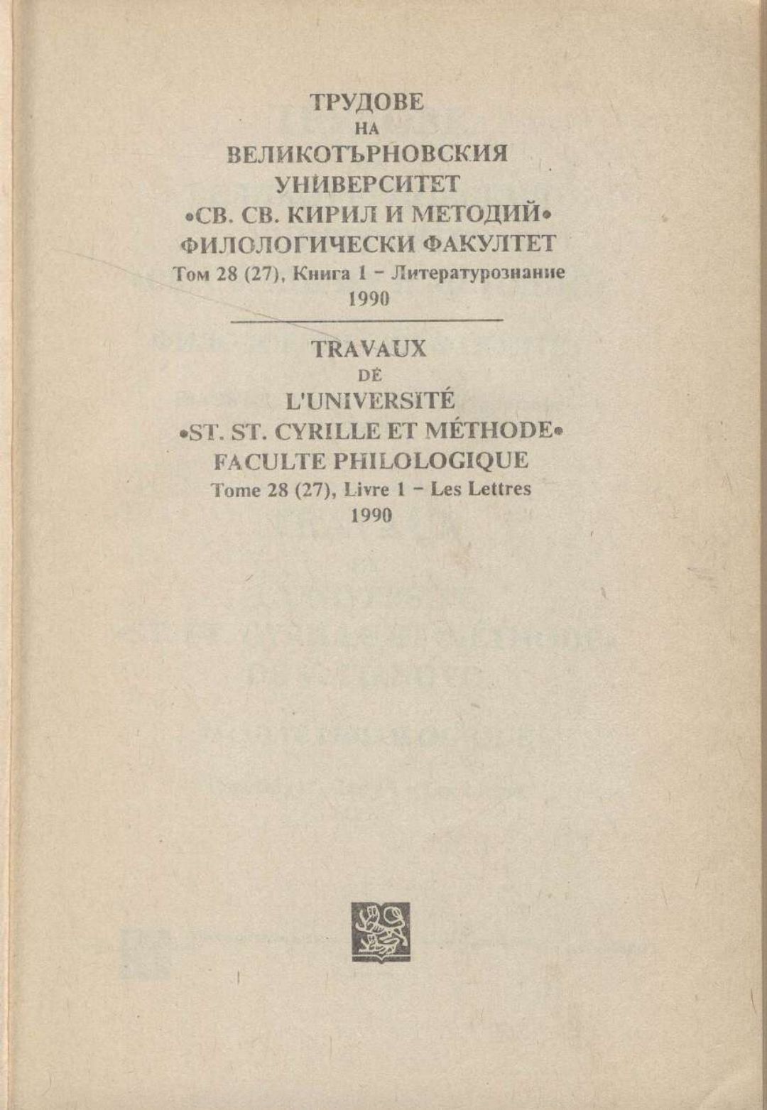 Том 28 (27) Кн.1. Трудове на Великотърновския университет "Св. св. Кирил и Методий". Филологически факултет = Travaux de L'universite St. St. Cyrille et Methode de Veliko Tirnovo. Faculte de philologue Литературознание