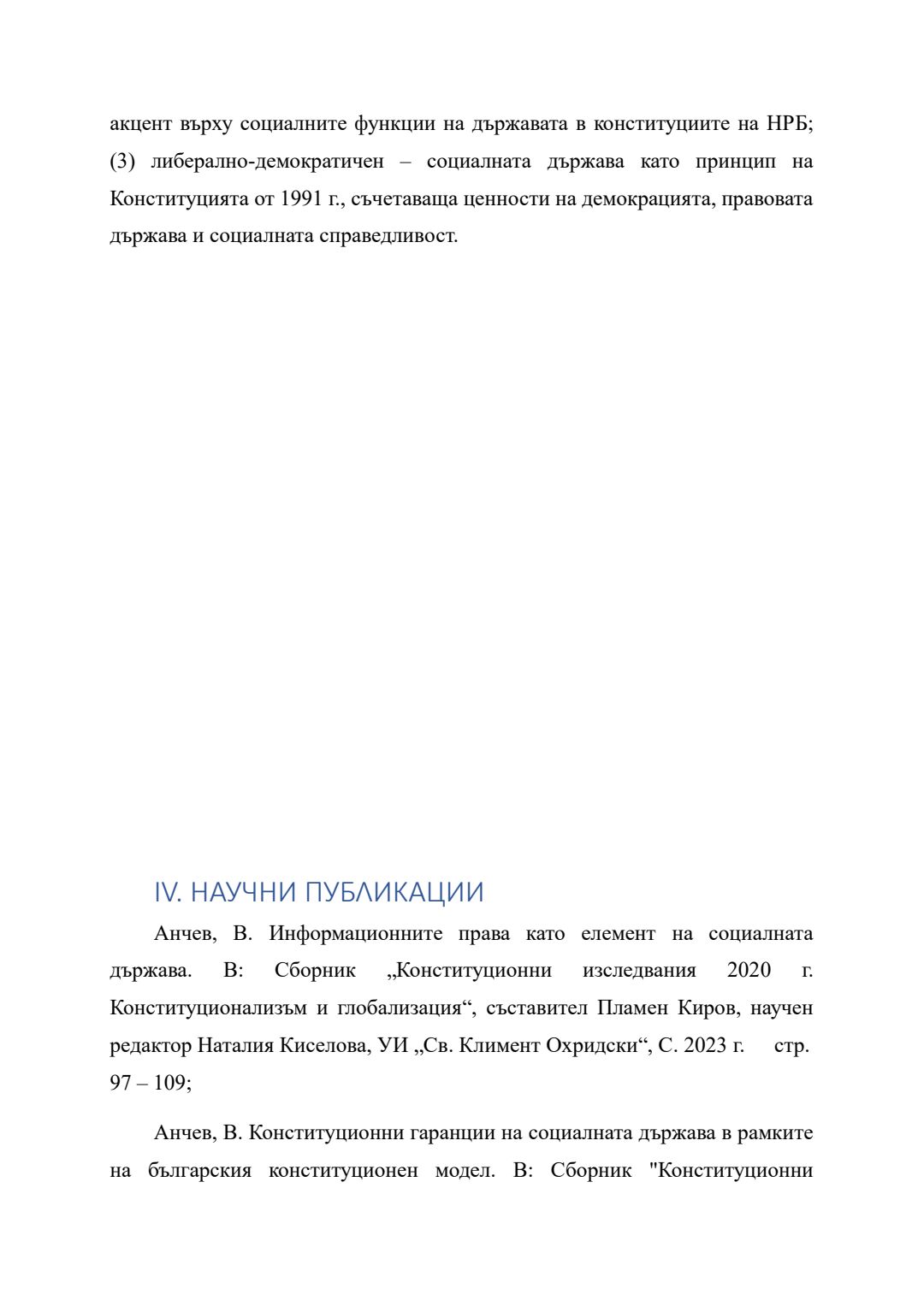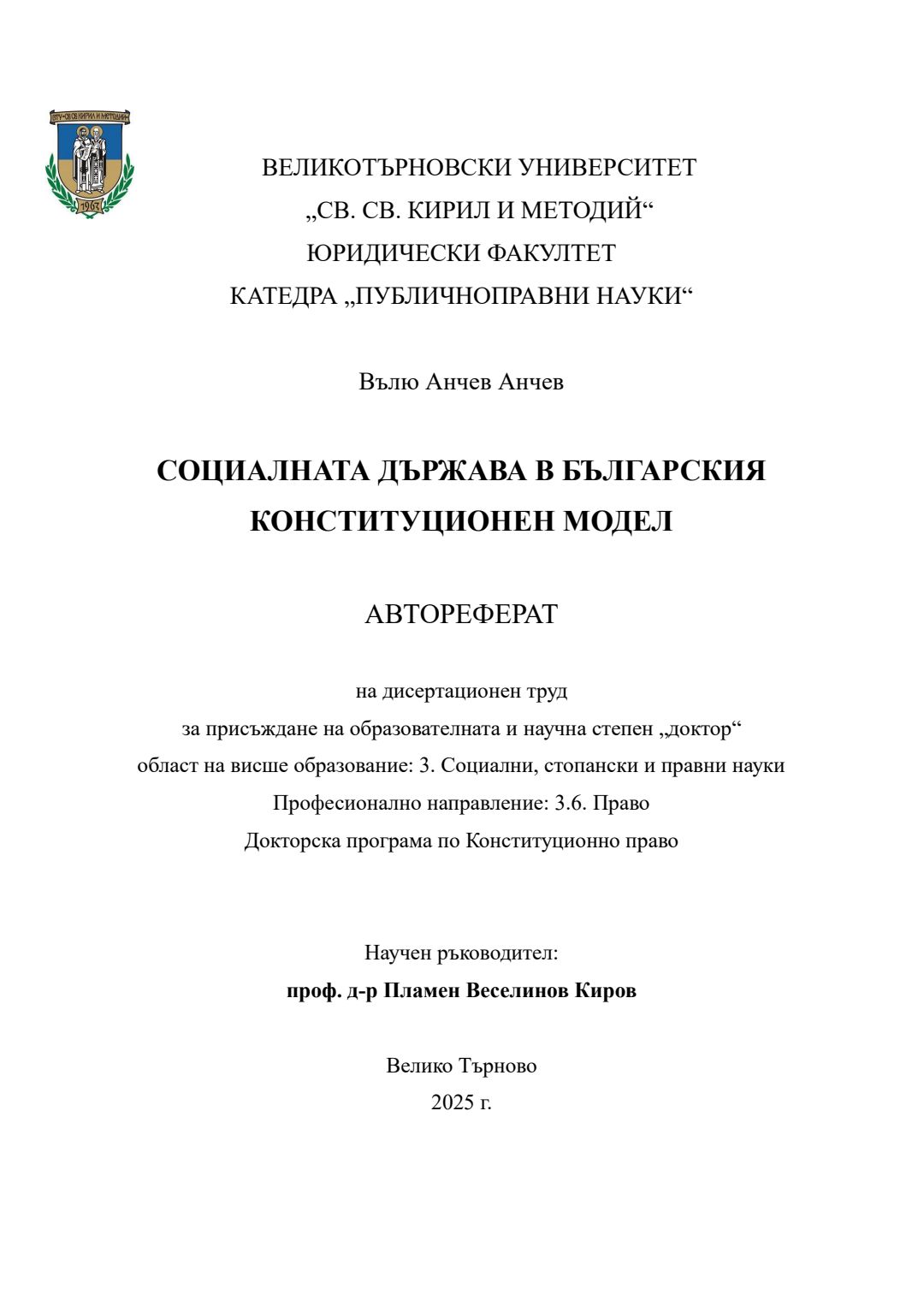 Социалната държава в българския конституционен модел : Автореферат / Вълю Анчев Анчев ; Науч. ръководител Пламен Веселинов Киров