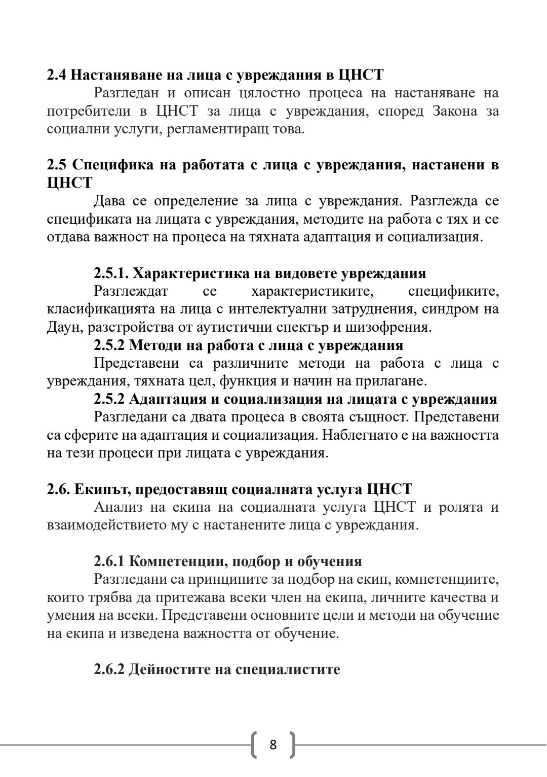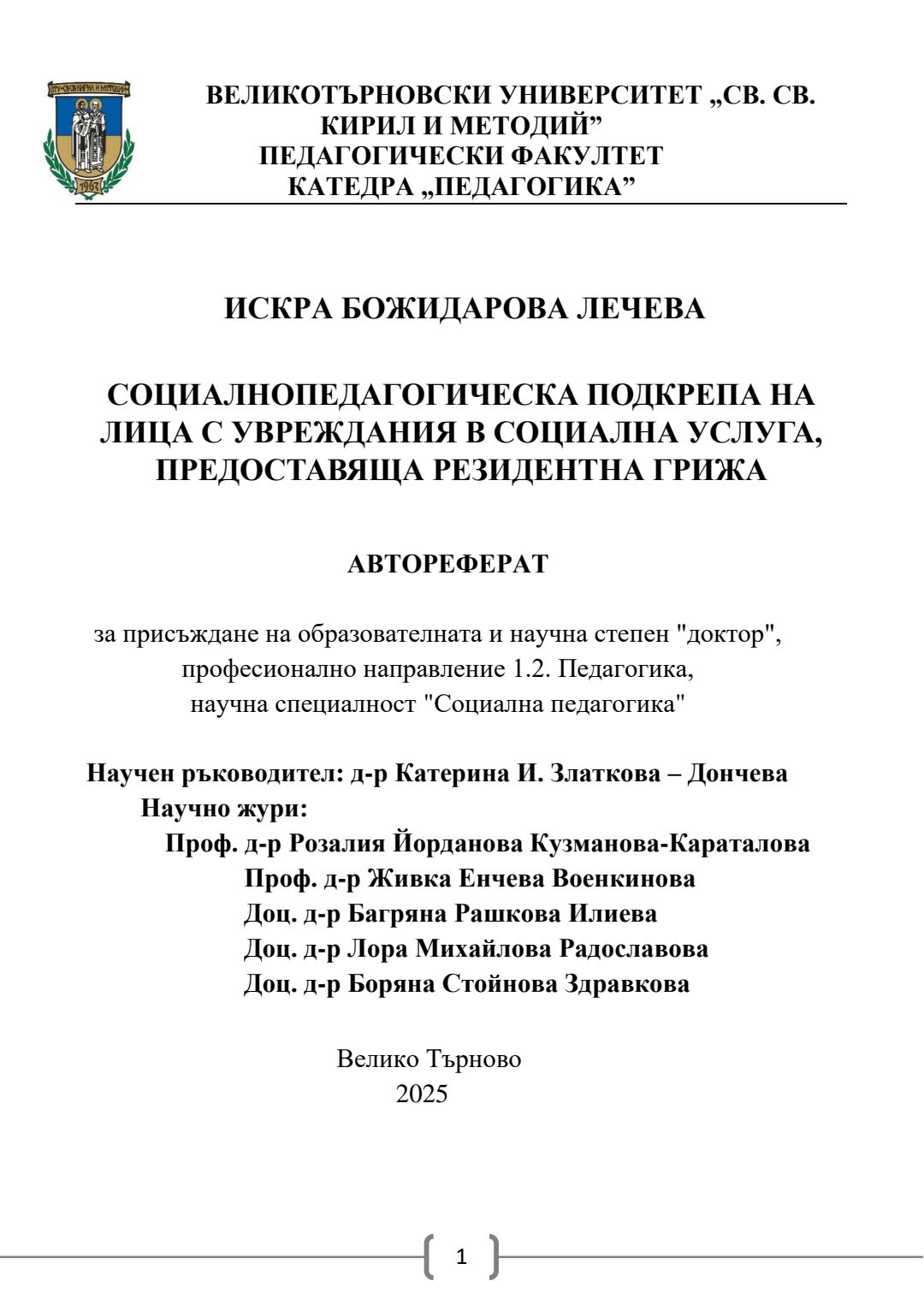 Социалнопедагогическа подкрепа на лица с увреждания в социална услуга, предоставяща резидентна грижа : Автореферат / Искра Божидарова Лечева ; Науч. ръководител Катерина И. Златкова – Дончева