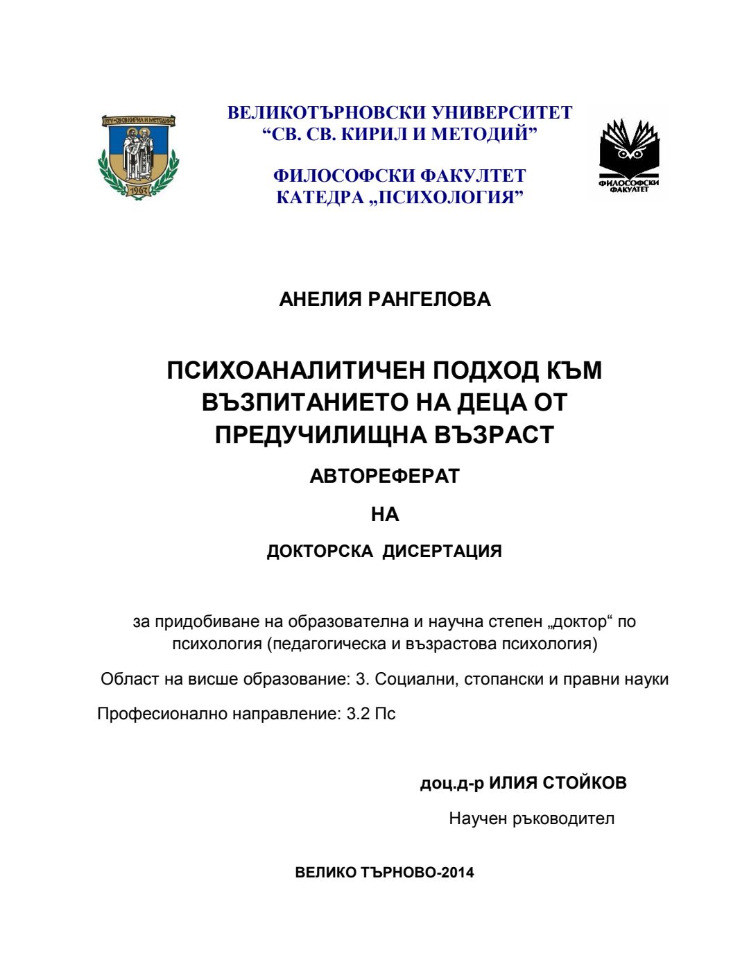 Психоаналитичен подход към възпитанието на деца от предучилищна възраст : Автореферат / Анелия Рангелова ; Науч. ръководител Илия Стойков