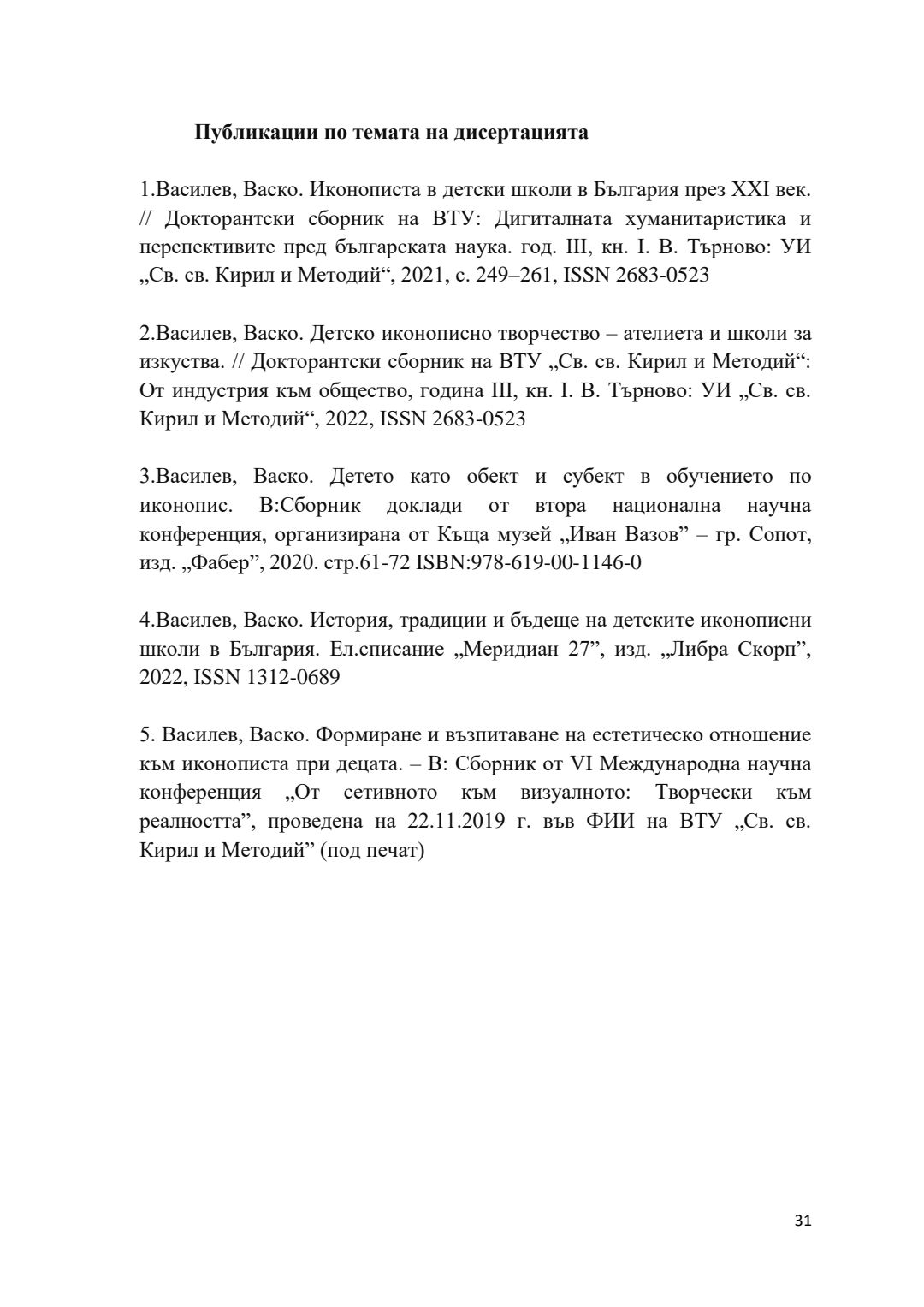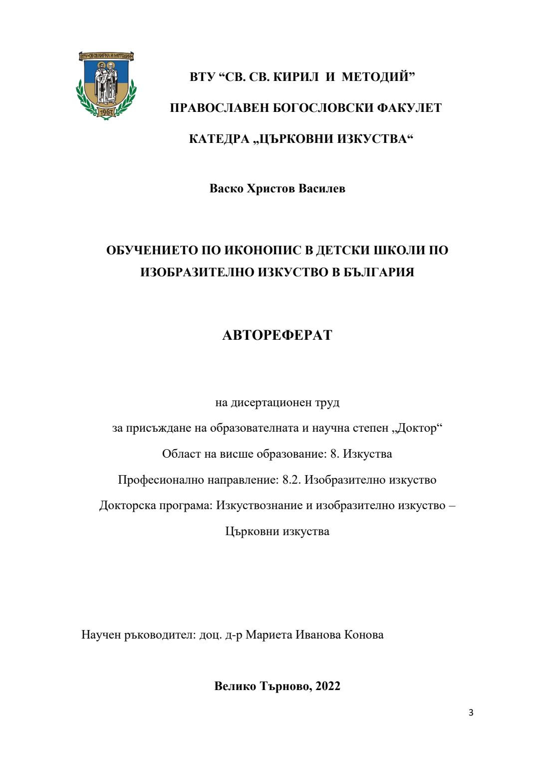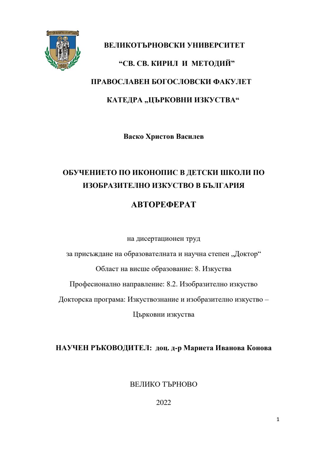 Обучението по иконопис в детски школи по изобразително изкуство в България : Автореферат / Васко Христов Василев ; Науч. ръководител Мариета Иванова Конова