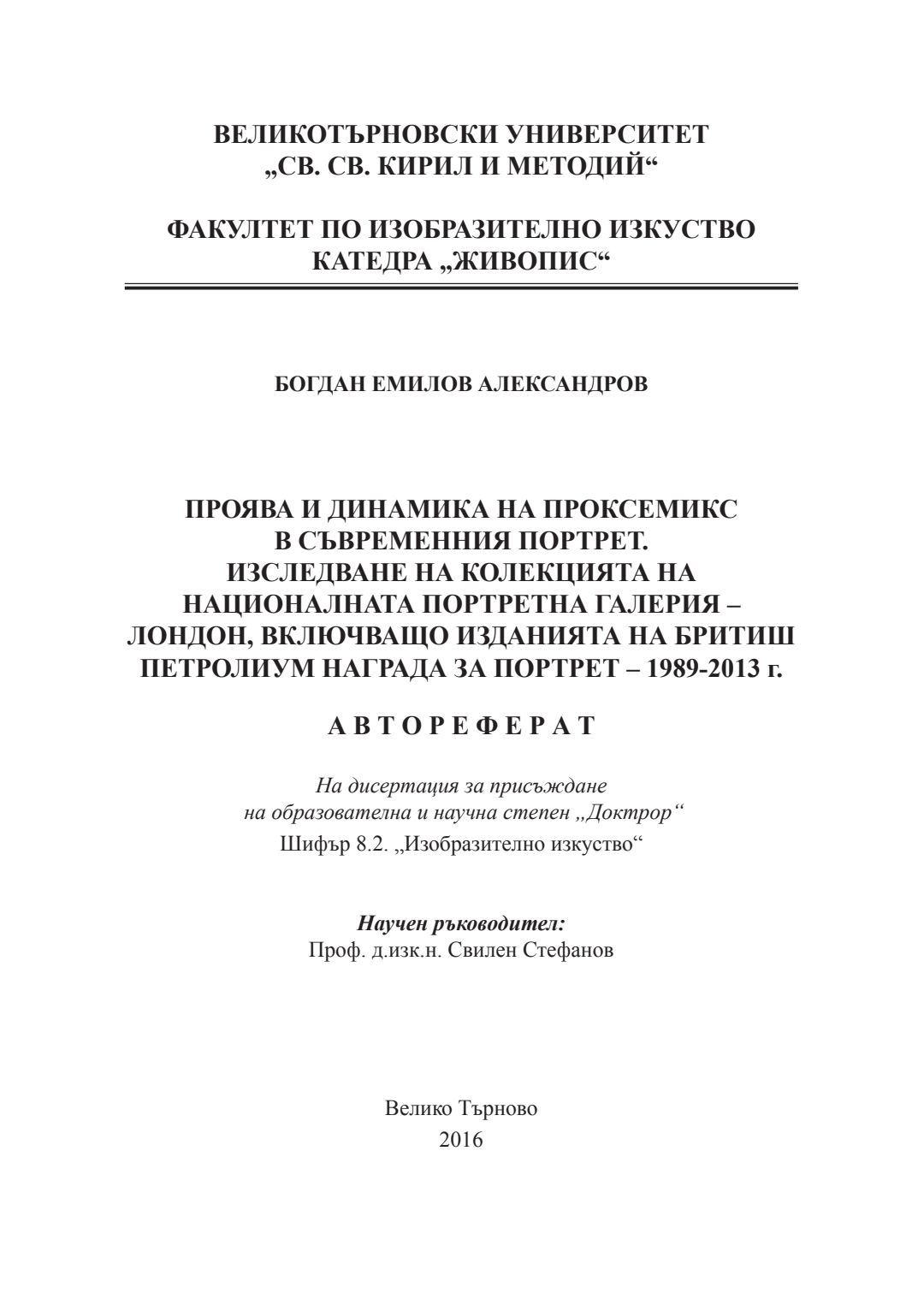 Проява и динамика на проксемикс в съвременния портрет. Изследване на колекцията на Националната портретна галерия – Лондон, включващо изданията на Бритиш Петролиум награда за портрет – 1989-2013 г. : Автореферат / Богдан Емилов Александров ; Науч. ръководител Свилен Стефанов