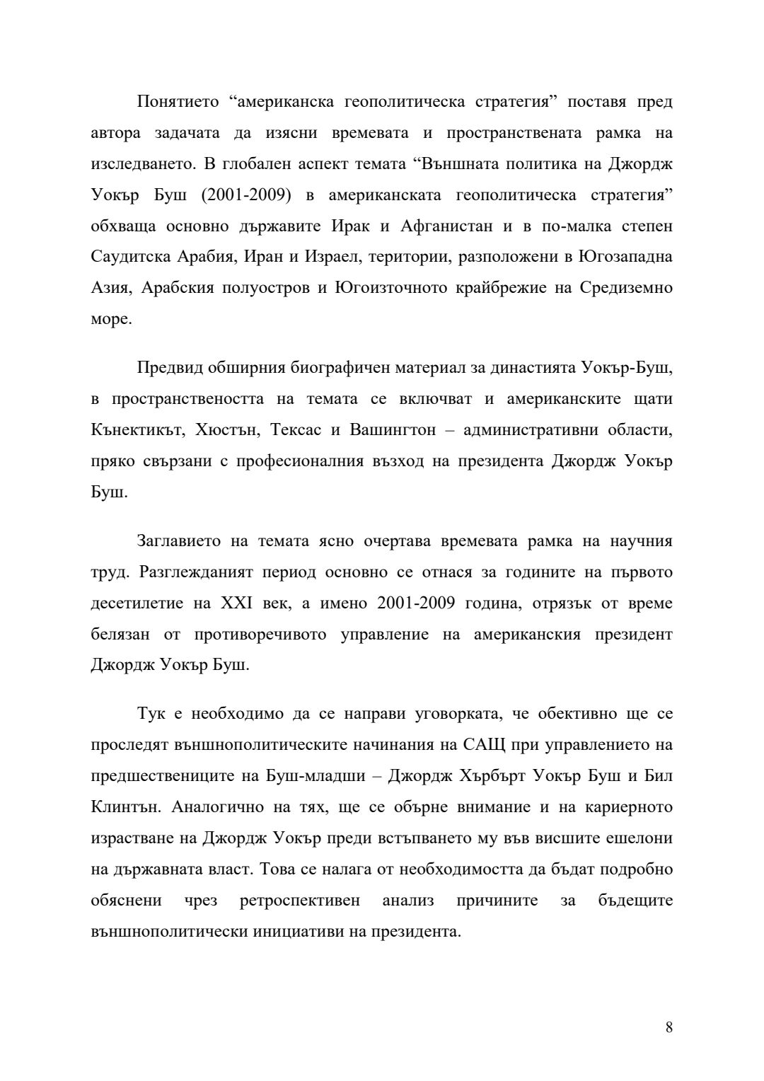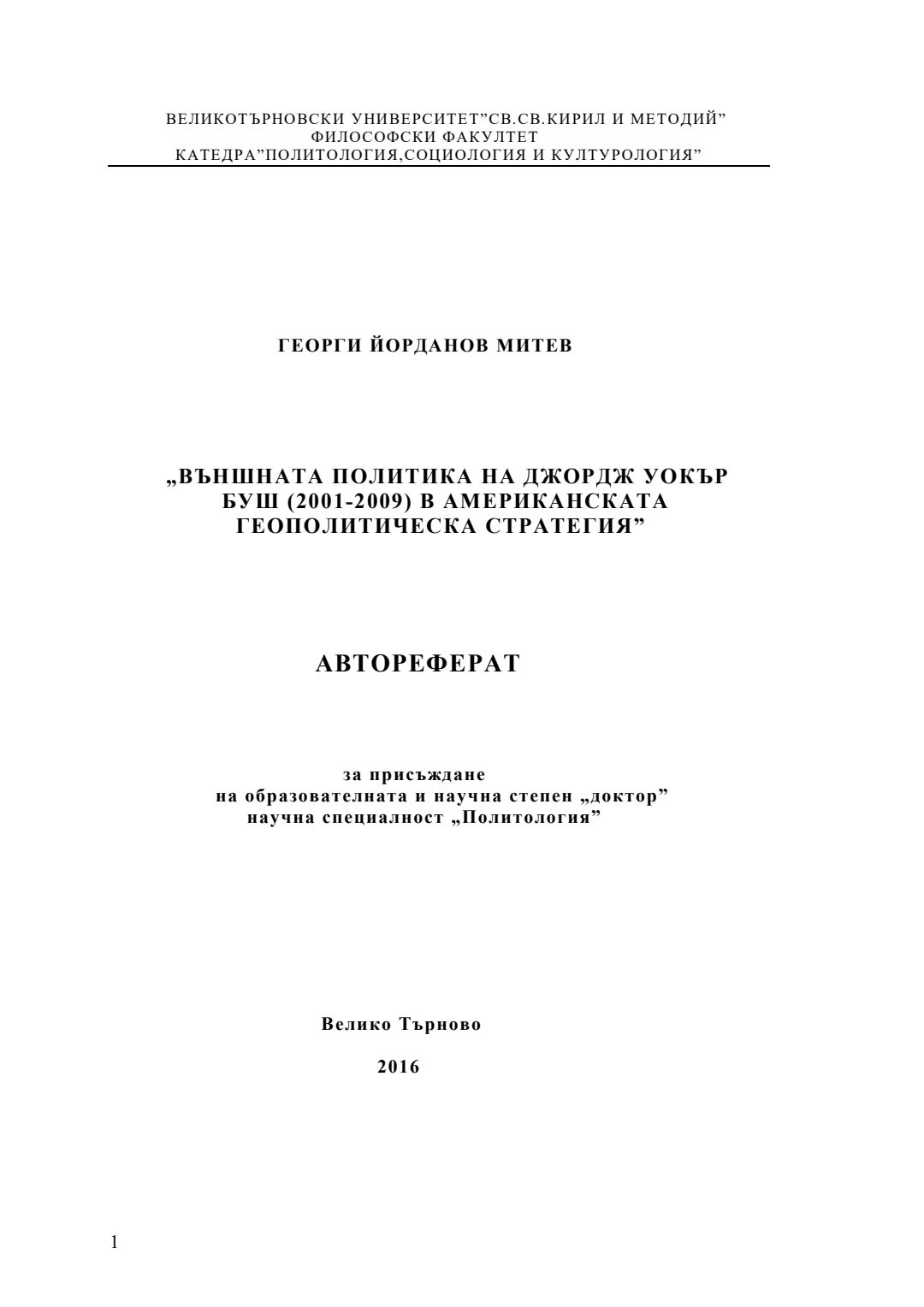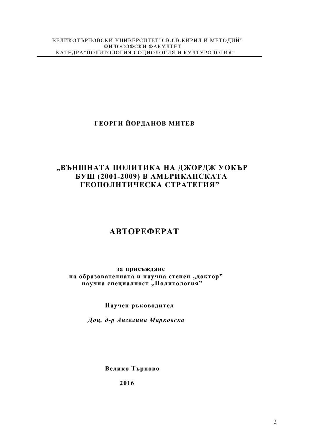 Външната политика на Джордж Уокър Буш (2001-2009) в американската геополитическа стратегия : Автореферат / Георги Йорданов Митев ; Науч. ръководител Ангелина Марковска