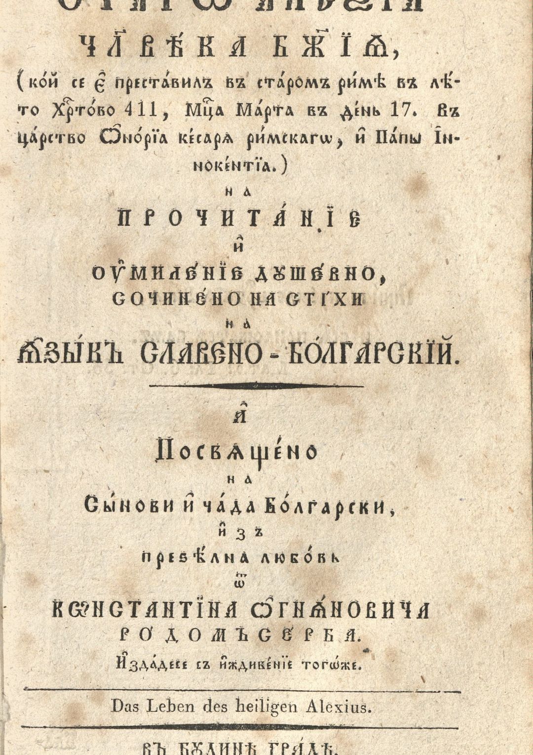 Житие светаго Алексия человека божия (кой се е преставил в старо Риме в лето Христово 411, месеца марта в ден 17, в царство Онория кесаря римскаго и папа Инокентиа) : на прочитания и умиление душевно, сочинено на стихи на язик славено-болгарский, а посвящено на синови и чада болгарски из презелна любов от К. Огняновича, родом серба. – 1. изд.
