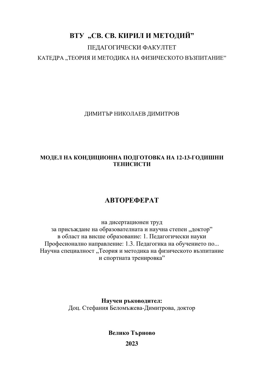 Модел за кондиционна подготовка на 12-13 годишни тенисисти : Автореферат / Димитър Николаев Димитров ; Науч. ръководител Стефания Беломъжева-Димитрова