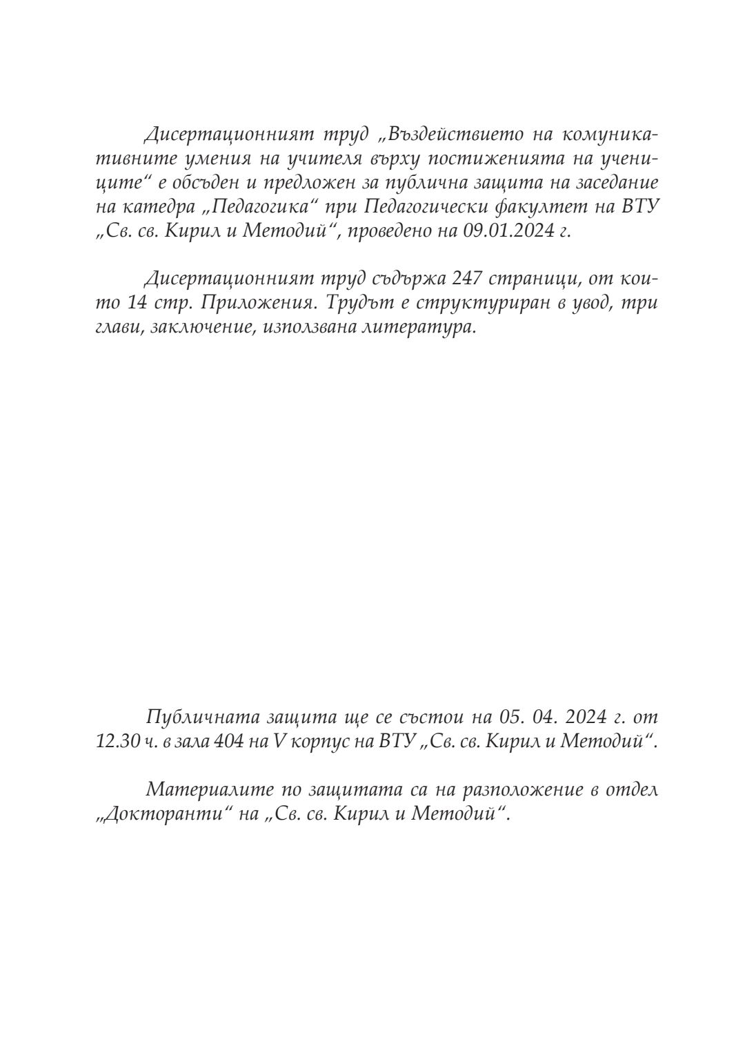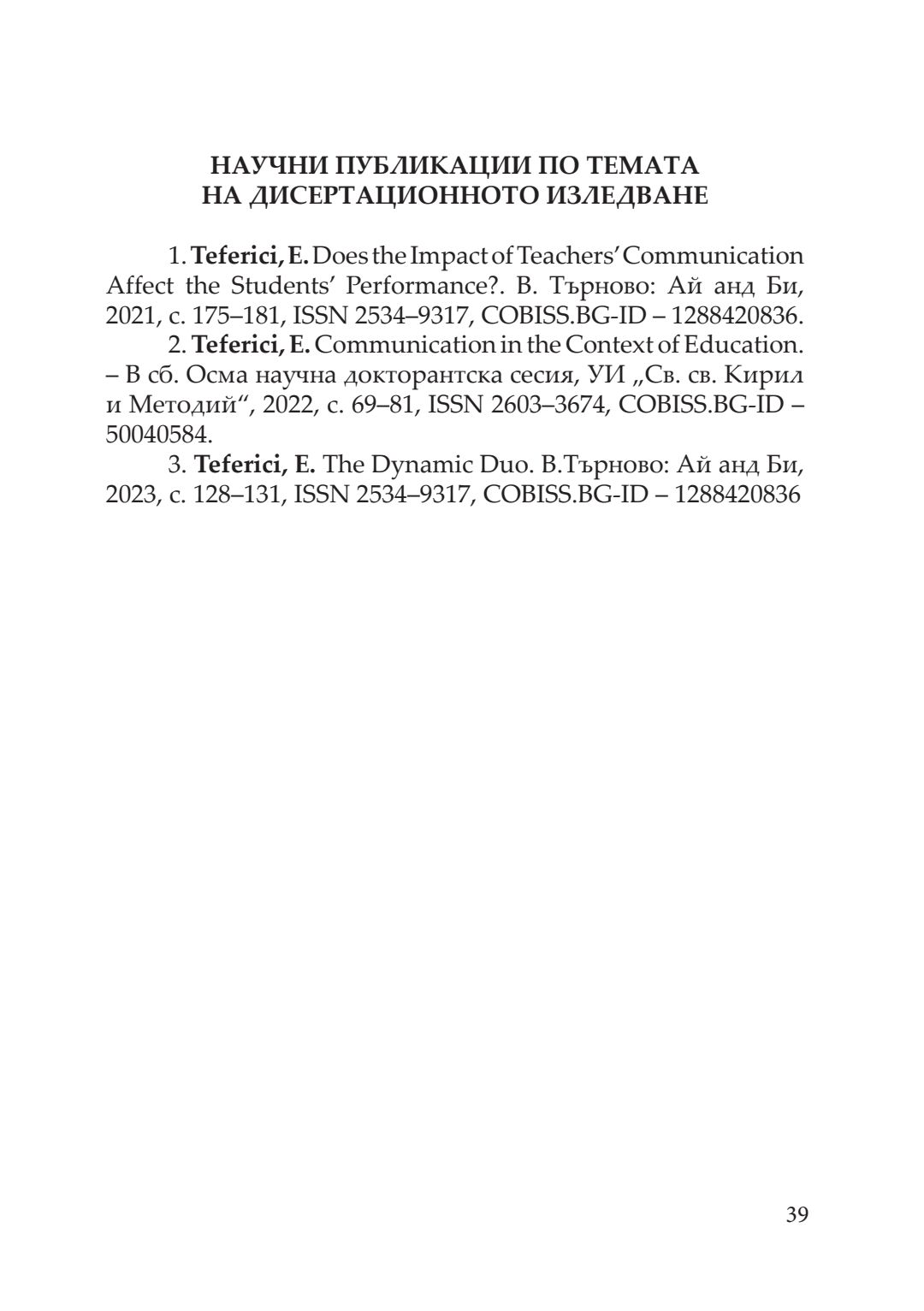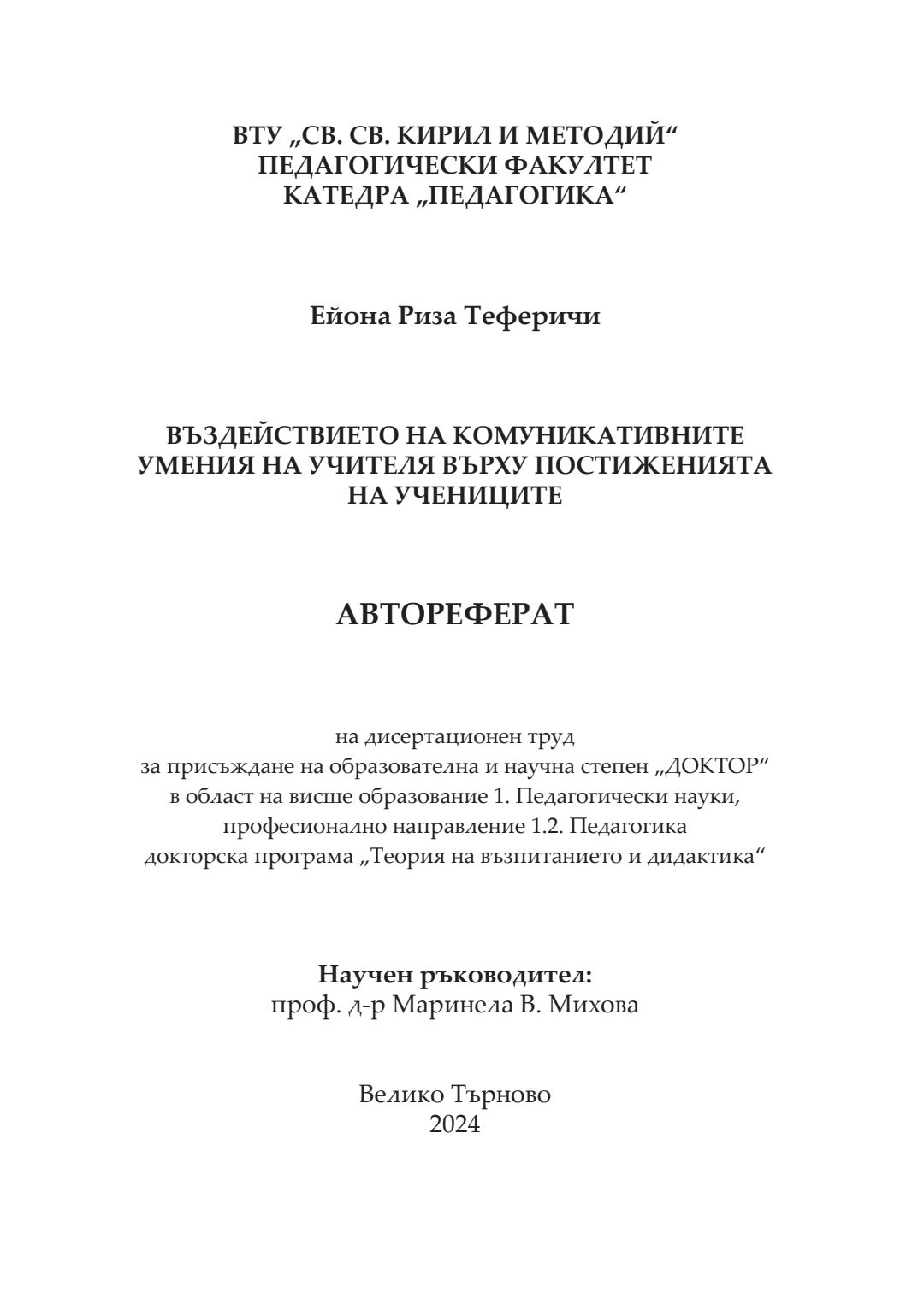 Въздействието на комуникативните умения на учителя върху постиженията на учениците : Автореферат / Ейона Риза Теферичи ; Науч. ръководител Маринела Михова