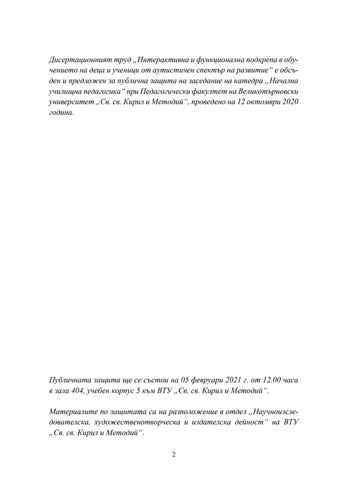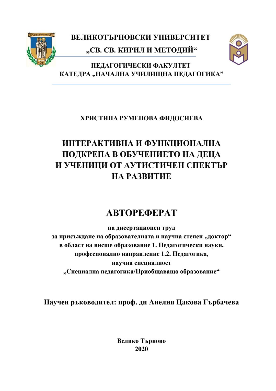Интерактивна и функционална подкрепа в обучението на деца и ученици от аутистичен спектър на развитие : Автореферат / Христина Руменова Фидосиева ; Науч. ръководител Анелия Цакова Гърбачева