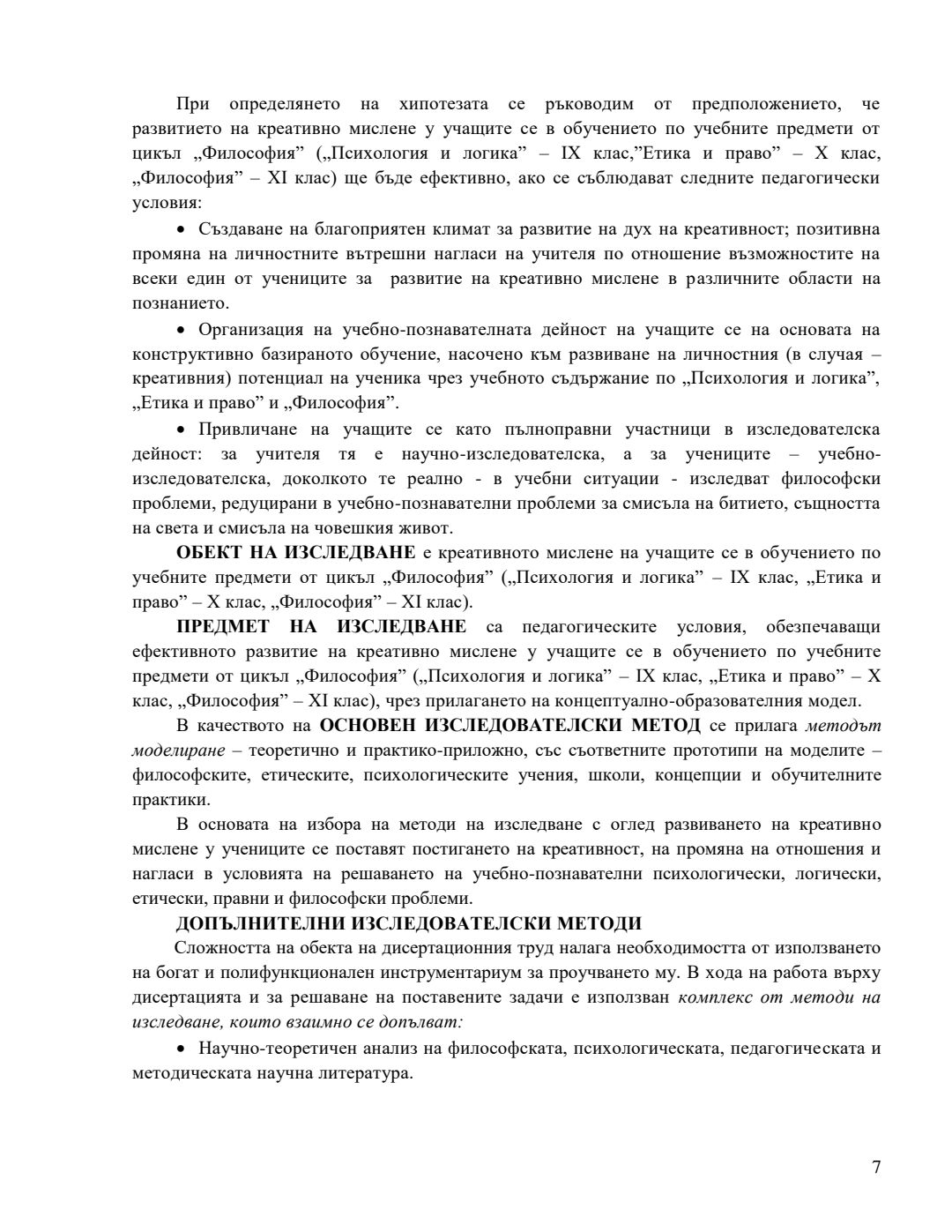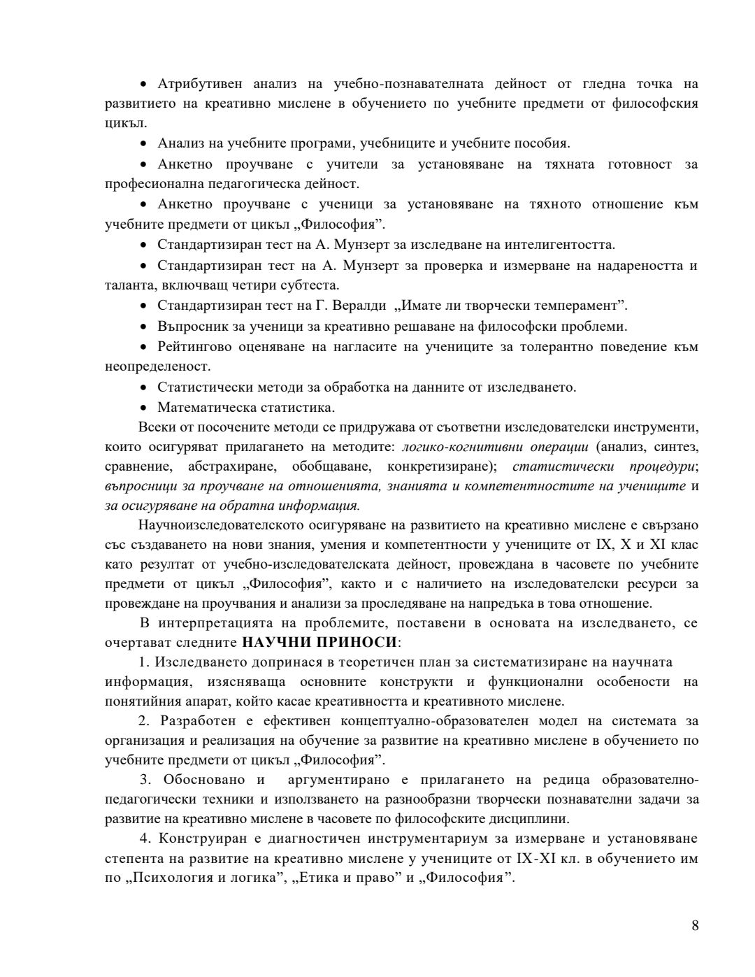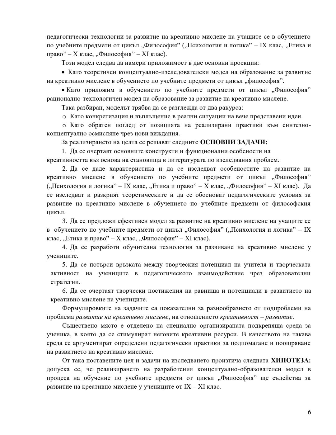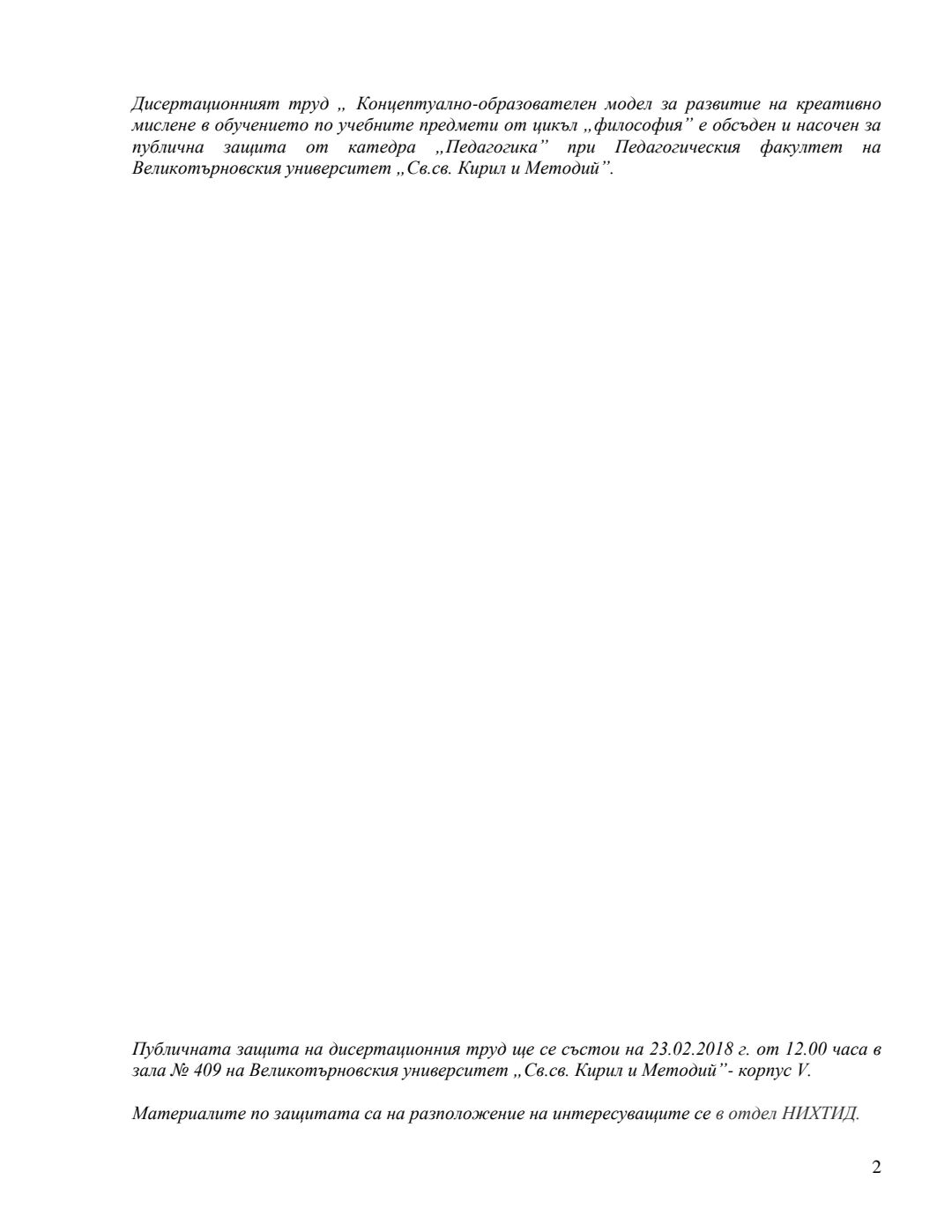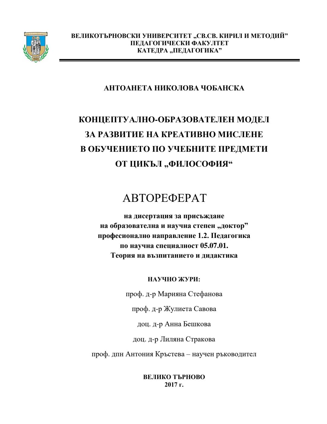 Концептуално-образователен модел за развитие на креативно мислене в обучението по учебните предмети от цикъл „Философия“ : Автореферат / Антоанета Николова Чобанска ; Науч. ръководител Антония Кръстева