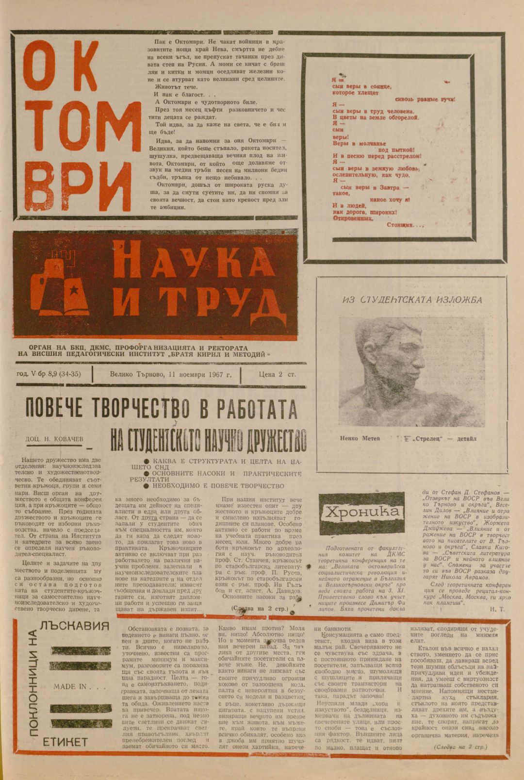 Год. 5, 8-9 (34-35). Наука и труд : Орган на БКП, ДКМС и Профорганизацията и Ректората на ВПИ "Братя Кирил и Методий"