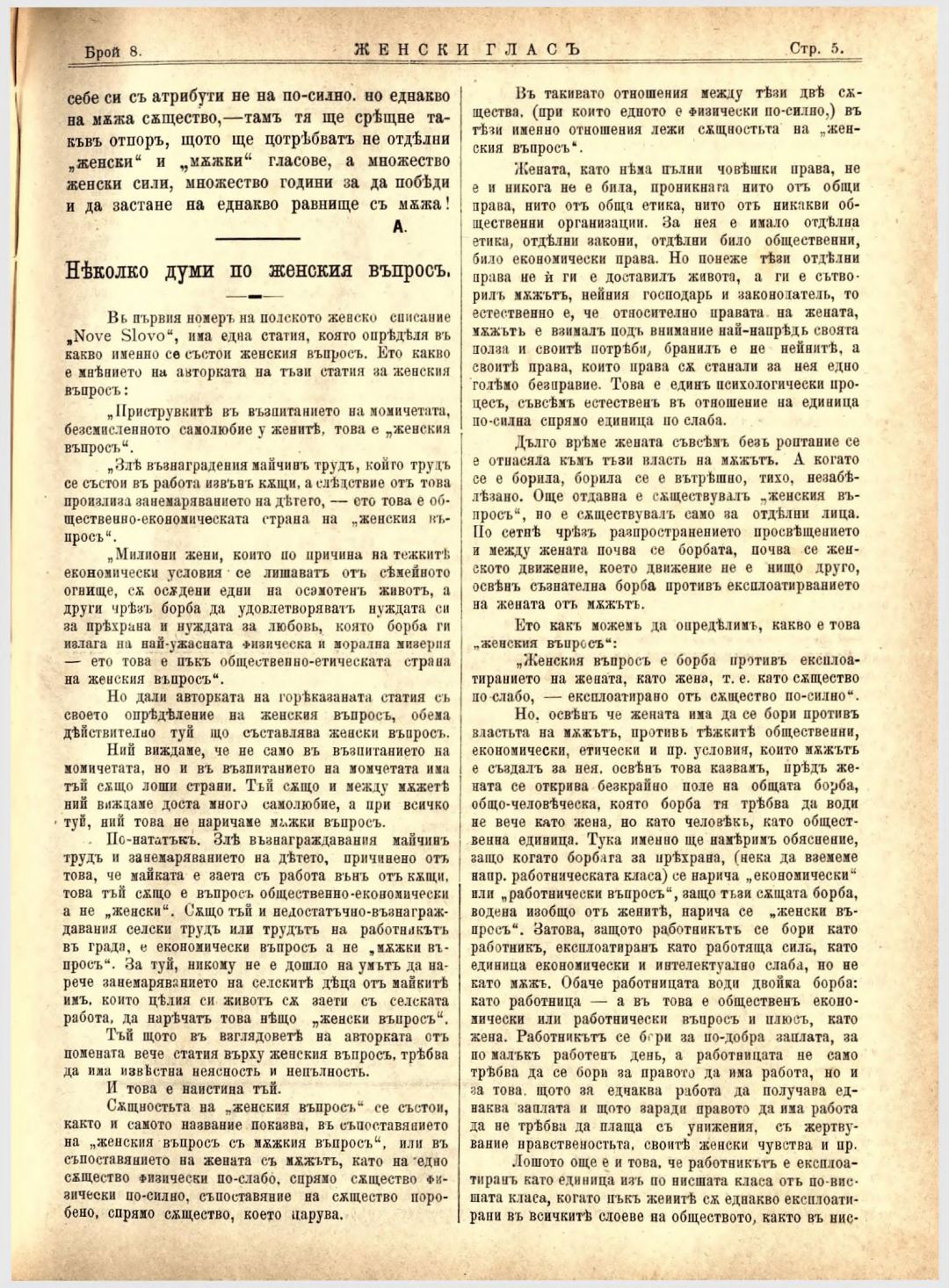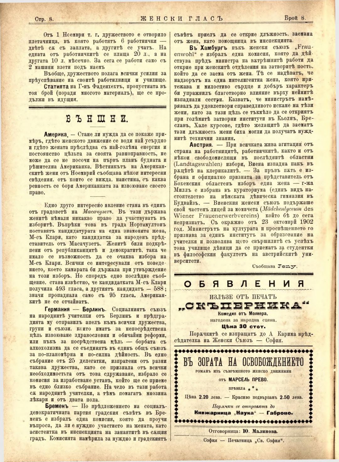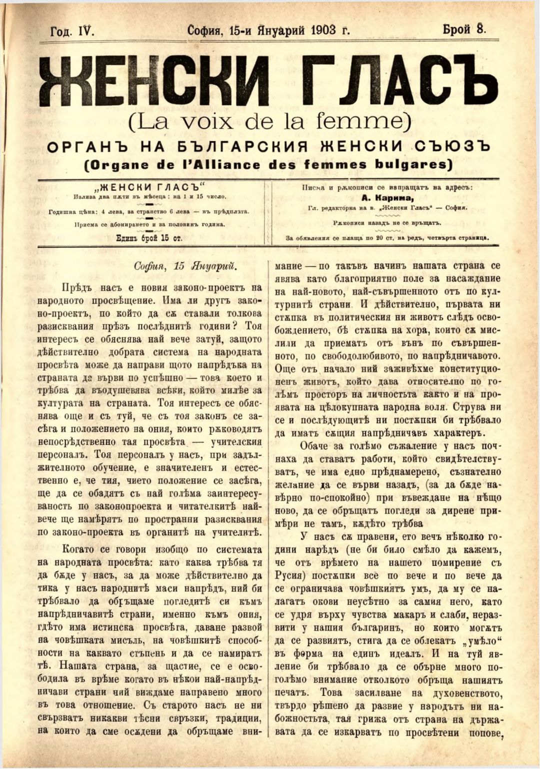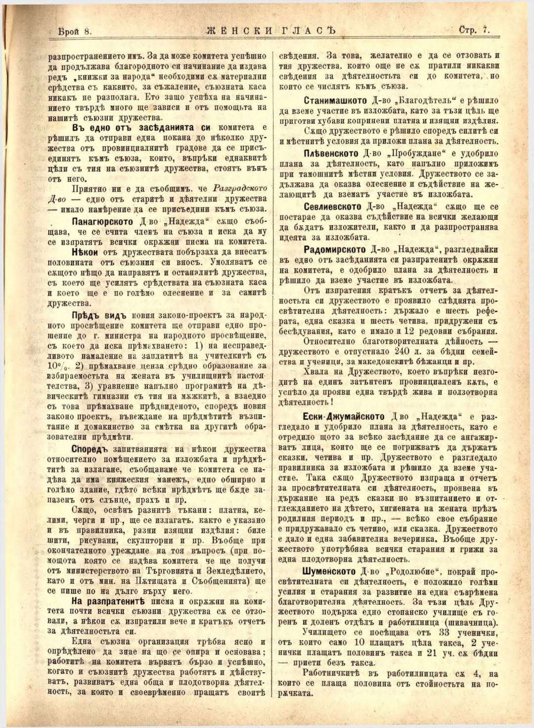 Год. 4, № 8 Женски глас : Орган на българския женски съюз
