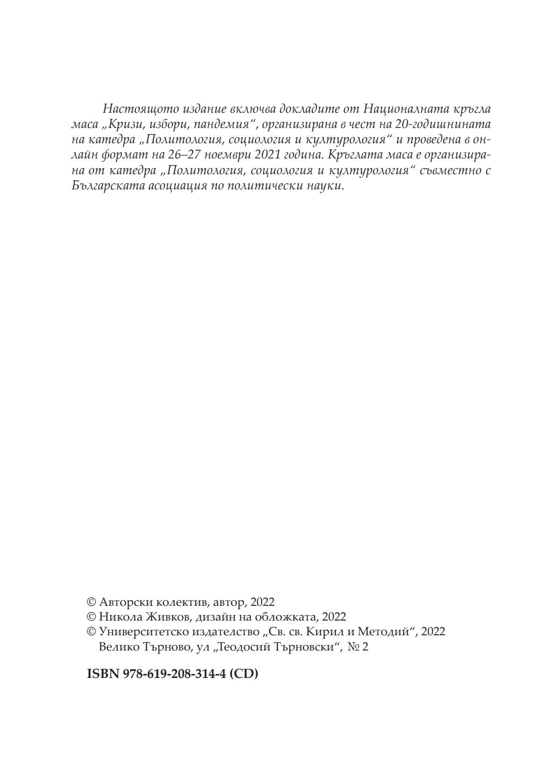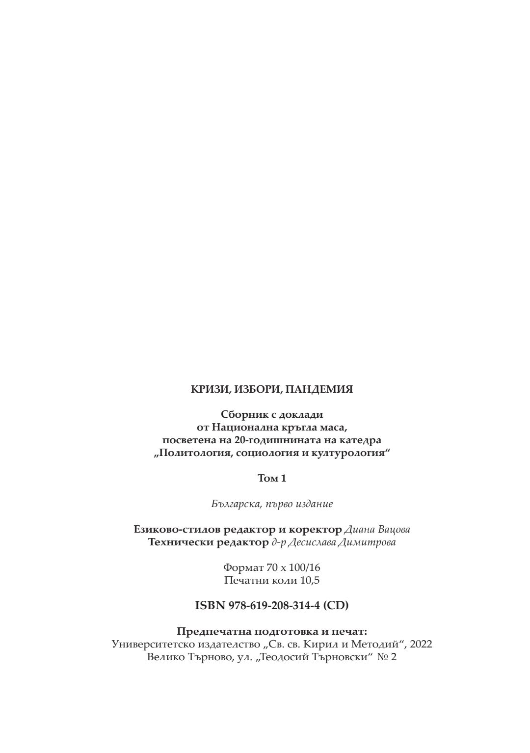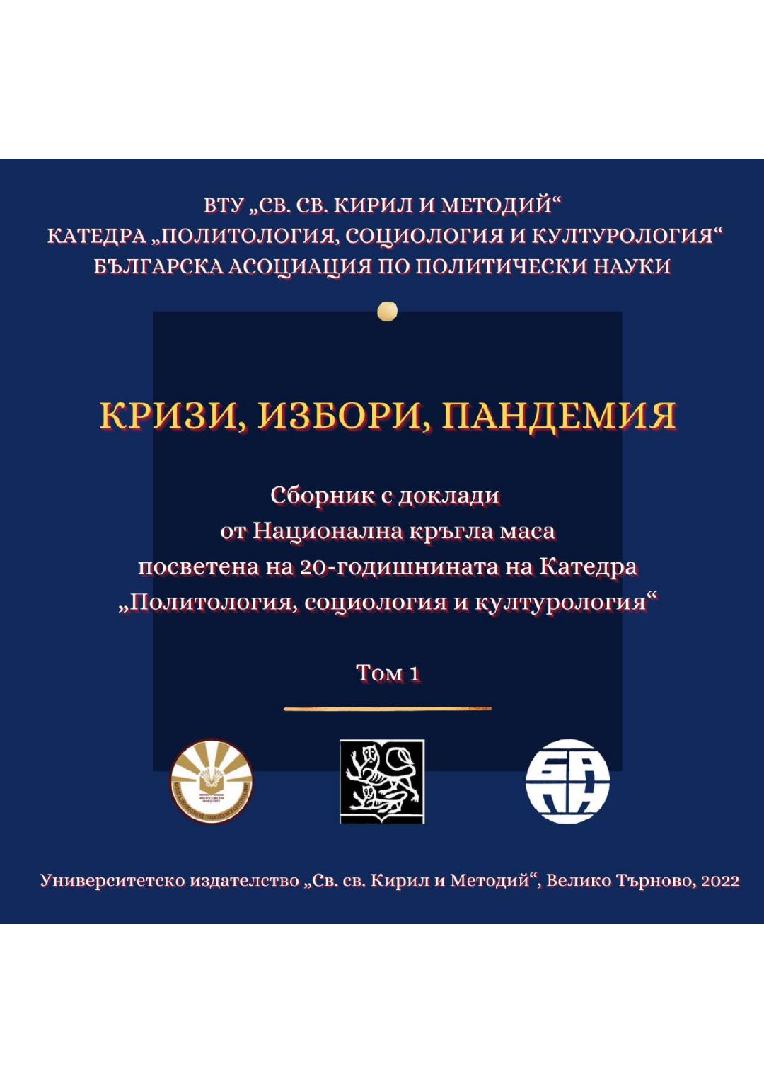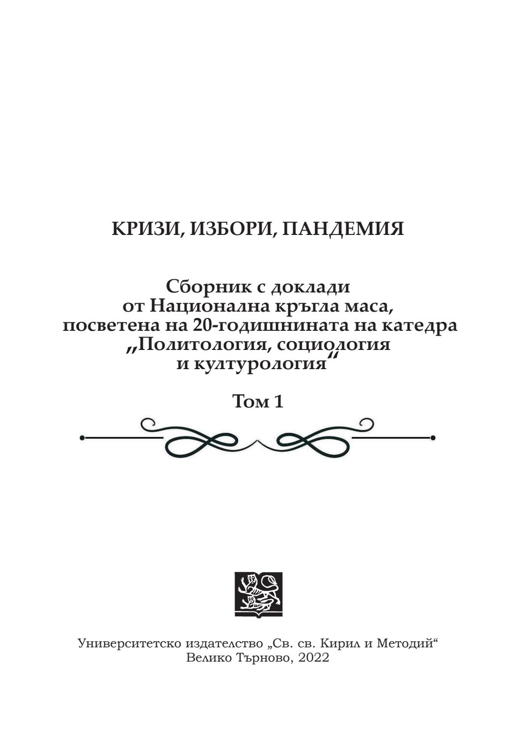 Кризи, избори, пандемия : сборник с доклади от национална кръгла маса, посветена на 20-годишнината на катедра „Политология, социология и културология“, 26–27 ноември 2021 година, Велико Търново. Т. 1