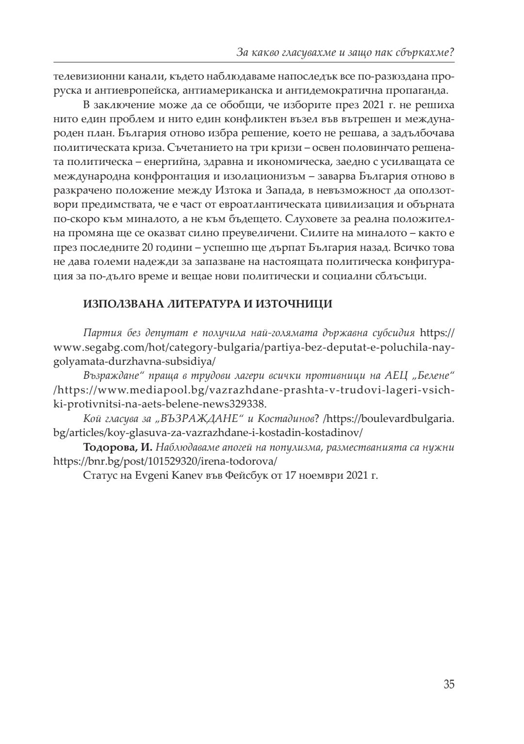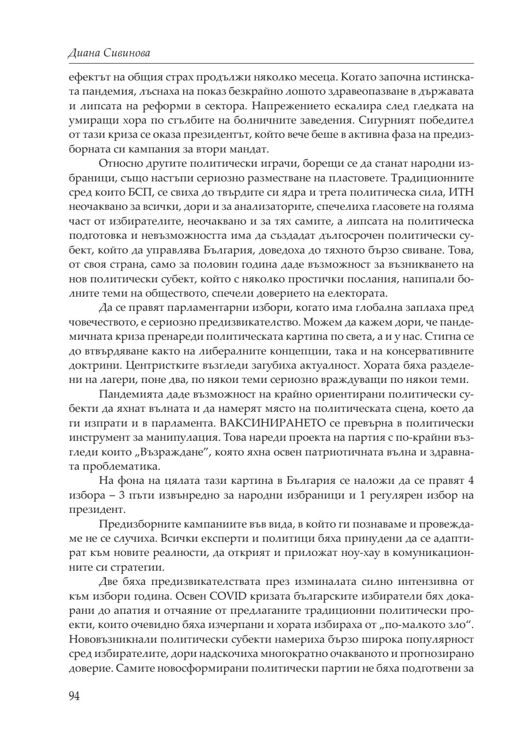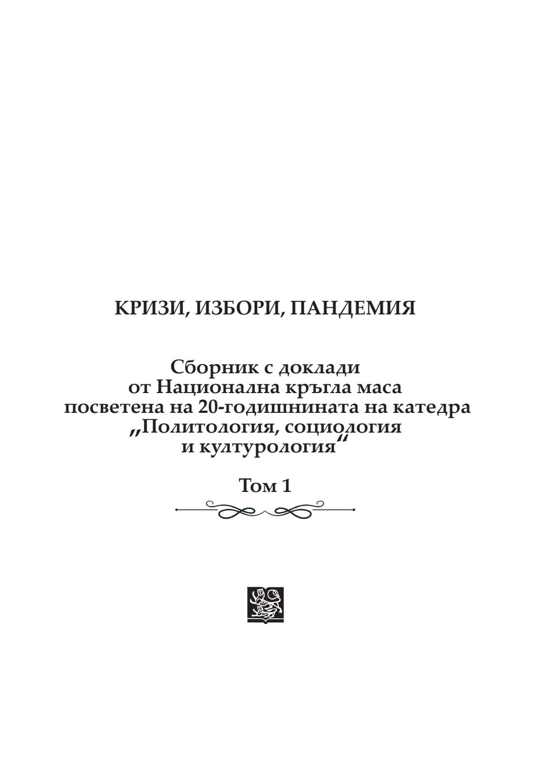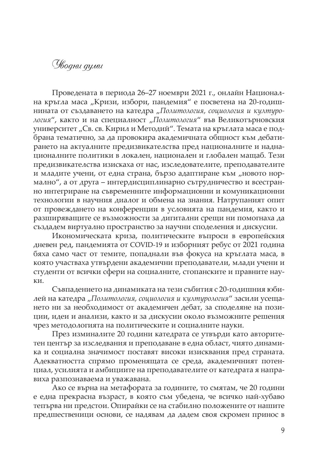 Кризи, избори, пандемия : сборник с доклади от национална кръгла маса, посветена на 20-годишнината на катедра „Политология, социология и културология“, 26–27 ноември 2021 година, Велико Търново. Т. 1