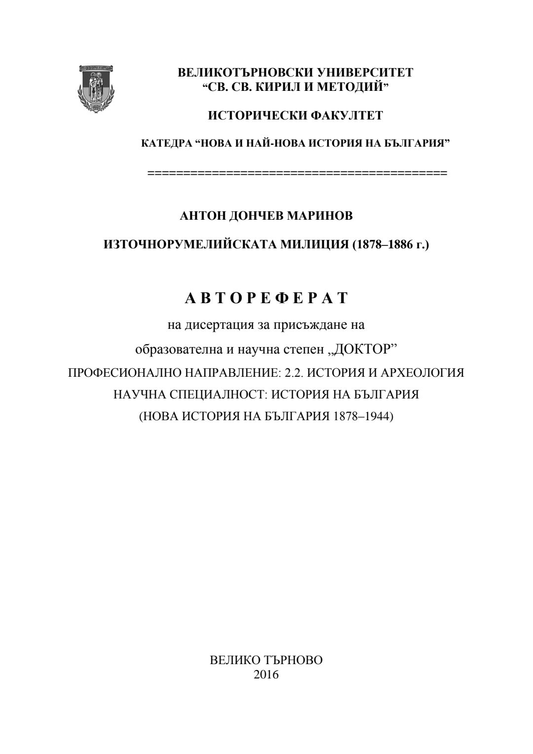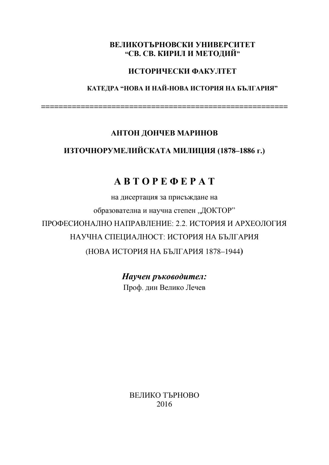 Източнорумелийската милиция (1878 - 1886 г.) : Автореферат / Антон Дончев Маринов ; Науч. ръководител Велико Лечев