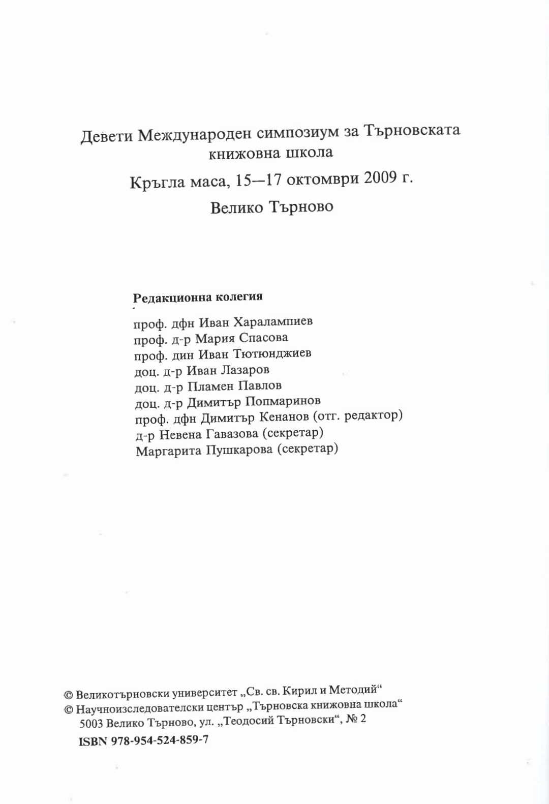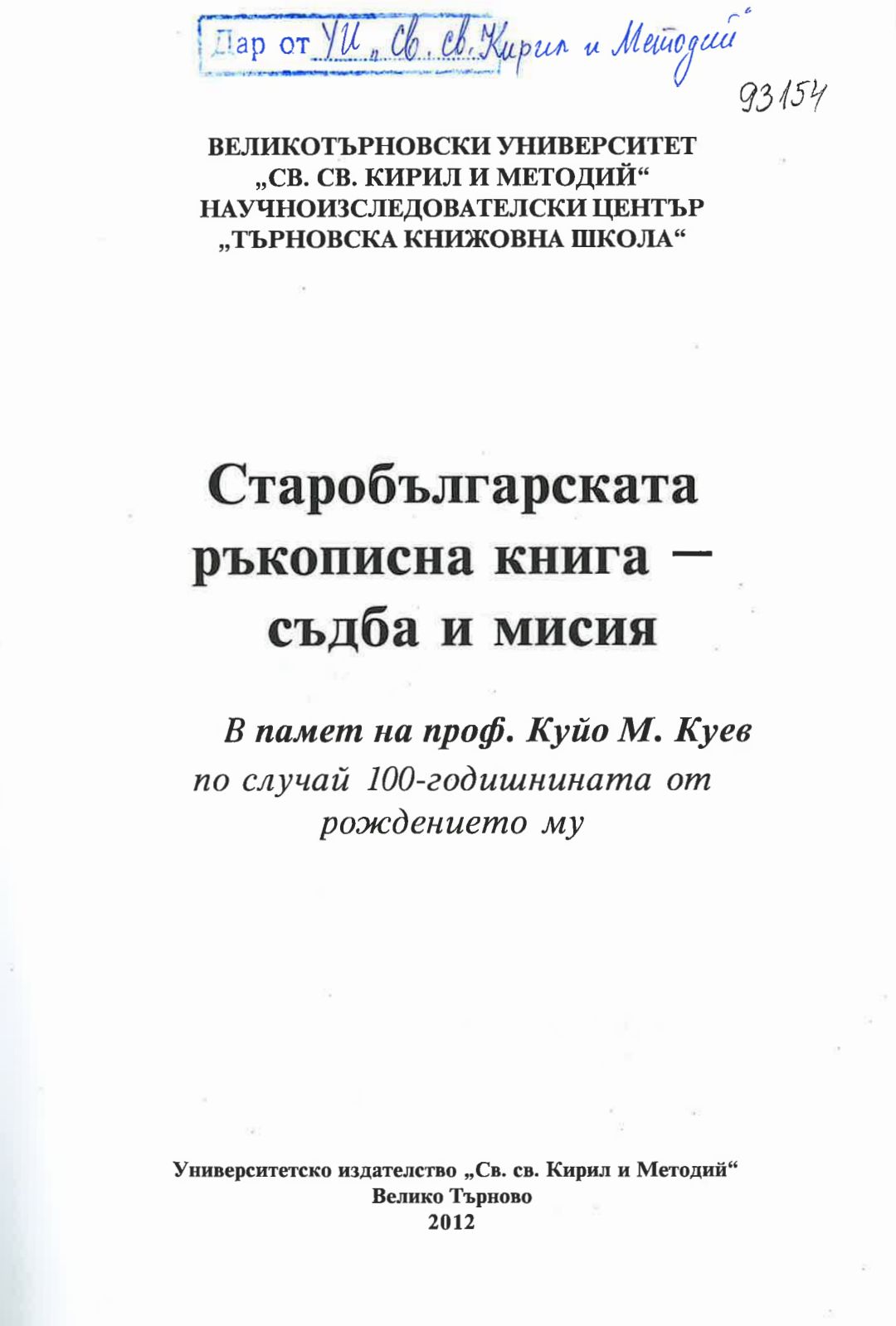 Старобългарската ръкописна книга - съдба и мисия : в памет на проф. Куйо М. Куев по случай 100-годишнината от рождението му : Девети международен симпозуим за Търновската книжовна школа, Кръгла маса 15-17 октомври 2009 г., Велико Търново : научен сборник