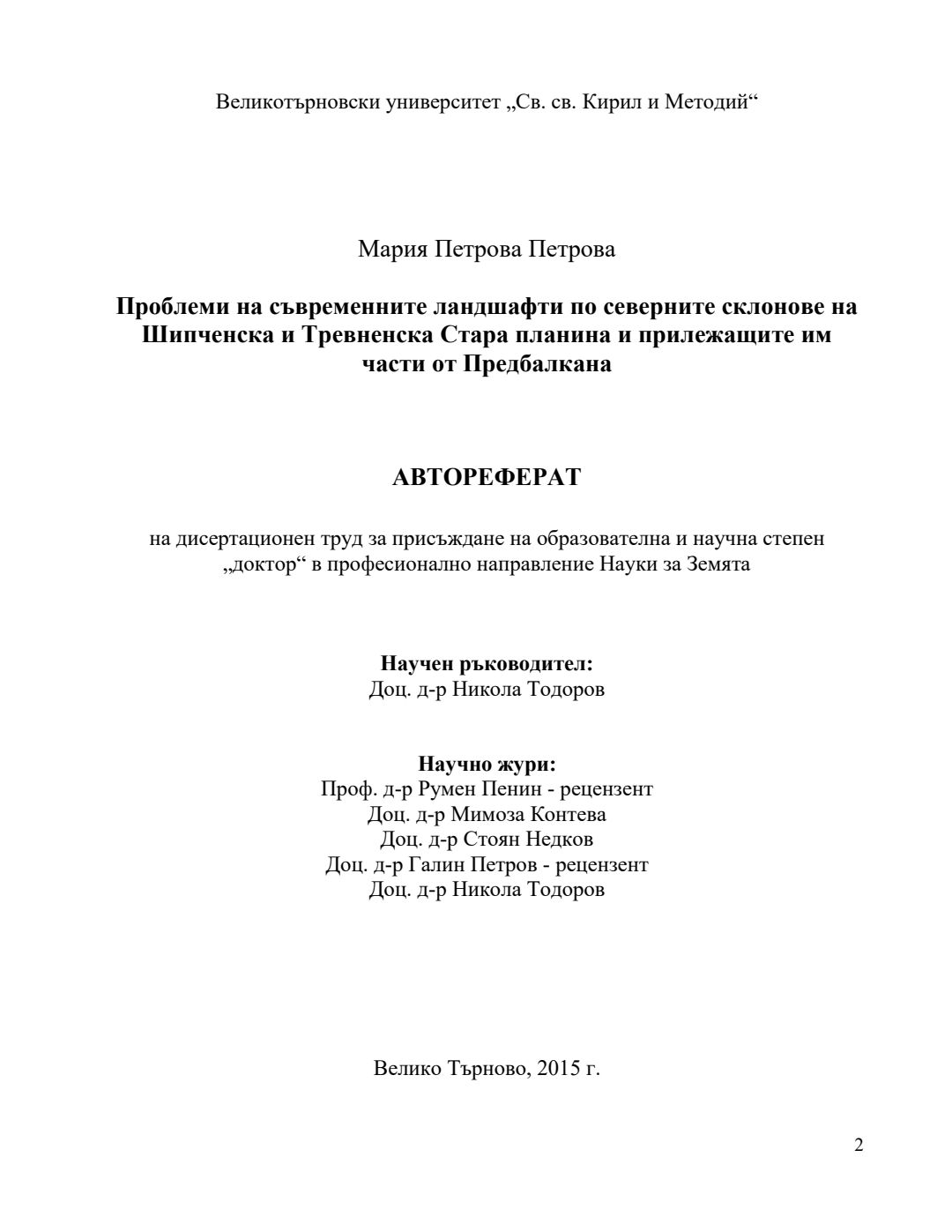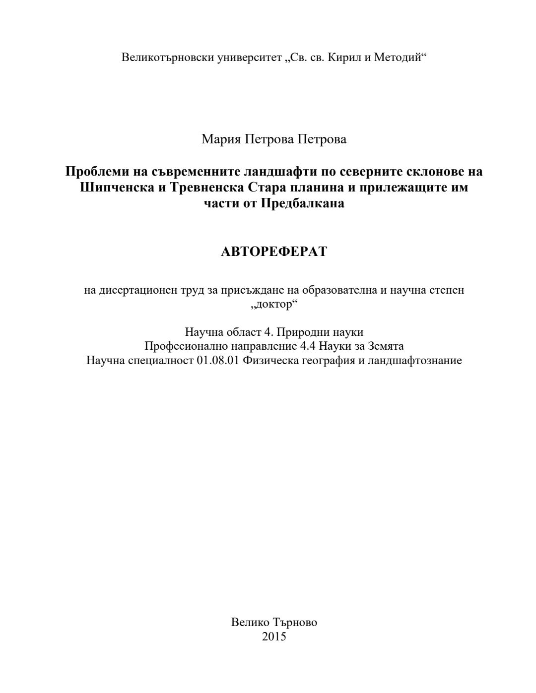 Проблеми на съвременните ландшафти по северните склонове на Шипченска и Тревненска Стара планина и прилежащите им части от Предбалкана : Автореферат / Мария Петрова Петрова ; Науч. ръководител Никола Стойчев Тодоров