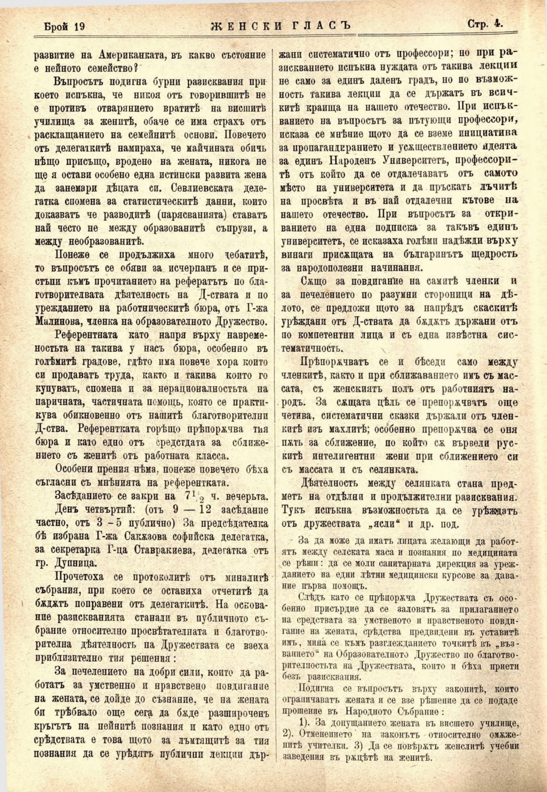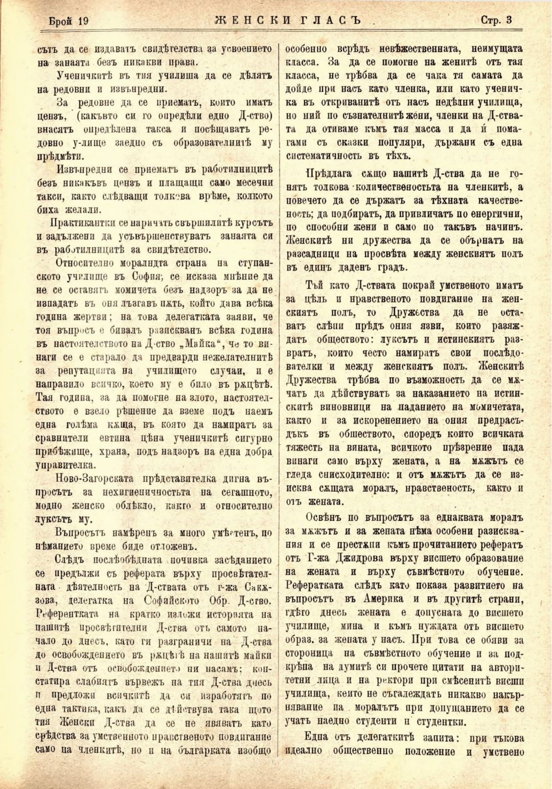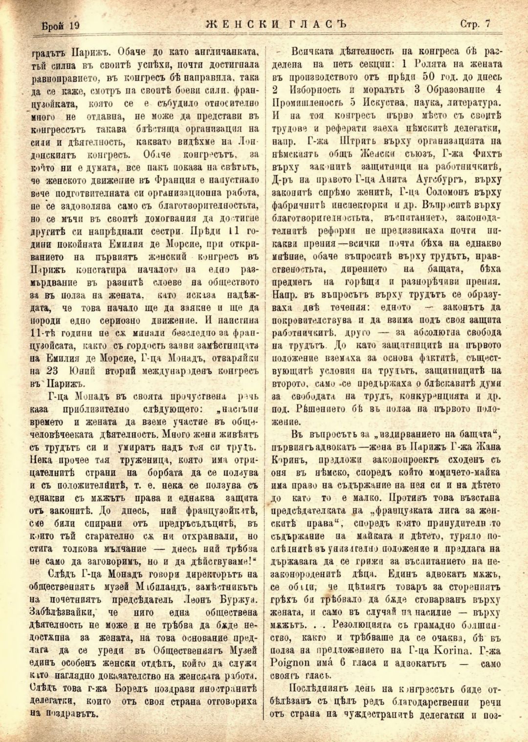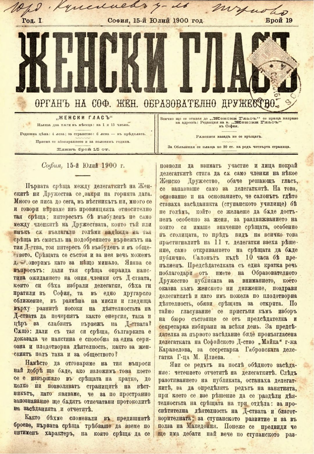 Год. 1,№ 19. Женски глас : Орган, посветен на интересите на жената