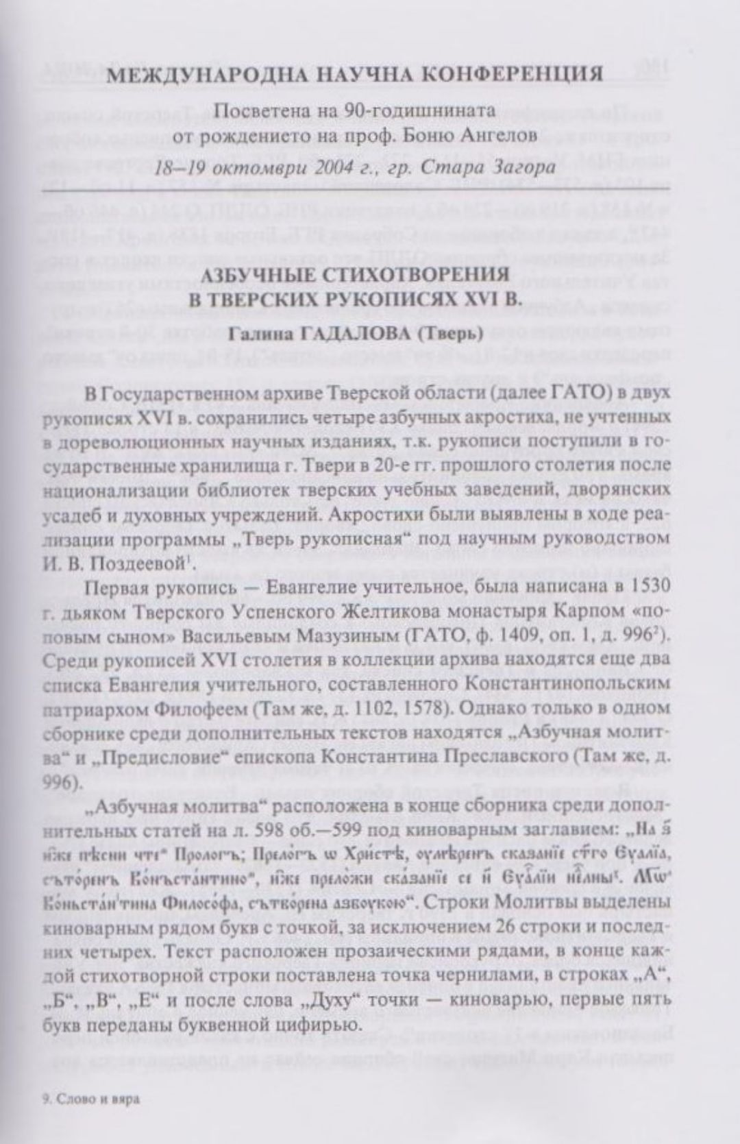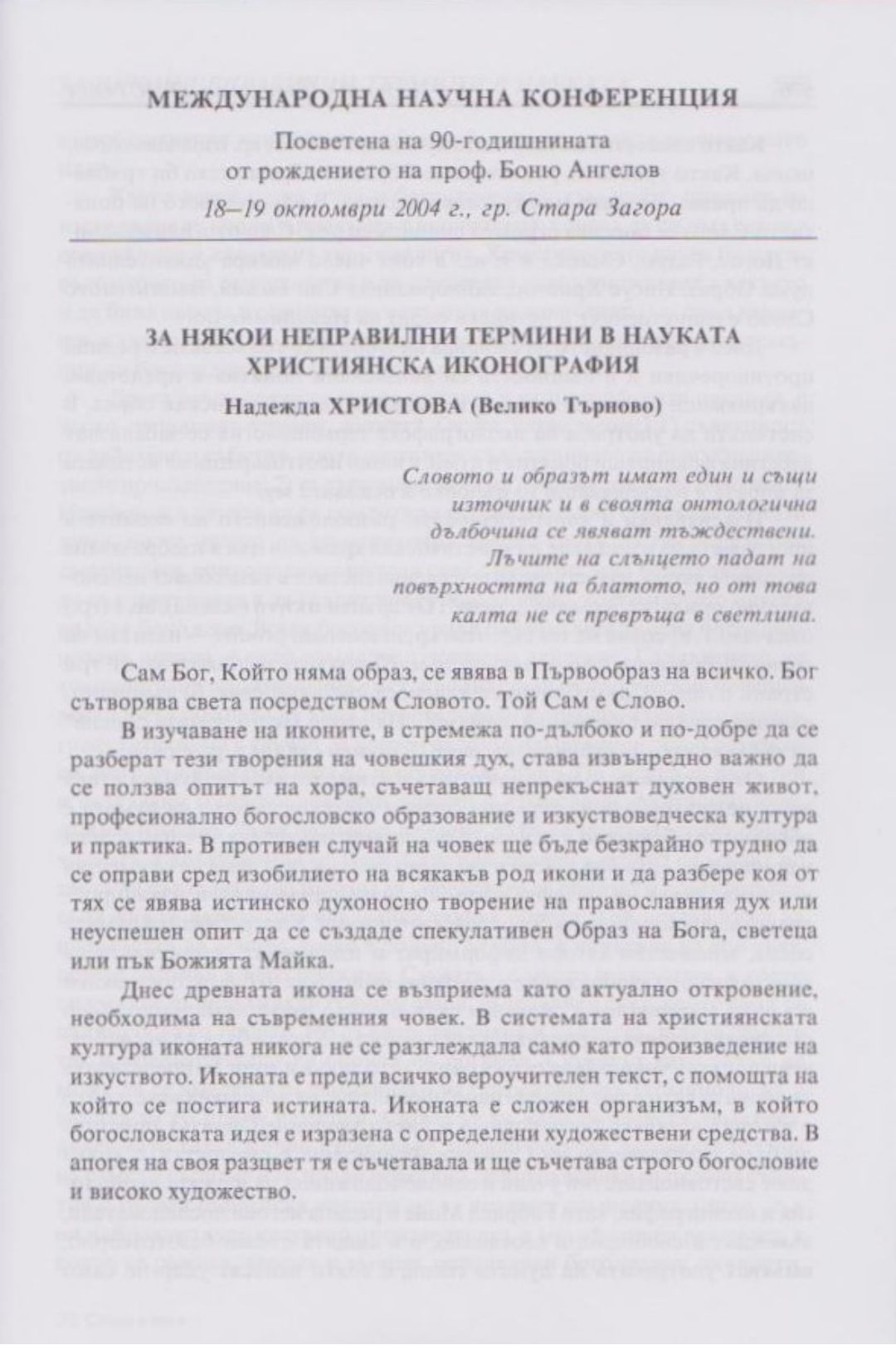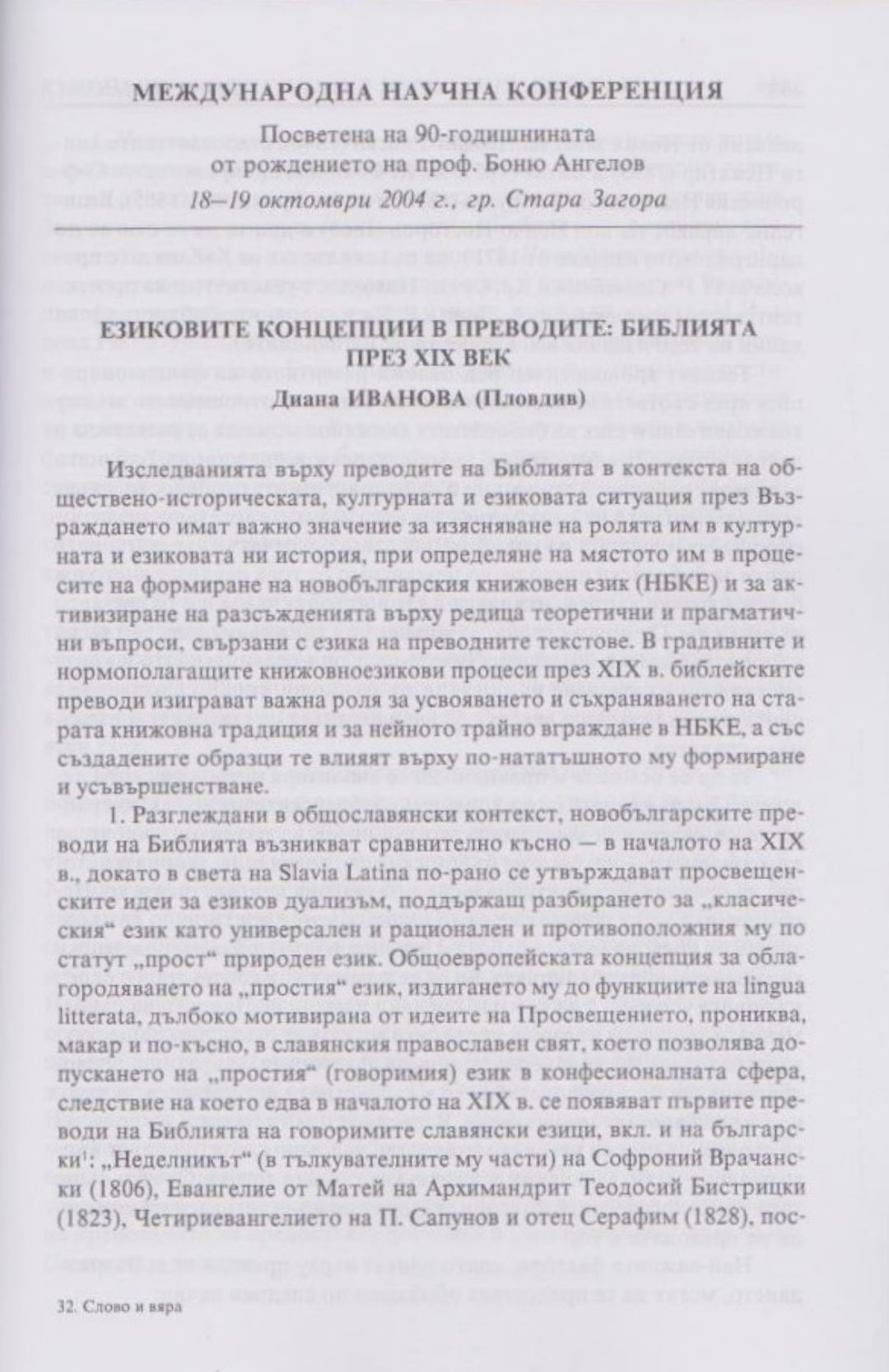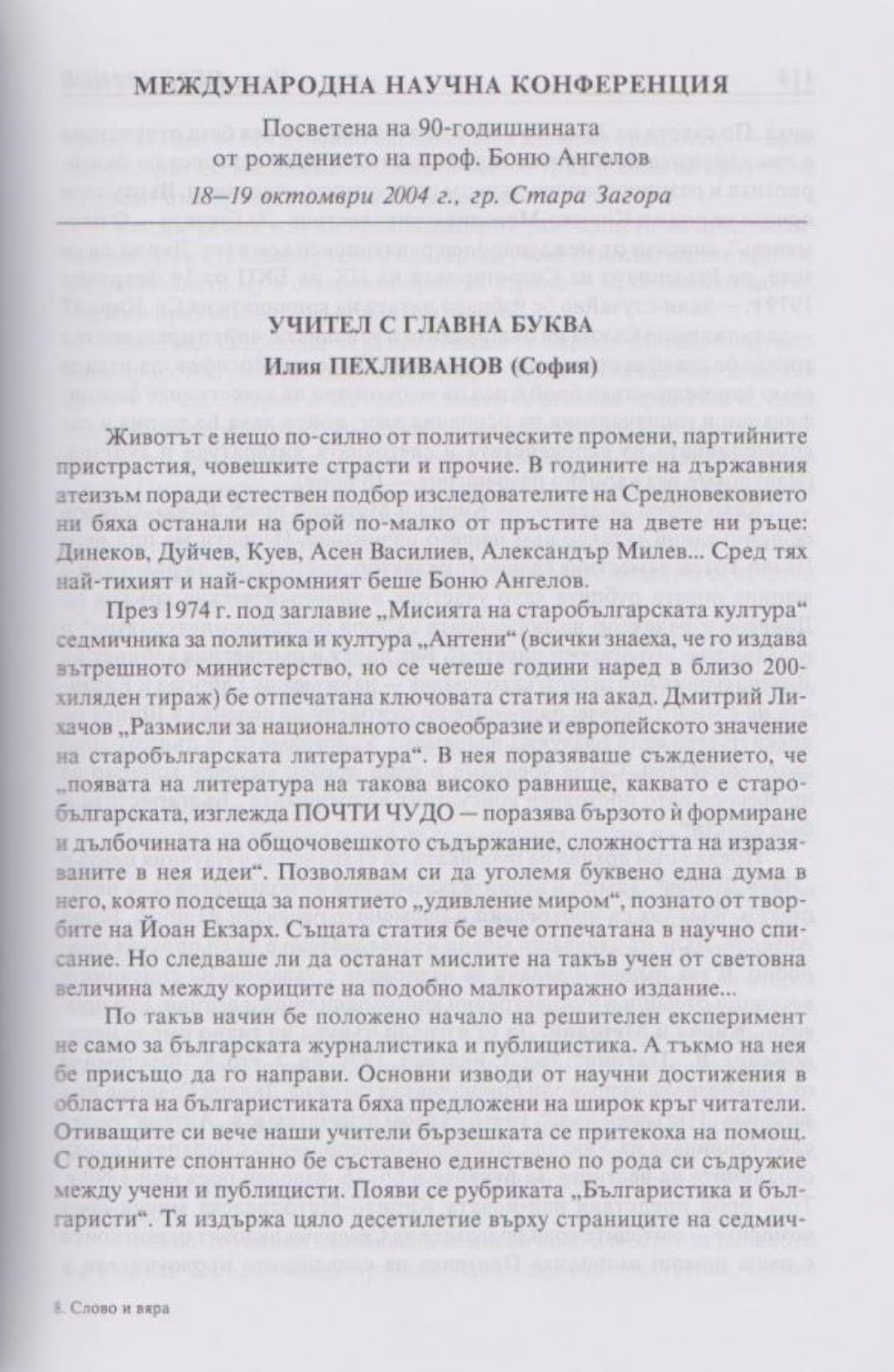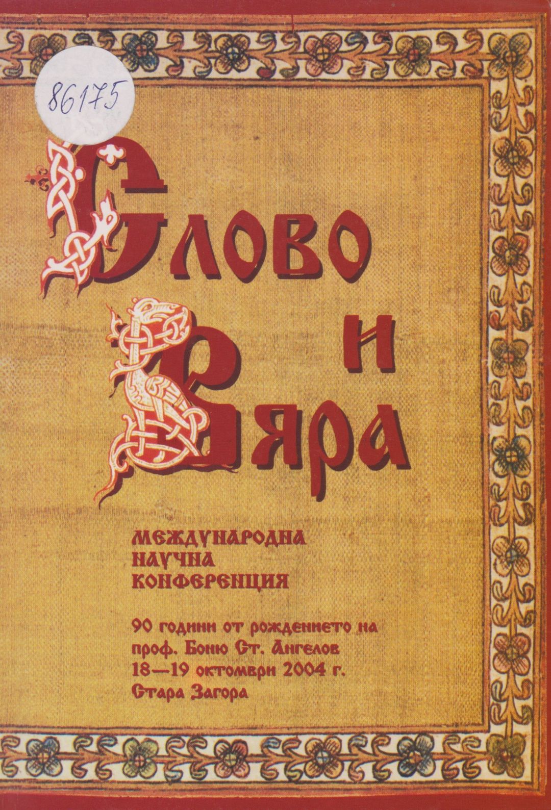 Слово и вяра : Международна научна конференция, посветена на 90-тодишнината от рождението на проф. Боню Ст. Ангелов : 18-19 октомври 2004 г., Стара Загора