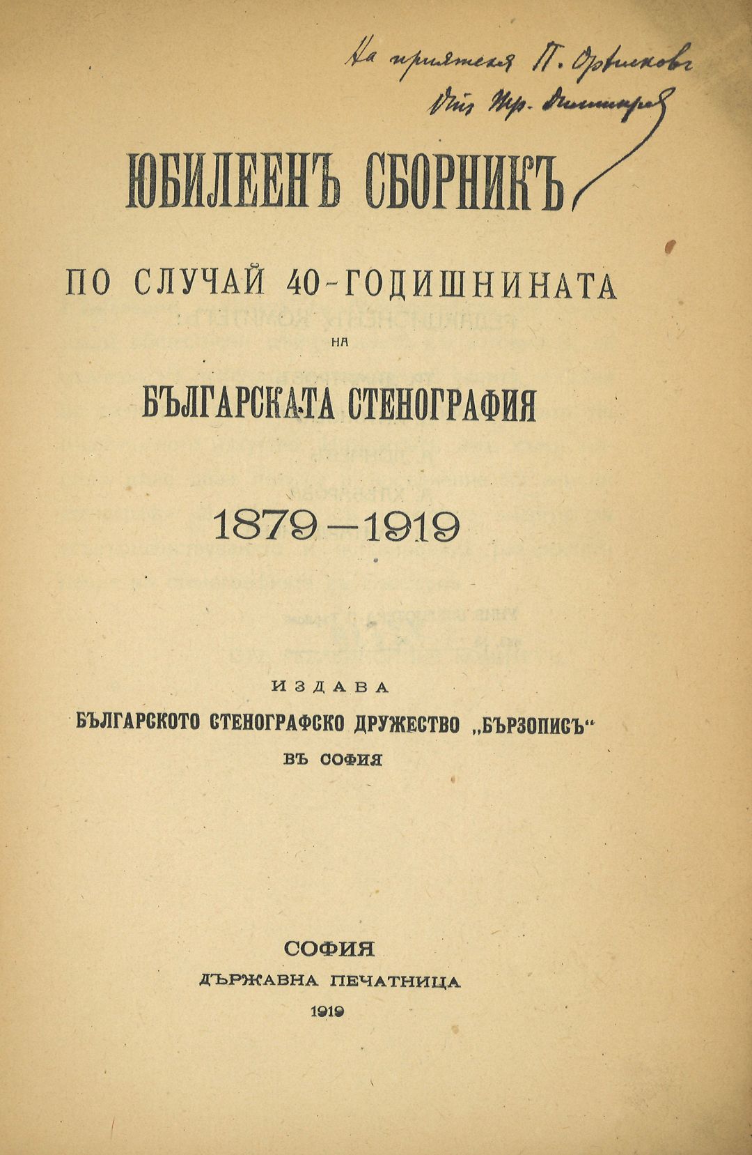 Юбилеен сборник по случай 40-годишнината на българската стенография : (1875-1919). - София : Държ. печ., 1919. - 91 с. : с ил. ; 23 см.
