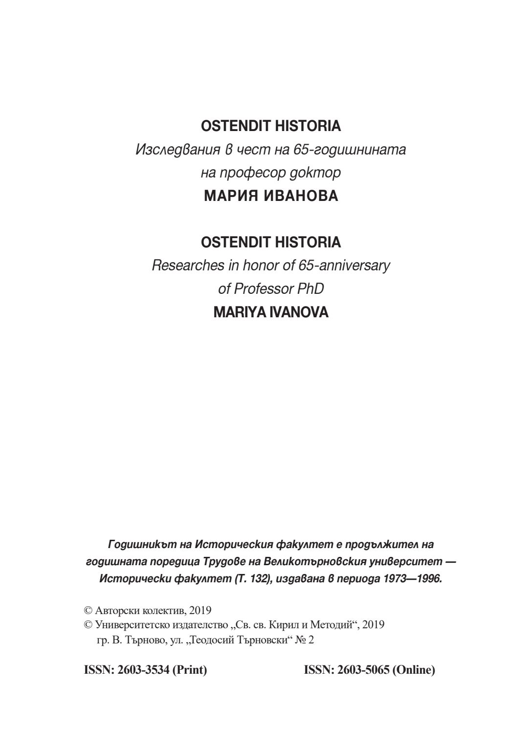 Год. III (XXXV). Том 3. Кн.1. Годишник на Историческия факултет на Великотърновския университет "Св. св. Кирил и Методий" = Annual of the Faculty of History of "St. Cyril and St. Methodius" University of Veliko Tarnovo Ostendit historia. Изследвания в чест на 60-годишнината на професор доктор по история Красимира Мутафова