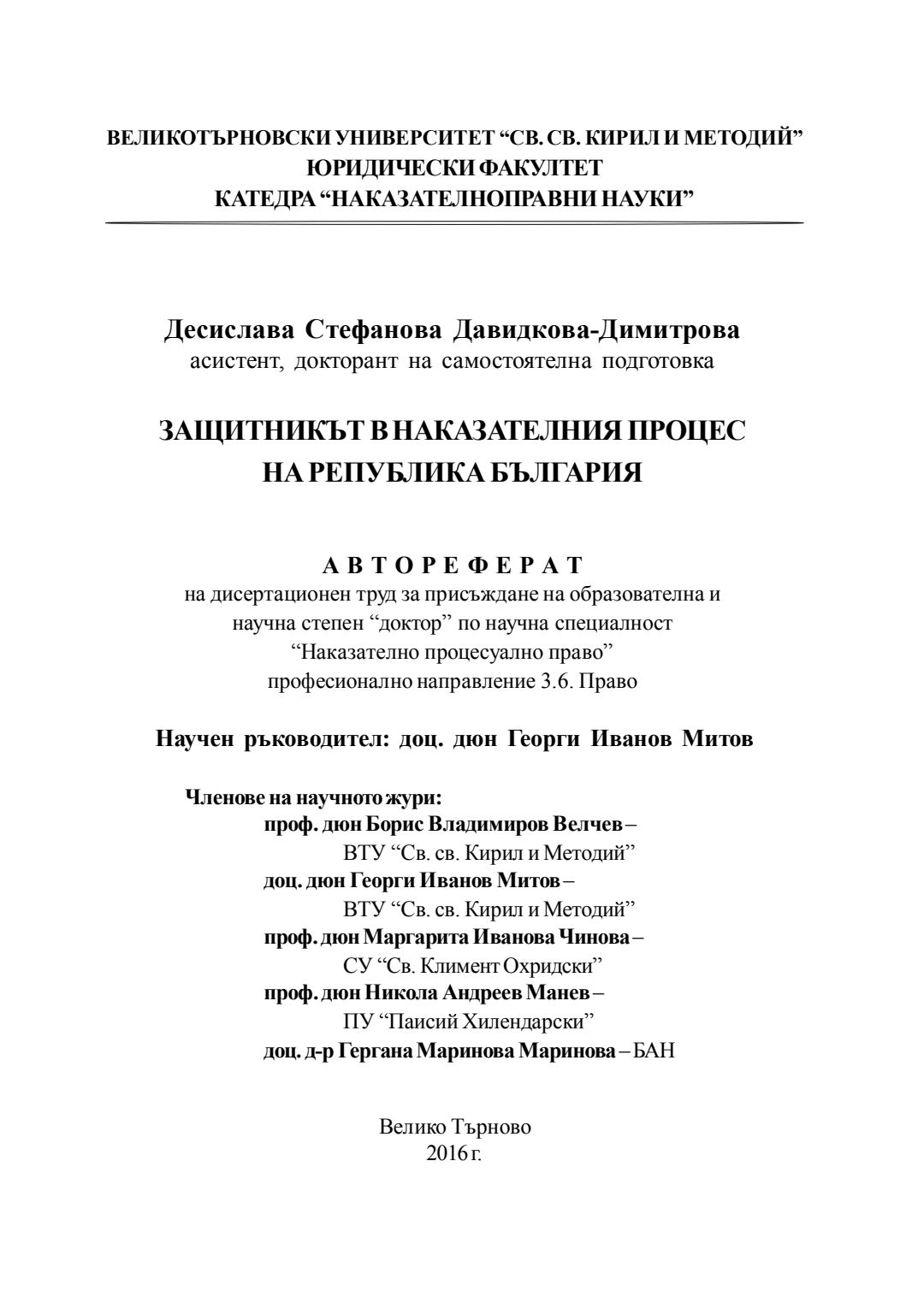 Защитникът в наказателния процес на Република България : Автореферат / Десислава Стефанова Давидкова-Димитрова ; Науч. ръководител Георги Митов