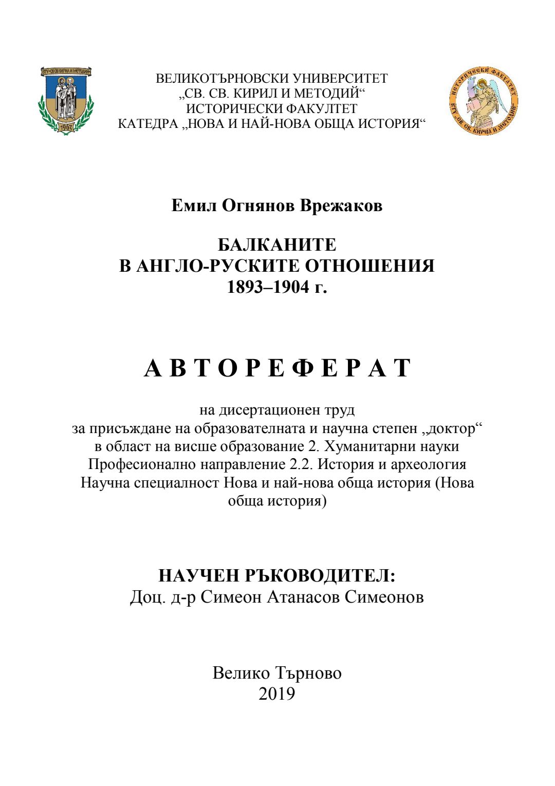 Балканите в англо-руските отношения 1893-1904 г. : Автореферат/ Емил Огнянов Врежаков ; Науч. ръководител Симеон Атанасов Симеонов