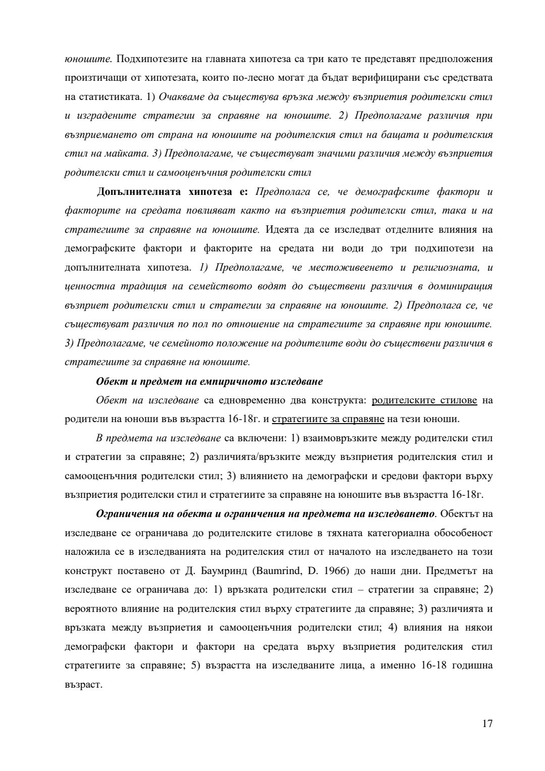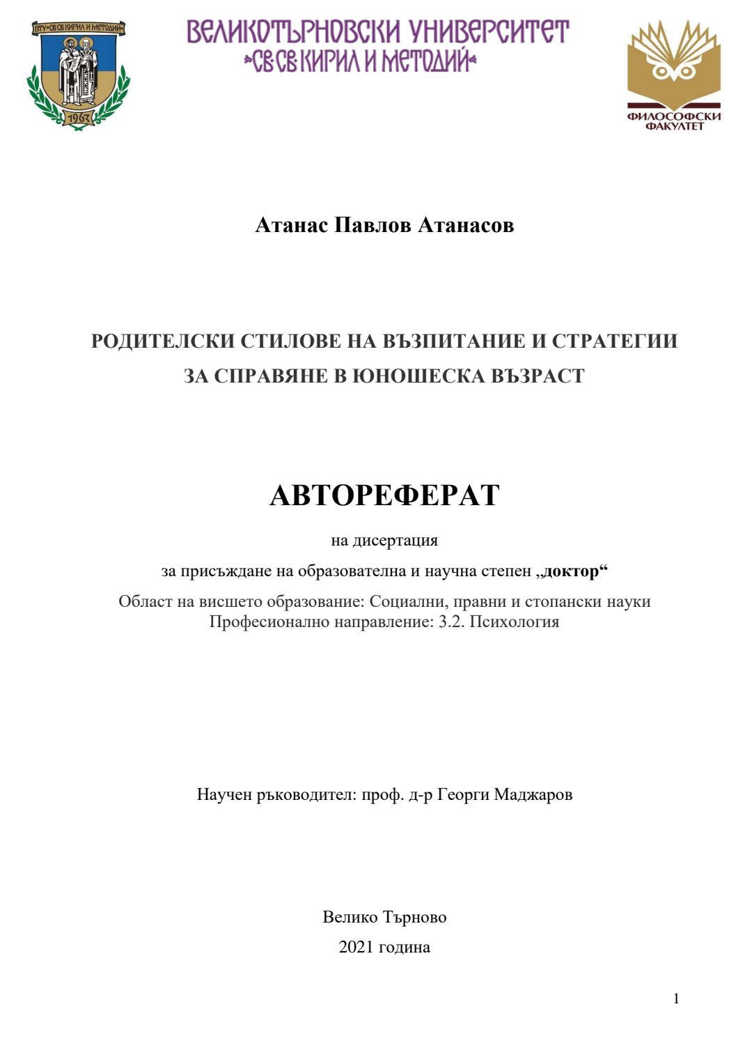Родителски стилове на възпитание и стратегии за справяне в юношеска възраст : Автореферат / Атанас Павлов Атанасов ; Науч. ръководител Георги Маджаров