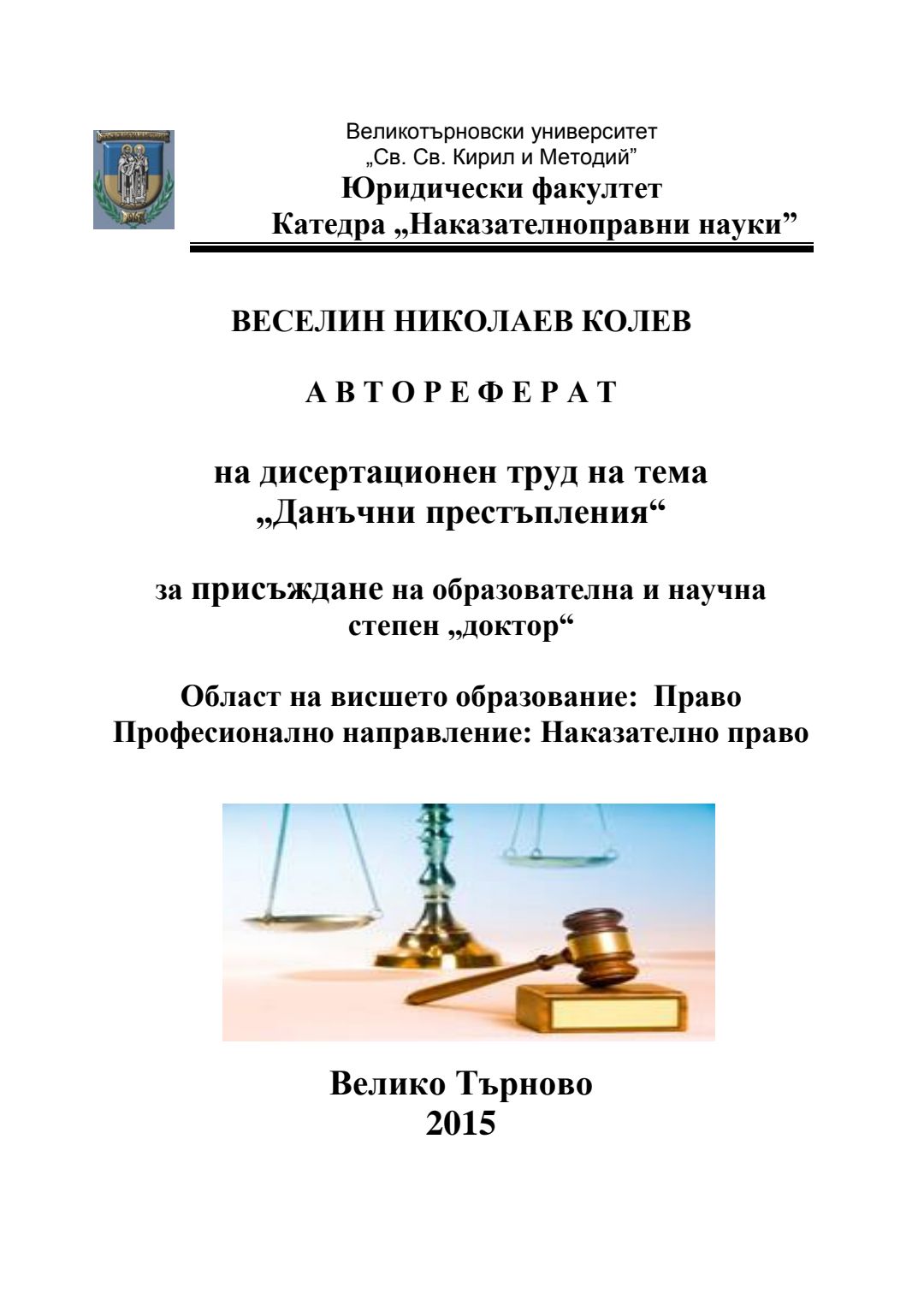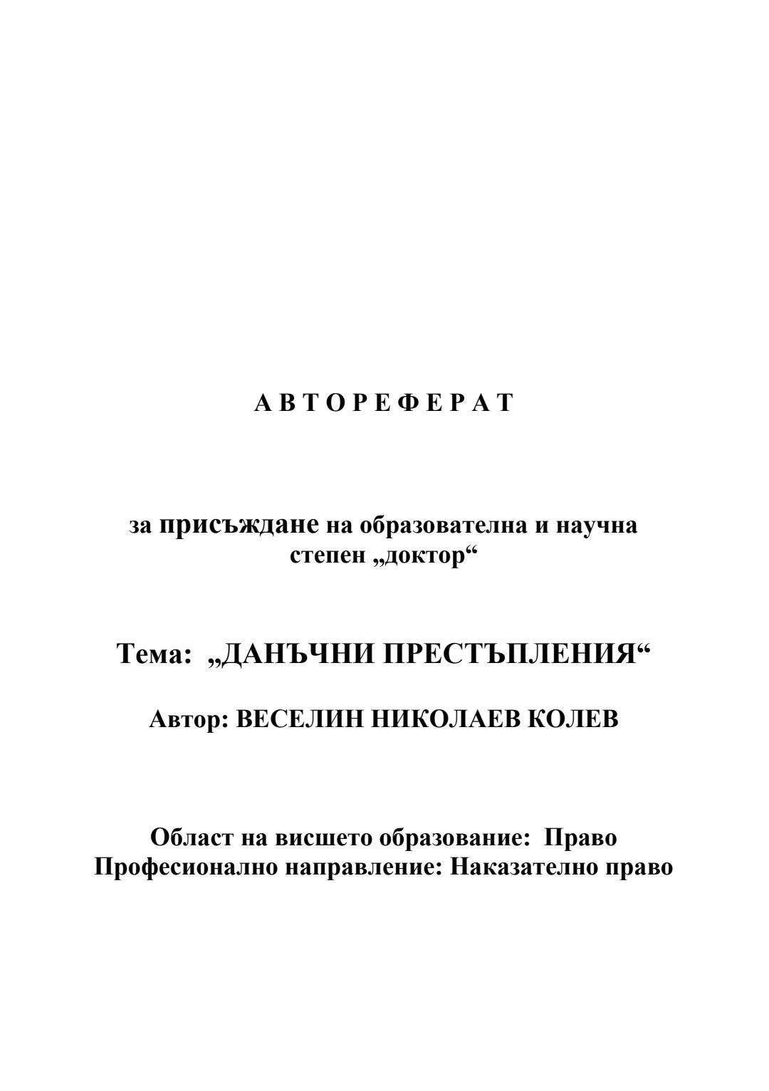 Данъчни престъпления : Автореферат / Веселин Николаев Колев ; Науч. ръководител Борис Велчев